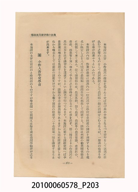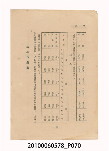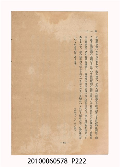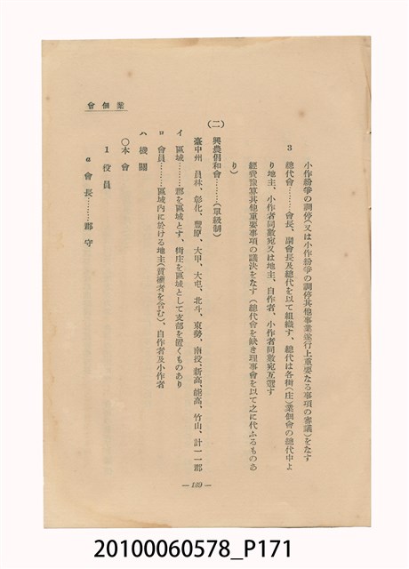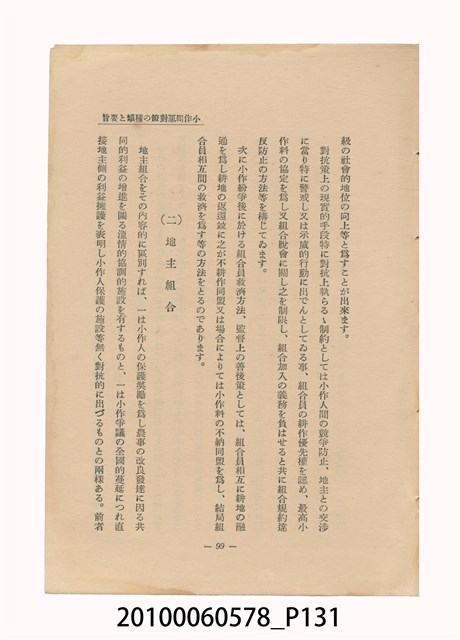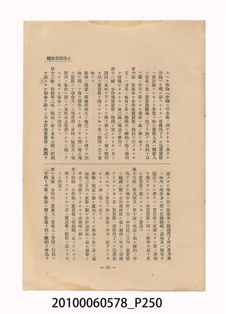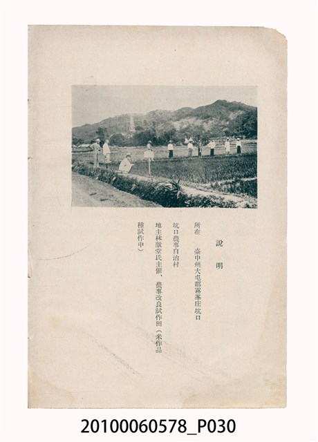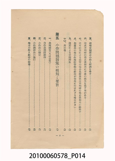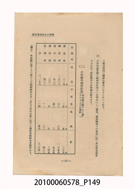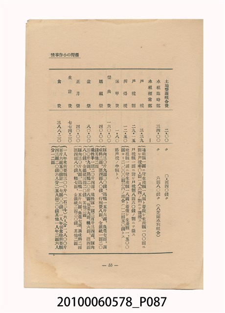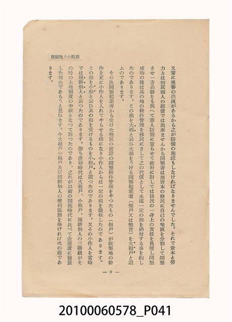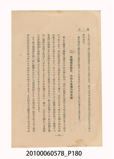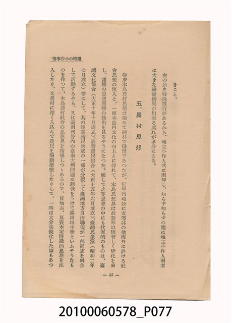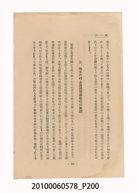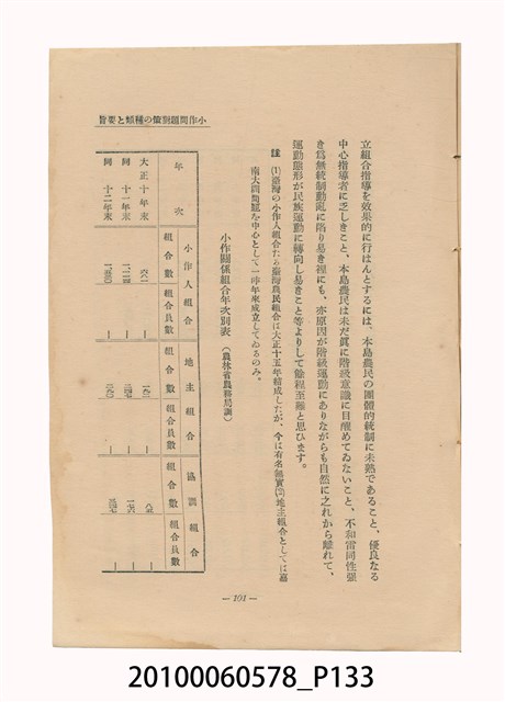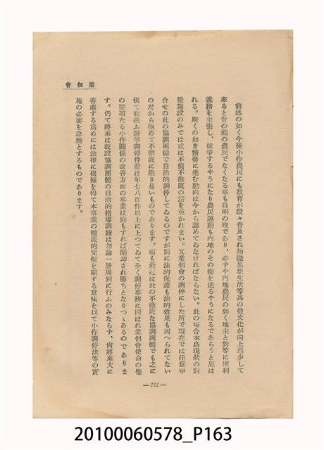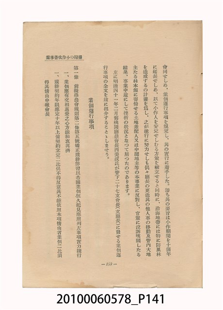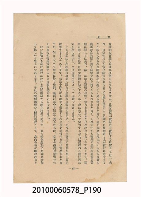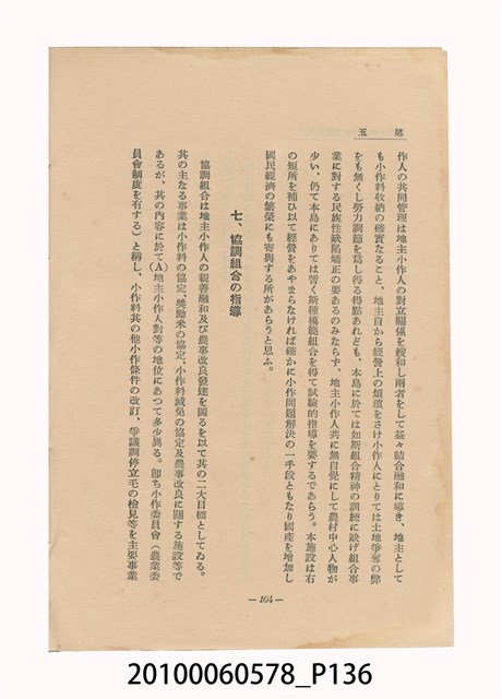本物件為臺灣的小作問題,由茂野信一和林朝卿共同編著,吉村商會出版部於昭和8年12月25日發行。「小作」為佃農、自耕農之意。該書介紹臺灣農業問題及發展,包含臺灣土地的開墾與土地制度發展,大小租戶與佃農的形成,小作農業的發展與影響等。本件與登錄號2010.015.0093藏品相同。