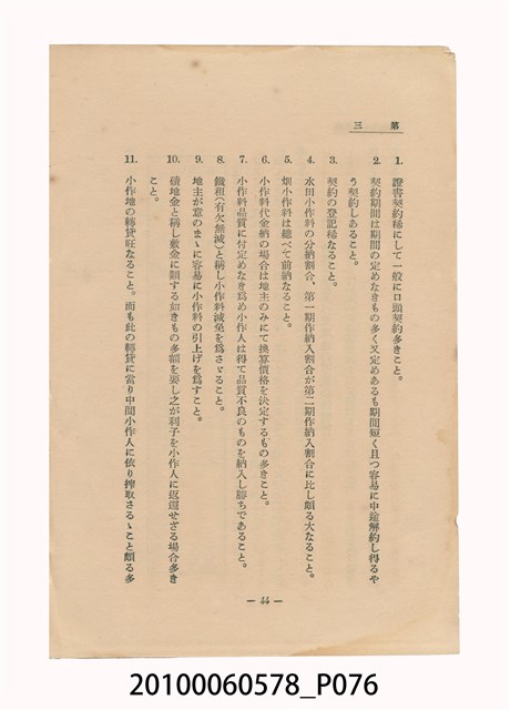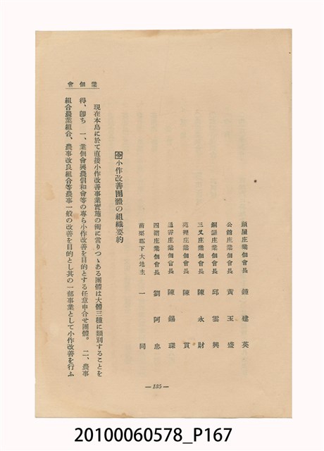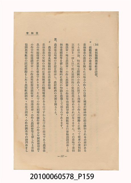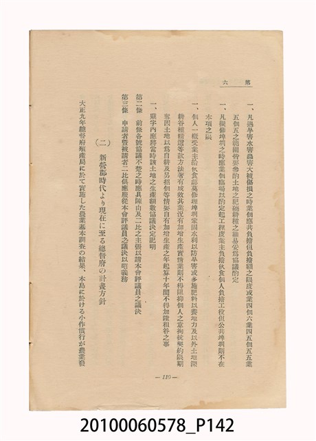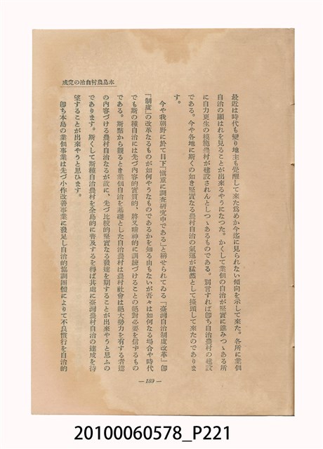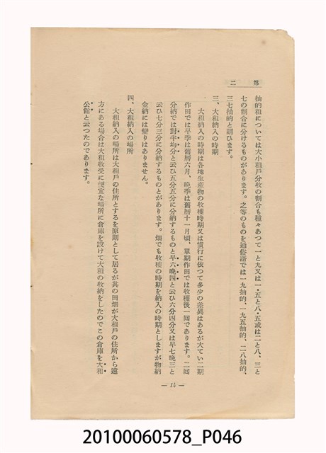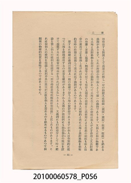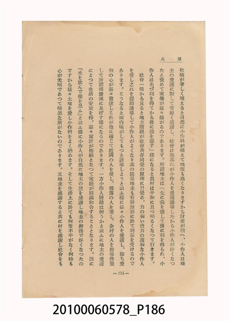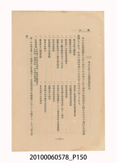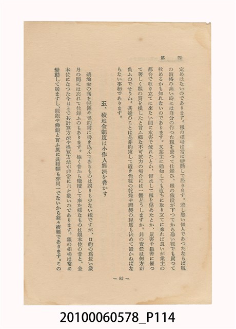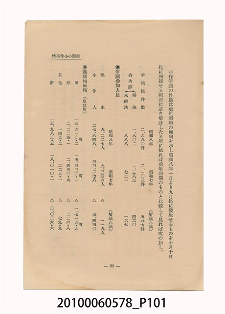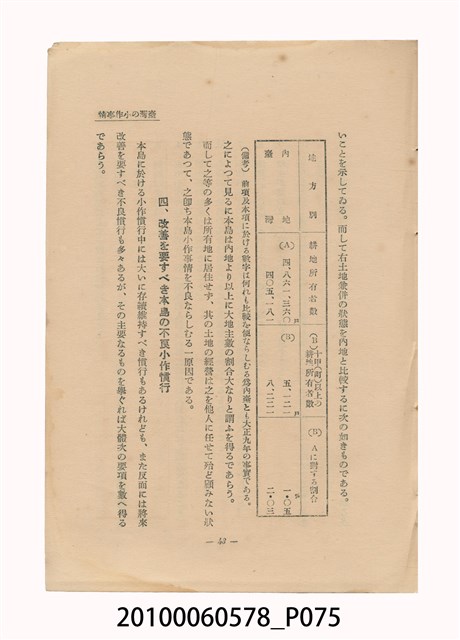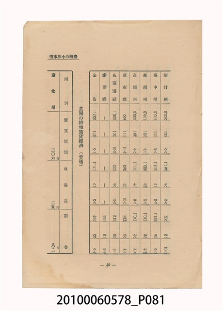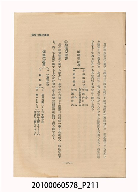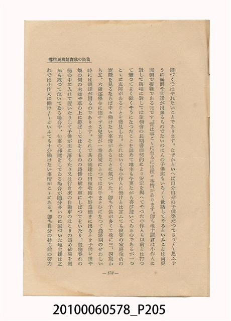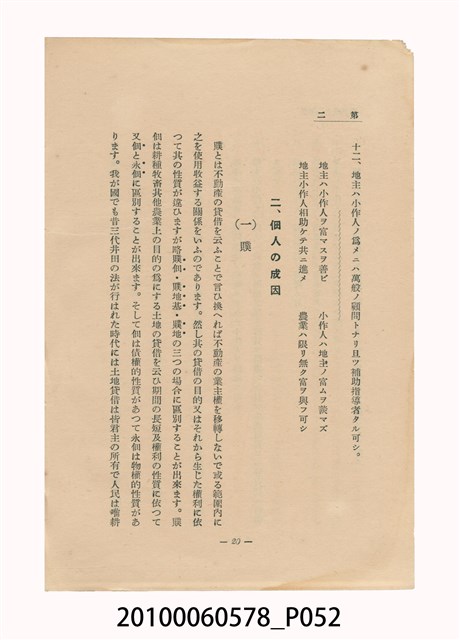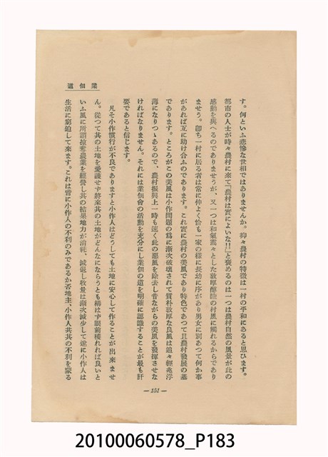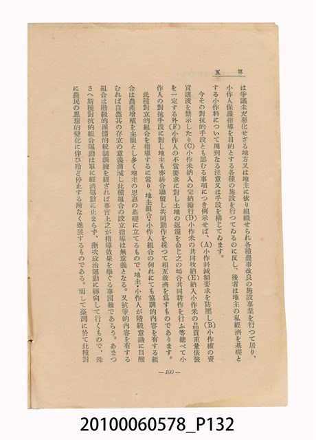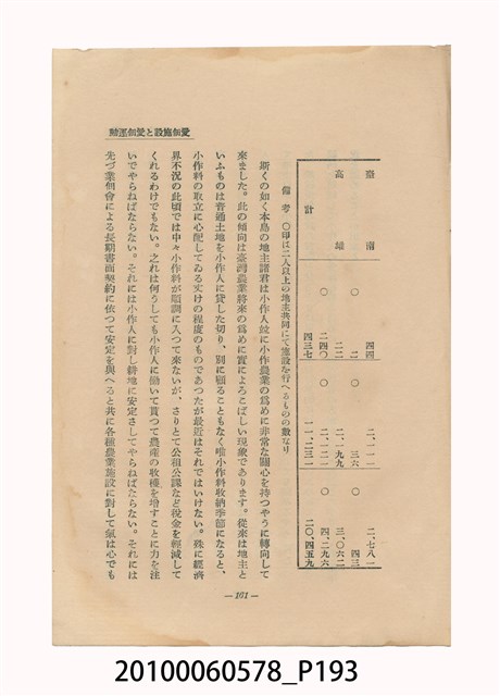 本物件為臺灣的小作問題,由茂野信一和林朝卿共同編著,吉村商會出版部於昭和8年12月25日發行。「小作」為佃農、自耕農之意。該書介紹臺灣農業問題及發展,包含臺灣土地的開墾與土地制度發展,大小租戶與佃農的形成,小作農業的發展與影響等。本件與登錄號2010.015.0093藏品相同。