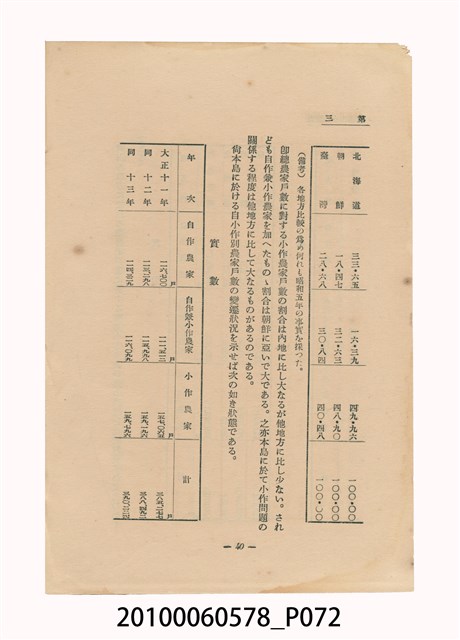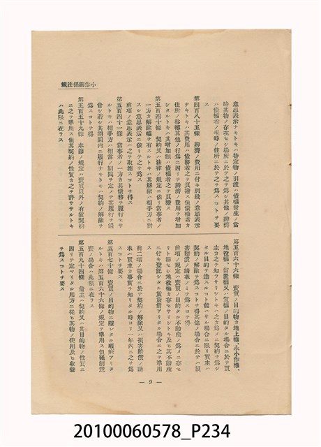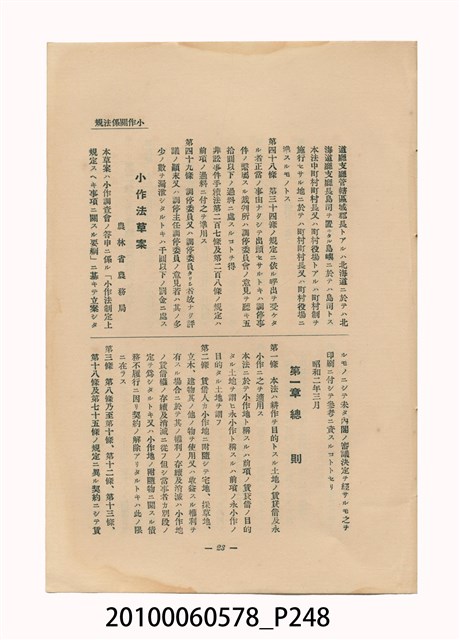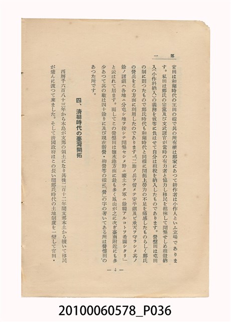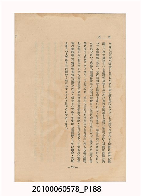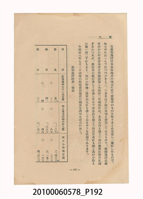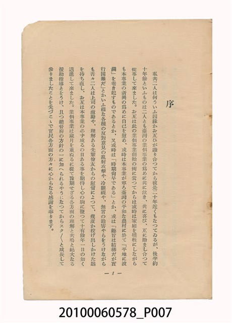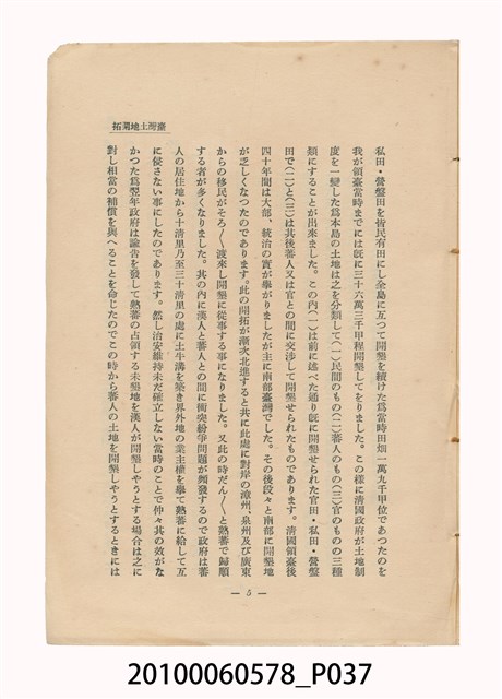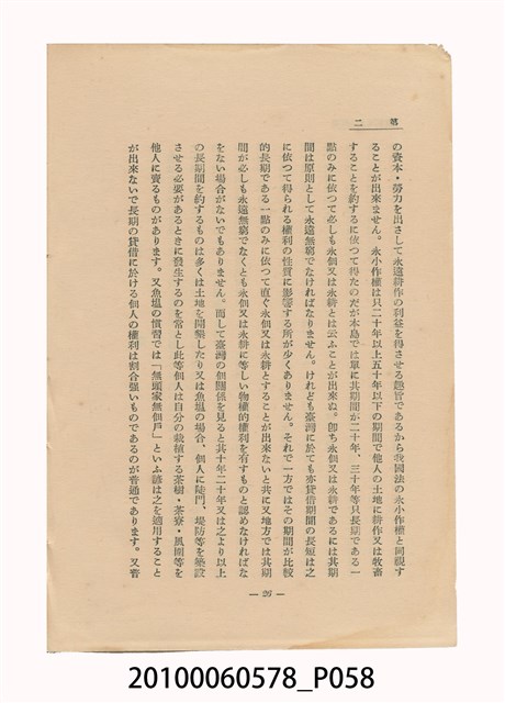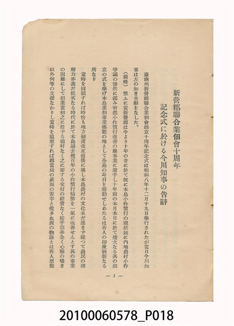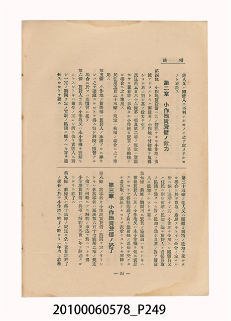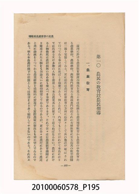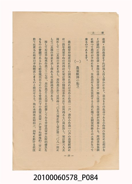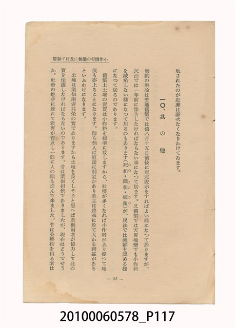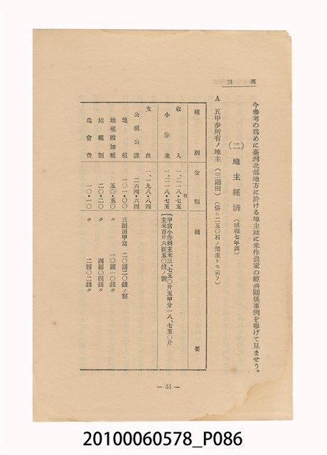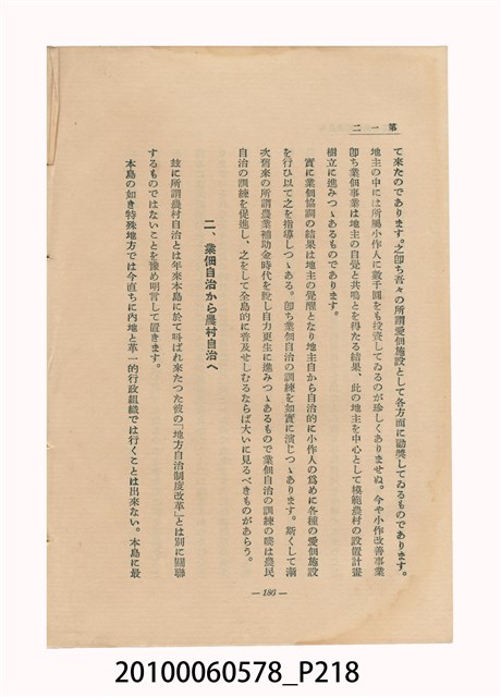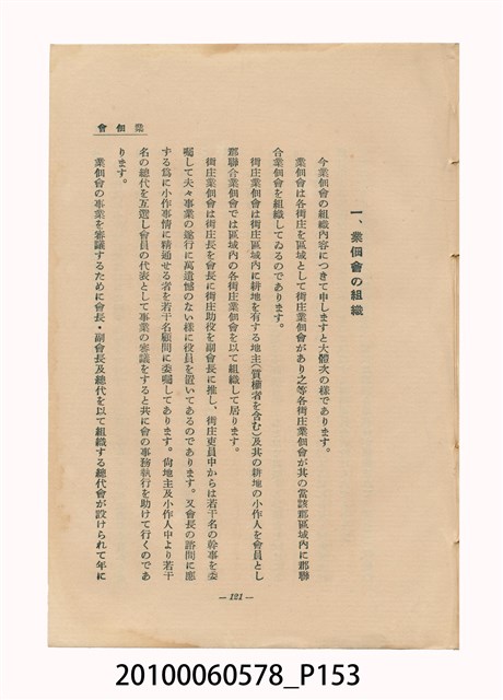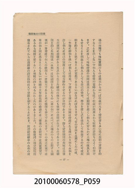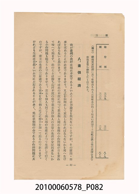 本物件為臺灣的小作問題,由茂野信一和林朝卿共同編著,吉村商會出版部於昭和8年12月25日發行。「小作」為佃農、自耕農之意。該書介紹臺灣農業問題及發展,包含臺灣土地的開墾與土地制度發展,大小租戶與佃農的形成,小作農業的發展與影響等。本件與登錄號2010.015.0093藏品相同。