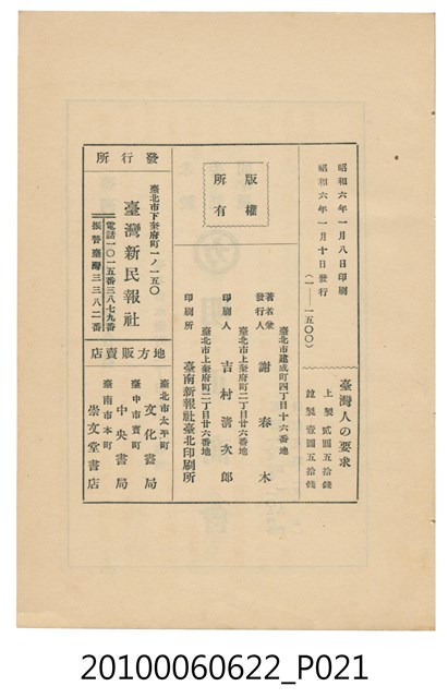 2010.006.0622 謝南光著《臺灣人の要求》