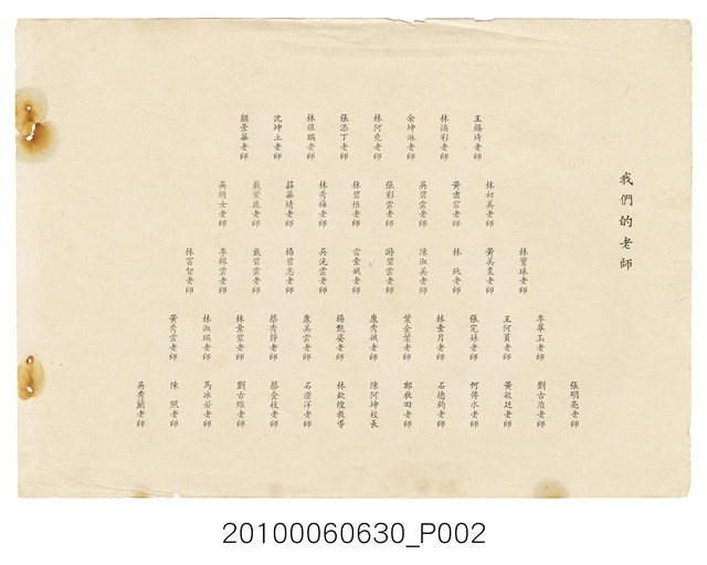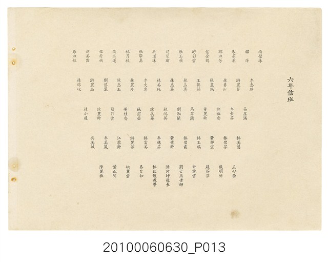 1.本文物為《宜蘭市女子國民小學第五十二屆畢業紀念冊》。此物件為一本橫式畢業紀念冊,封面邊緣有破損及汙漬,印有「宜蘭市女子國民小學」、「(第五十二屆)」、「畢業紀念冊」、「中華民國五十九年七月」等字樣。封底亦有破損及汙漬,左下角印有承印公司資料。內頁有教師名冊、校歌歌詞、校長大頭照、校門景觀照、教職員大合照、各班級學生名冊、班級生活照、班級大合照及教職員工生通訊錄。2.宜蘭國民小學創立於1918年,成立之初校名為「宜蘭女子公學校」,全部招收女子學童。1996年因應兩性和諧發展的社會現況,奉宜蘭縣政府核定男女兼收,該校全部招收女子學童之歷史傳統正式結束,此時學校亦由全國最後一所女子國小,更名為「宜蘭縣宜蘭市宜蘭國民小學」至今。