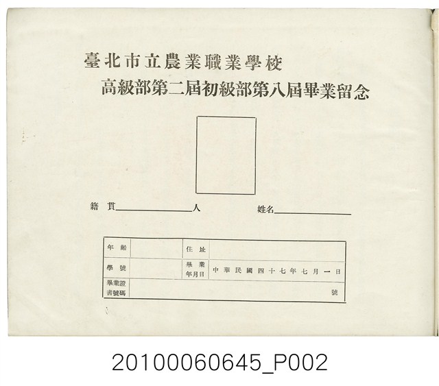 1.本物件為臺北市立農業職業學校高級部第二屆初級部第七屆之畢業紀念冊。內容有學校簡史、校歌、校旗、校長吳元正照片,吳各鏞、張義英等33位教職員姓名及照片,學生照片(含高級部高三農業製造科、初級部初三忠、初級部初三孝、初級部初三仁等152人),以及學校的生產情況、校園景色、員生通訊錄等。