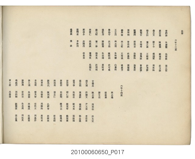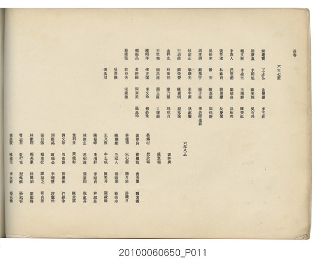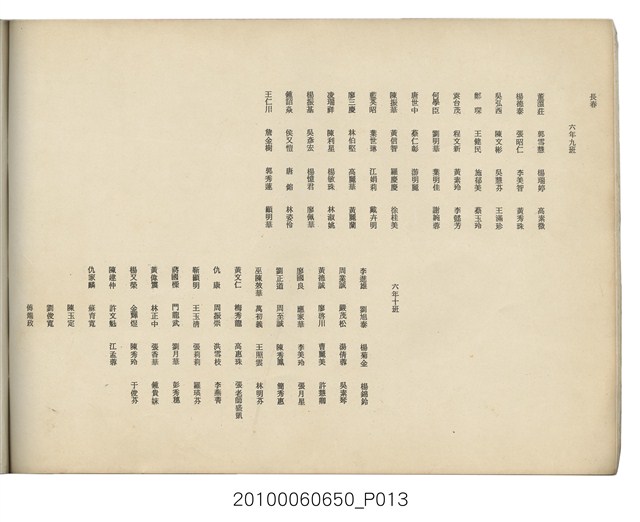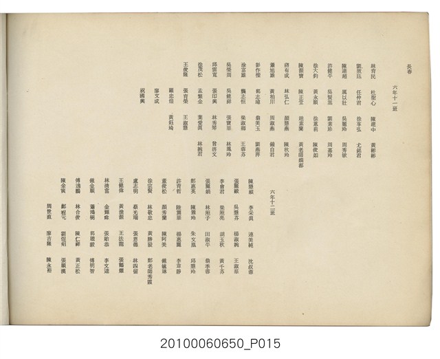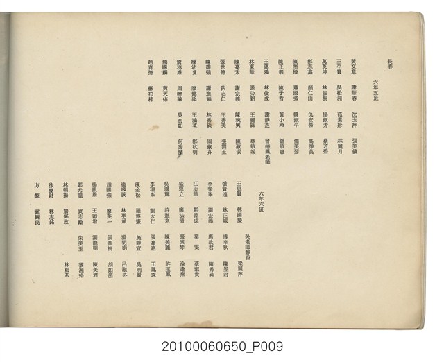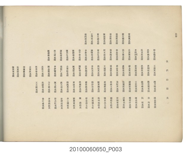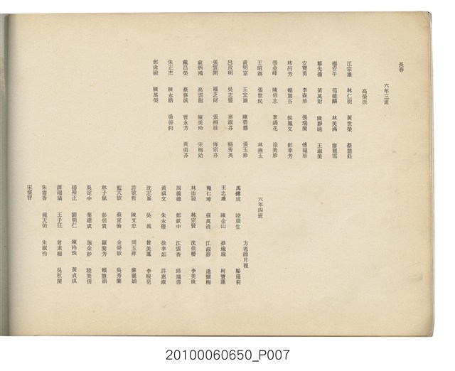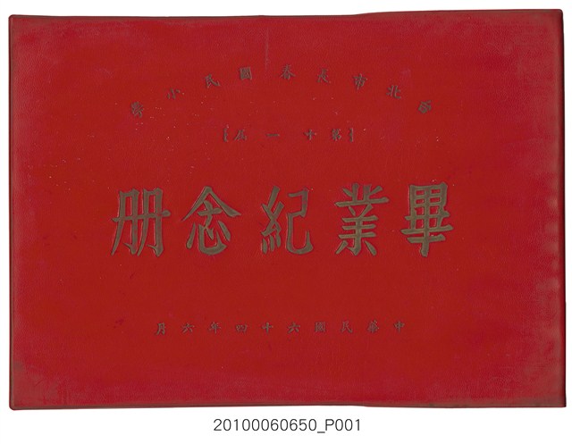 本件為臺北市長春國民小學第11屆畢業紀念冊,製作時間為民國64年(1975)6月,黑白印刷,內容包含教職員大頭照等,尾頁附有畢業生通訊錄。臺北市長春國民小學創立於1959年,最初借用長安國校、中正國校舍授課,校名為「長春國民學校」,1960年遷至現址。1968年九年國教實施,長春國校更名為「長春國民小學」。該校名沿革,如下:1959年,臺北市中山區長春國民學校;1968年,臺北市中山區長春國民小學。