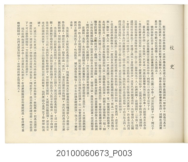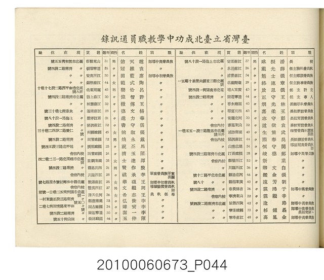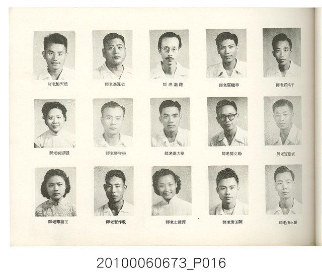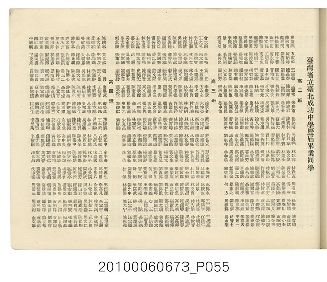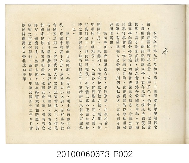 本件為臺灣省立臺北成功中學高中第9暨初中第13屆畢業紀念冊,製作時間為民國43年(1954)8月,黑白印刷。內容主要為:校史沿革、校旗、中國童子軍臺北市第二團旗、中國青年反共救國團成功中學大隊隊旗照、校長潘振球照、校園景觀照、鄭成功紀念碑照、勞動服務、校園生活、童軍活動、軍訓課、運動會、學校衛生檢查、教師及畢業生大頭照及通訊錄。臺灣省立臺北成功中學(今成功高中),其前身為1922年設立之「臺北州立臺北第二中學校」,創校初期借萬華祖師廟授課,1925年起陸續遷至現址。戰後,臺北第二中學校改稱「臺灣省立臺北第二中學」,隨後又更名為「臺灣省立臺北成功中學」。該校名沿革,如下:1922年,臺北州立臺北第二中學校;1945年,臺灣省立臺北第二中學;1946年,臺灣省立臺北成功中學;1967年,臺北市立成功高級中學。