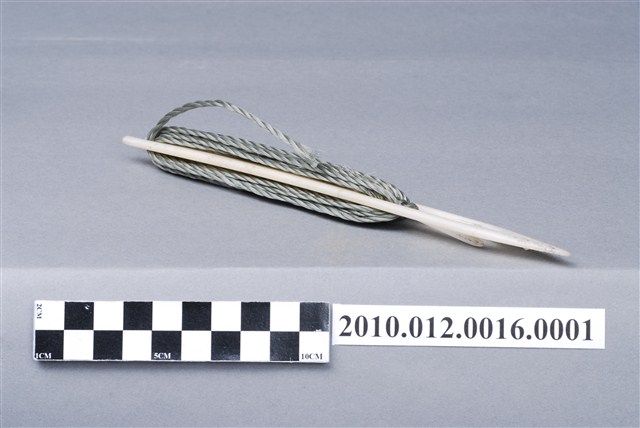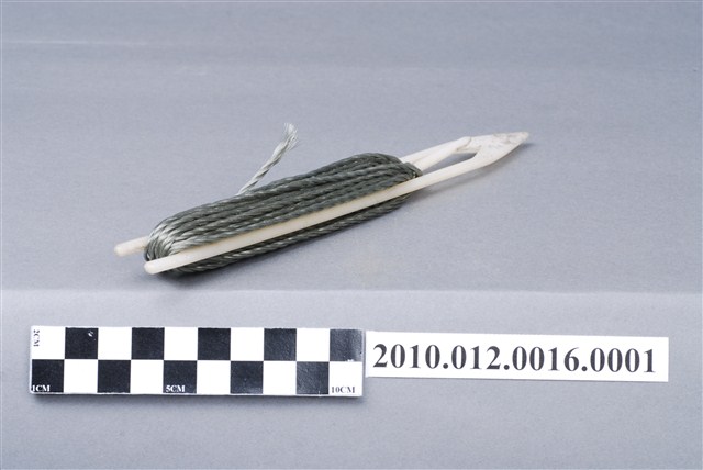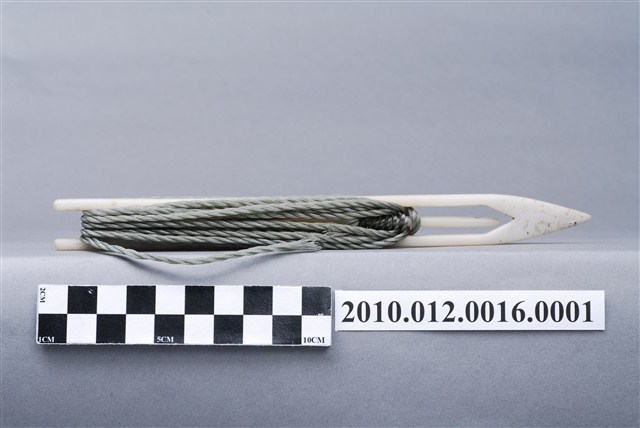 本物件為漁網結網器/補網針,為梭狀,上纏有漁線,除可結網外亦作為修補漁網之用途,其材質有竹、木、鐵、銅、塑膠或複合材質,可略分為大號(約20-50cm,用來封漁網及修補粗線網)、小號(10cm以下,主要用來修補漁網 )及介於其中的中號,中號由於大小適中,主要用來織各種漁網,結網器為織漁網的重要工具。本件長19.2cm。