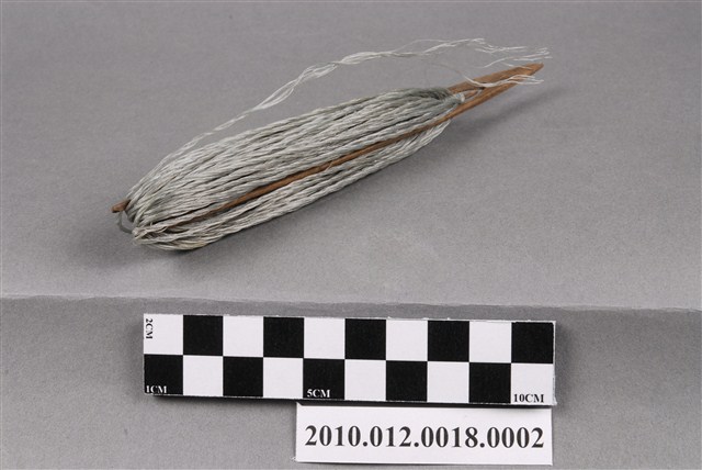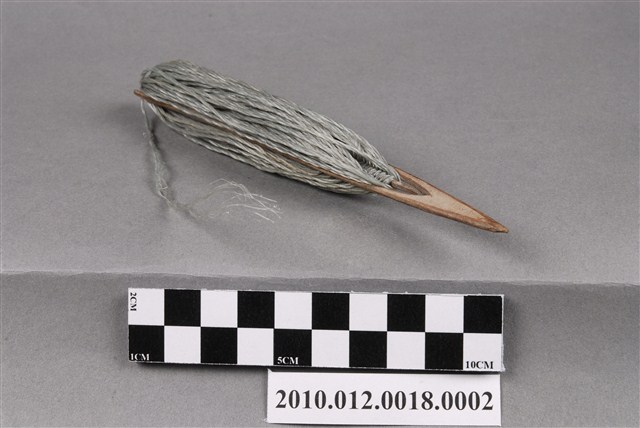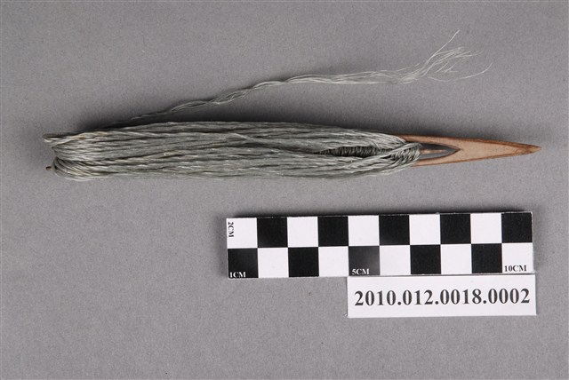 本物件為漁網結網器/補網針,為梭狀,上纏有綠色漁線,除可結網外亦作為修補漁網之用途,其材質有竹、木、鐵、銅、塑膠或複合材質,可略分為大號(約20-50cm,用來封漁網及修補粗線網)、小號(10cm以下,主要用來修補漁網)及介於其中的中號,中號由於大小適中,主要用來織各種漁網,結網器為織漁網的重要工具。本件長16.2cm。