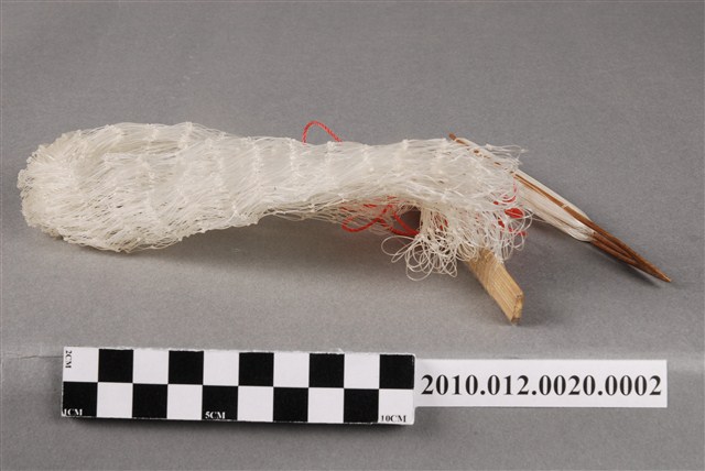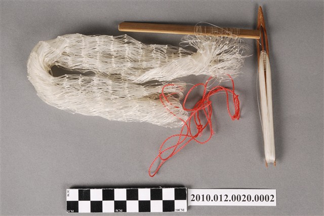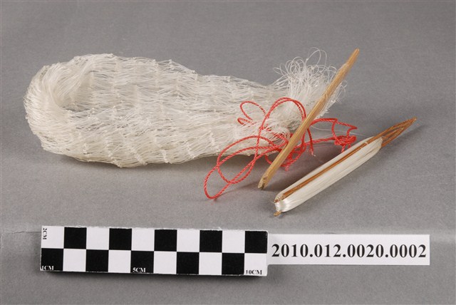 本物件為漁網結網器/補網針,為梭狀,上纏有透明漁線,除可結網外亦作為修補漁網之用途,其材質有竹、木、鐵、銅、塑膠或複合材質,可略分為大號(約20-50cm,用來封漁網及修補粗線網)、小號(10cm以下,主要用來修補漁網)及介於其中的中號,中號由於大小適中,主要用來織各種漁網,結網器為織漁網的重要工具。另有漁網一張。