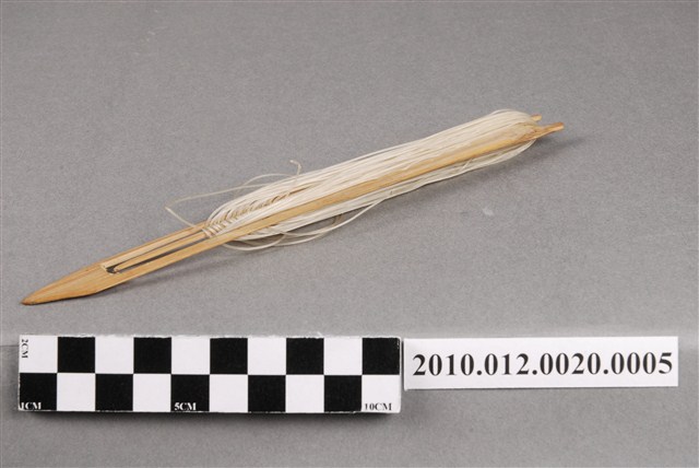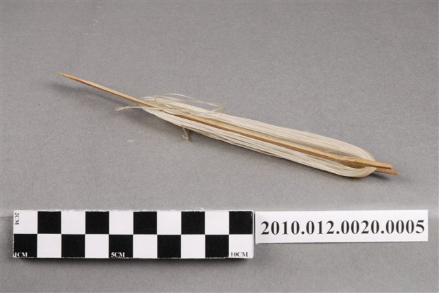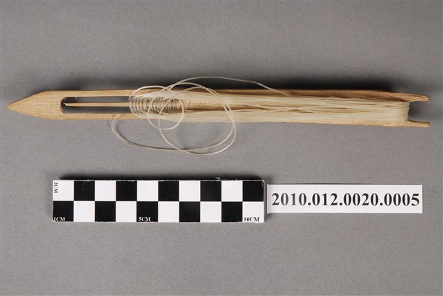 本物件為漁網結網器/補網針,為梭狀,上纏有透明漁線,除可結網外亦作為修補漁網之用途,其材質有竹、木、鐵、銅、塑膠或複合材質,可略分為大號(約20-50cm,用來封漁網及修補粗線網)、小號(10cm以下,主要用來修補漁網)及介於其中的中號,中號由於大小適中,主要用來織各種漁網,結網器為織漁網的重要工具。本件長19.9cm。