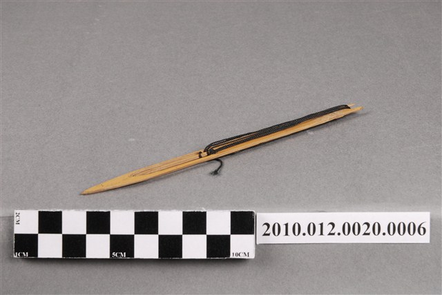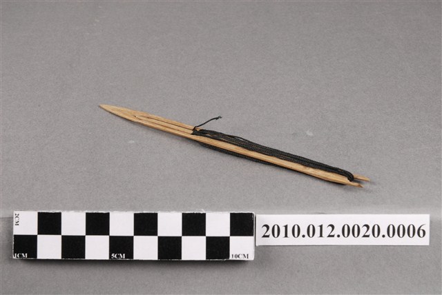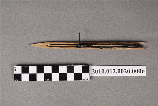 本物件為漁網結網器/補網針,為梭狀,上纏有黑色漁線,除可結網外亦作為修補漁網之用途,其材質有竹、木、鐵、銅、塑膠或複合材質,可略分為大號(約20-50cm,用來封漁網及修補粗線網)、小號(10cm以下,主要用來修補漁網)及介於其中的中號,中號由於大小適中,主要用來織各種漁網,結網器為織漁網的重要工具。本件長15.6cm。