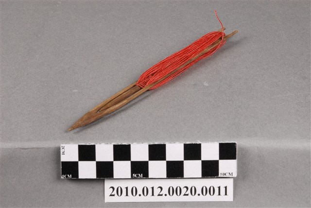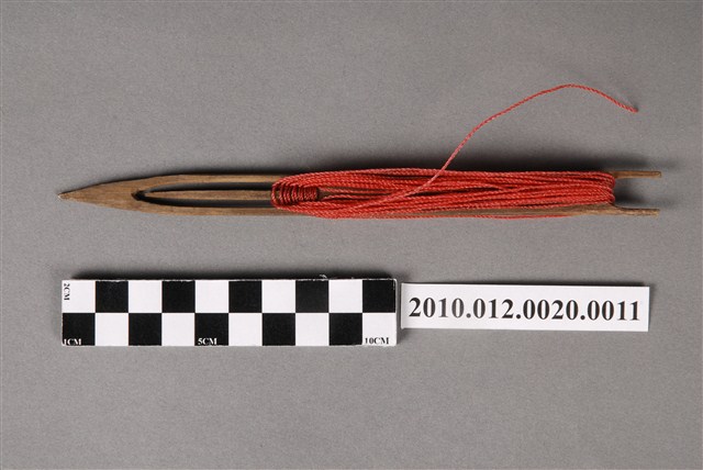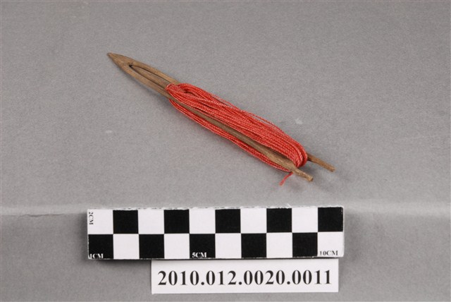 本物件為漁網結網器/補網針,為梭狀,上纏有紅色漁線,除可結網外亦作為修補漁網之用途,其材質有竹、木、鐵、銅、塑膠或複合材質,可略分為大號(約20-50cm,用來封漁網及修補粗線網)、小號(10cm以下,主要用來修補漁網)及介於其中的中號,中號由於大小適中,主要用來織各種漁網,結網器為織漁網的重要工具。本件長18.2cm。