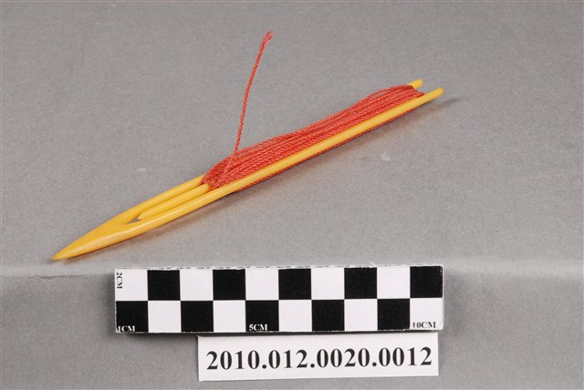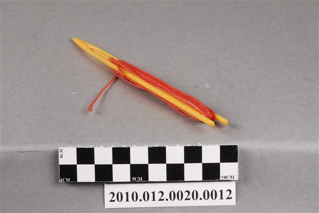 本物件為漁網結網器/補網針,為梭狀,上纏有紅色漁線,除可結網外亦作為修補漁網之用途,其材質有竹、木、鐵、銅、塑膠或複合材質,本件為塑膠製品。可略分為大號(約20-50cm,用來封漁網及修補粗線網)、小號(10cm以下,主要用來修補漁網)及介於其中的中號,中號由於大小適中,主要用來織各種漁網,結網器為織漁網的重要工具。本件長17.9cm。