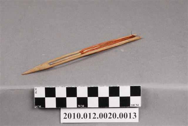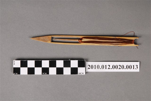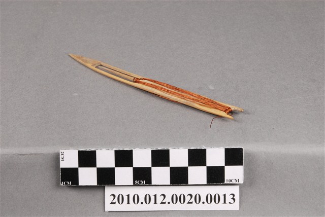 本物件為漁網結網器/補網針,為梭狀,上纏有金屬漁線,除可結網外亦作為修補漁網之用途,其材質有竹、木、鐵、銅、塑膠或複合材質,可略分為大號(約20-50cm,用來封漁網及修補粗線網)、小號(10cm以下,主要用來修補漁網)及介於其中的中號,中號由於大小適中,主要用來織各種漁網,結網器為織漁網的重要工具。本件長15.2cm。