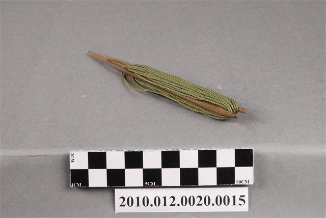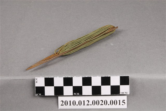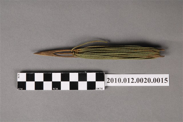 本物件為漁網結網器/補網針,為梭狀,上纏有墨綠色漁線,除可結網外亦作為修補漁網之用途,其材質有竹、木、鐵、銅、塑膠或複合材質,可略分為大號(約20-50cm,用來封漁網及修補粗線網)、小號(10cm以下,主要用來修補漁網)及介於其中的中號,中號由於大小適中,主要用來織各種漁網,結網器為織漁網的重要工具。本件長15.1cm。