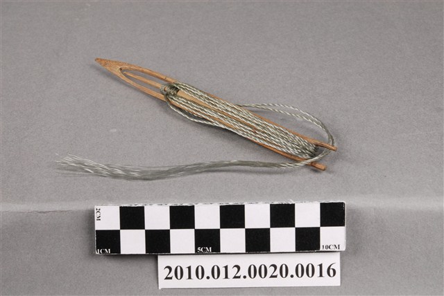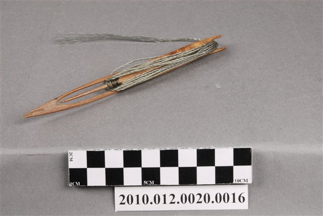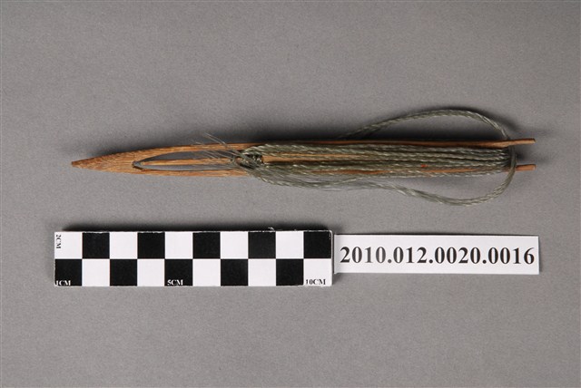 本物件為漁網結網器/補網針,為梭狀,上纏有墨綠色漁線,除可結網外亦作為修補漁網之用途,其材質有竹、木、鐵、銅、塑膠或複合材質,可略分為大號(約20-50cm,用來封漁網及修補粗線網)、小號(10cm以下,主要用來修補漁網)及介於其中的中號,中號由於大小適中,主要用來織各種漁網,結網器為織漁網的重要工具。本件長16.8cm。