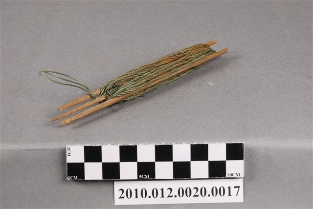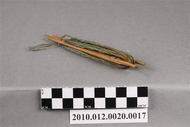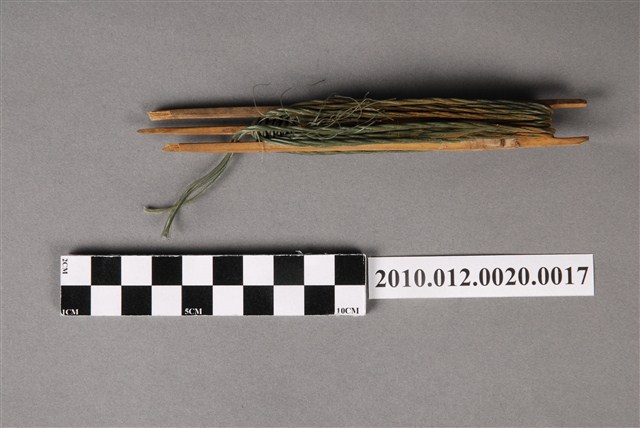 本物件為漁網結網器/補網針,為梭狀,上纏有墨綠色漁線,除可結網外亦作為修補漁網之用途,其材質有竹、木、鐵、銅、塑膠或複合材質,可略分為大號(約20-50cm,用來封漁網及修補粗線網)、小號(10cm以下,主要用來修補漁網)及介於其中的中號,中號由於大小適中,主要用來織各種漁網,結網器為織漁網的重要工具。本件長16.3cm。