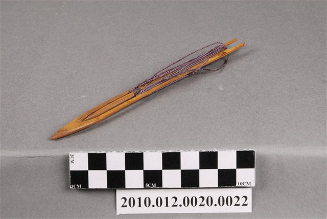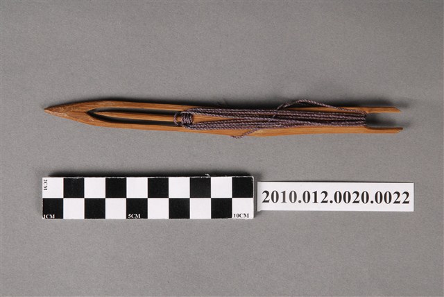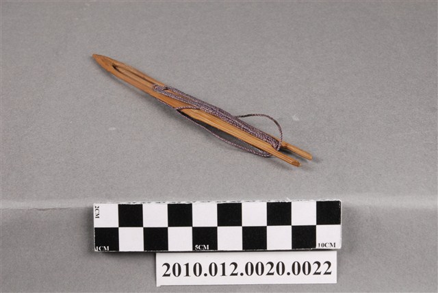 本物件為漁網結網器/補網針,為梭狀,上纏有咖啡色漁線,除可結網外亦作為修補漁網之用途,其材質有竹、木、鐵、銅、塑膠或複合材質,本件為竹製品。可略分為大號(約20-50cm,用來封漁網及修補粗線網)、小號(10cm以下,主要用來修補漁網)及介於其中的中號,中號由於大小適中,主要用來織各種漁網,結網器為織漁網的重要工具。本件長17.1cm。
