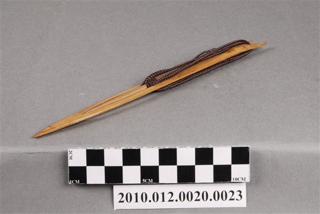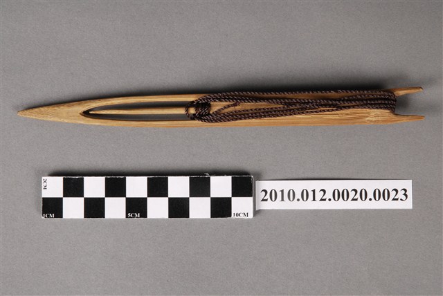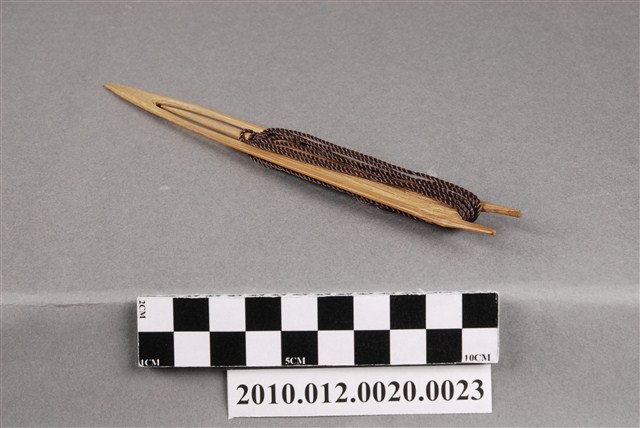 本物件為漁網結網器/補網針,為梭狀,上纏有咖啡色漁線,除可結網外亦作為修補漁網之用途,其材質有竹、木、鐵、銅、塑膠或複合材質,本件為竹製品。可略分為大號(約20-50cm,用來封漁網及修補粗線網)、小號(10cm以下,主要用來修補漁網)及介於其中的中號,中號由於大小適中,主要用來織各種漁網,結網器為織漁網的重要工具。本件長19.3cm。