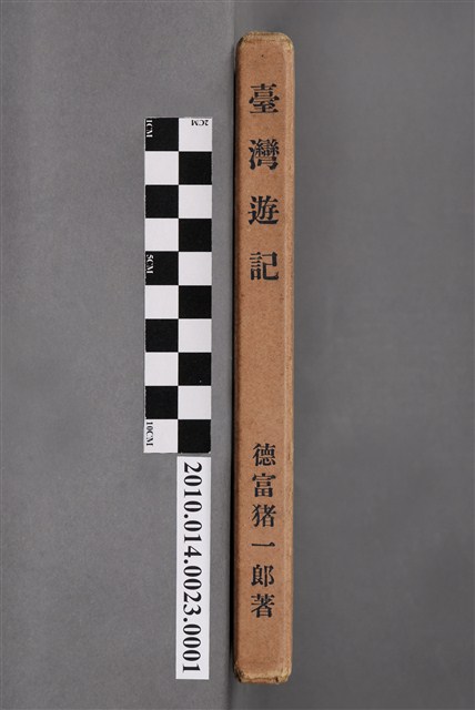本物件為德富猪一郎著《臺灣遊記》書殼,書殼正面為咖啡色,上半部分有一個黑色長方形框,文字由上至下蘇峰德富豬一郎著、臺灣遊記、東京民友社發行,側面印刷黑色字體由上至下臺灣遊記、德富豬一郎著,書殼背面沒有任何印刷文字。