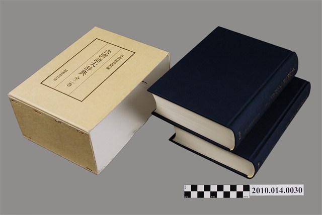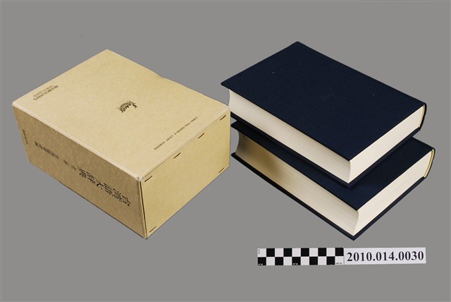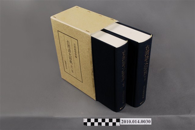 本文物為台灣總督府編《台灣語大辭典》全二卷全套。共有2個子件,分別為書殼和上下卷冊。書殼及兩本卷冊外觀皆有印製書名《台灣語大辭典》、編者「臺灣總督府」及發行單位「國書刊行會」等字樣。