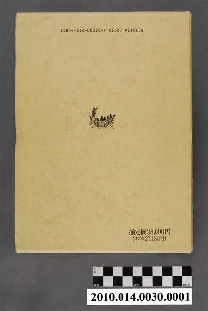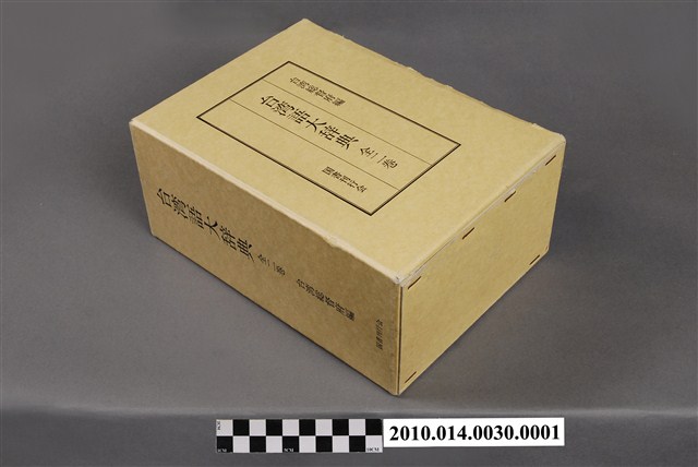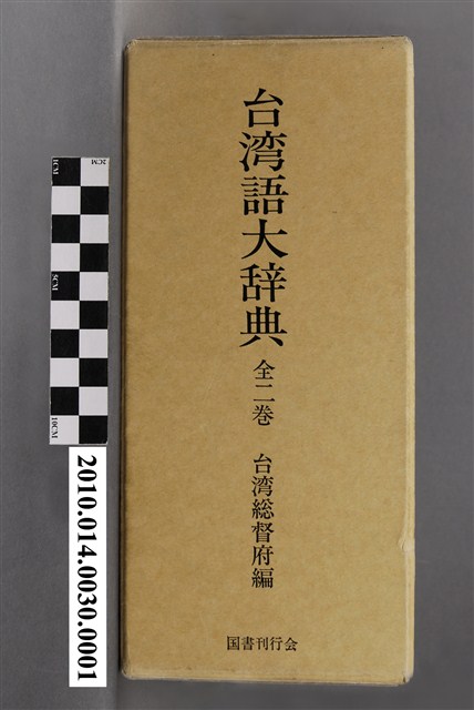 本文物為台灣總督府編《台灣語大辭典》全二卷書殼。書殼為紙製品,底色為米黃色,其上印有臺灣總督府編、臺灣語大辭典全二卷、國書刊行會等字樣。