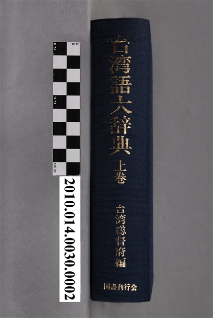 本文物為台灣總督府編《台灣語大辭典》上卷。書皮為硬殼布面,封面和封底無字無圖,僅有書背有燙金字體,有臺灣語大辭典上卷、臺灣總督府編、國書刊行會字樣。目錄以五十音為排序。版權頁印有「昭和六年三月八日印刷」、「昭和六年三月十日發行」、定價價格、著作兼發行者臺灣總督府,及印刷人加藤豐吉與印刷所小塚木店印刷工場的地址。
