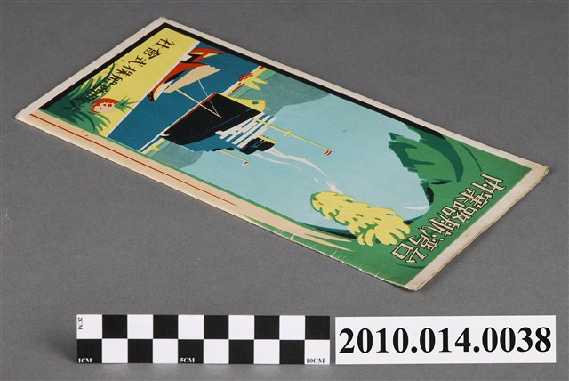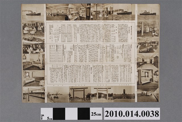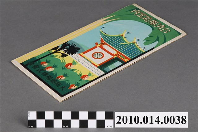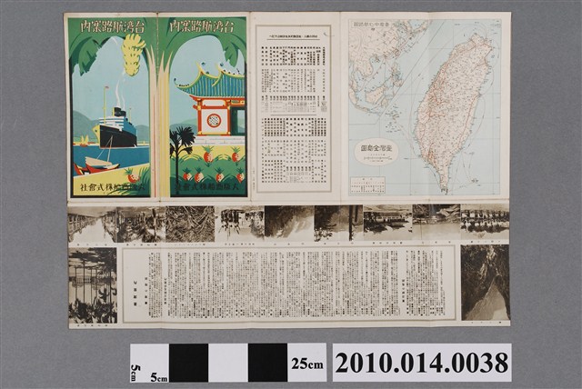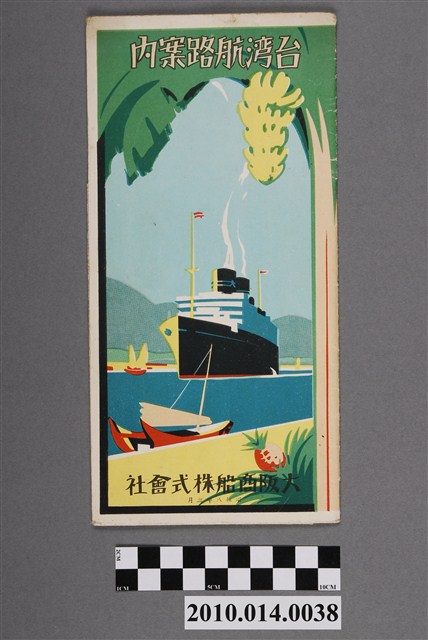 1. 本物件為以臺灣航路案內為主題之摺頁,封面上方以白色字體寫有台湾航路案內,下方以黑色字體寫有大阪商船株式會社、昭和八年三月(西元1933年3月),左側繪有1棵香蕉樹,右方有1棟屋頂富有燕尾裝飾之中式建築,下方種有6顆鳳梨;封底上方以白色字體寫有台湾航路案內,下方以黑色字體寫有大阪商船株式會社、昭和八年三月,右側繪有1棵結有1串香蕉的香蕉樹,右下方有1顆鳳梨,中間有1艘輪船,煙囪冒著白煙,船隻後方有山巒。正面右上方處附有1張地圖,地圖左上方框中標有臺灣中心航路圖,下方橢圓形框中標有臺灣全島圖及比例尺,地圖左方標有摺頁之販賣處之地址及電話,摺頁下方長方形框中標有臺灣案內,並分項記述臺灣の現狀、鐵道沿線名所案內、東沿岸の名所,附有11張黑白照片,分別標為臺北植物園、臺北市街、臺北植物園、パインナツプノレ畑、日月潭の蕃人杵歌、阿里山、新高山、臺南赤崁樓、花蓮港、蕃人の踴リ、タロコ峽。摺頁背面部分右上方標有臺灣航路案內、昭和八年三月發行。內容分項記述為弊社の臺灣航路、使用船、定期發着日時、船客運費、內外行連絡、船車連絡、乘船御注意、臺灣旅行の心得,並附有20張黑白照片,右側由上至下標題為蓬萊丸、蓬萊丸一等談話室、蓬萊丸二等食堂、蓬萊丸□間と升降機、蓬萊丸一等室、蓬萊丸邁步甲板,下方標題由右至左臺灣總督府、臺灣神社、臺南神社、高雄港,左商標題由上至下瑞穗丸、瑞穗丸一等談話室、瑞穗丸一等食堂、瑞穗丸一等特別室□室、瑞穗丸一等客室、瑞穗丸三等娛樂室,上方標題由右至左扶桑丸、扶桑丸一等談話室、扶桑丸二等客室、扶桑丸三等談話室。