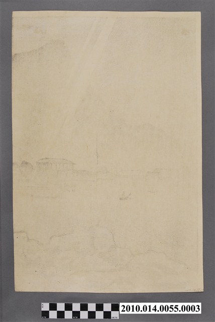1. 本物件為以基隆為主題的印刷畫。正面為基隆雨景之繪畫,基隆港內有小船與帆船行駛,遠方的山朦朧不明,下方有礁石,礁石左方有「清親」朱印。左方有紅字「明治三十年二月一日印刷仝年仝月五日發行臨寫印刷兼發行者日本橋區吉川町二番地松木平吉」,句末有一「平吉」朱印。背面空白,有正面圖案褪色的痕跡。2. 基隆位於臺灣北部,僅基隆港迎向大海,基隆港港灣深入市區,水面寬闊,集商港、軍港、漁港於一身,為進入北臺灣之門戶。因地形受東北季風影響,冬天多雨,故有「雨港之都」之稱。3. 2010.014.0055三張為浮世繪畫師小林清親的作品「臺灣三景之內基隆之雨」。小林清親為明治時期的浮世繪師與版畫家,有「最後的浮世繪師」之稱。其運用西方繪畫手法創作的浮世繪被稱出版商松木平吉名為「光線畫」。松木平吉是浮世繪師與出版商,據說是小林清親的門人。