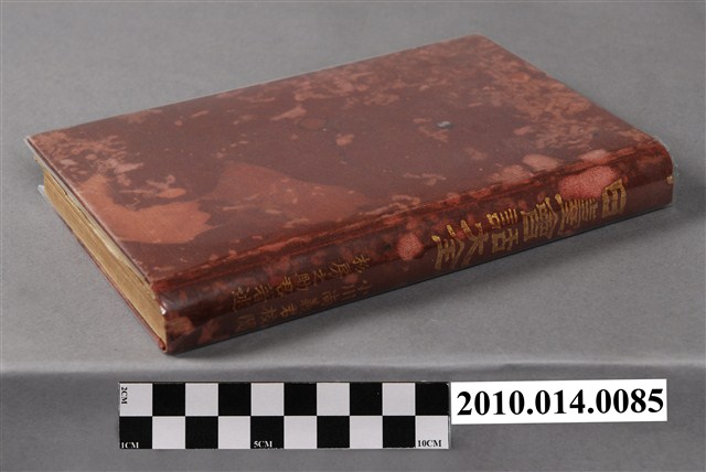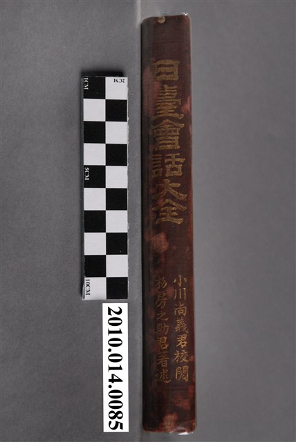 本物件為杉房之助著《日臺會話大全》,作者為杉房之助,深紅色書皮,除了書扉寫有其書名與作者名外,書皮上並無任何其他文字或裝飾,書皮顏色略有褪色與水痕。內容共五章,包含發音、講話法、講話法補習、講話一(普通會話)、講話二(寓話)等部分,對於日常生活用語如拜訪、飲食、買賣、交通等都有介紹。