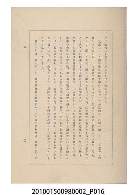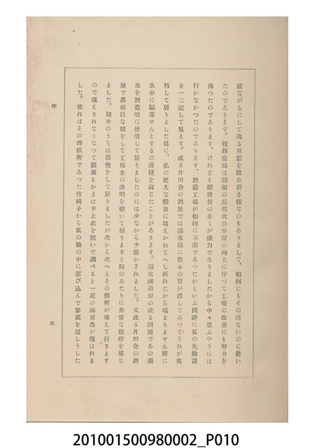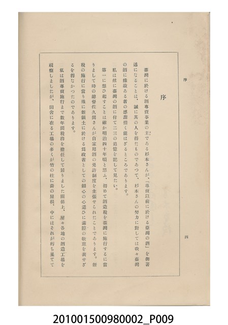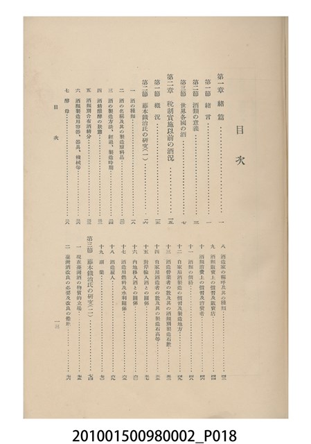 1.本物件為衫本良著《專賣制度前の臺灣の酒》,為紙質,封面封底皆為藍色,皆無圖案字樣,封底有破損痕跡,內頁有彩色繪畫瓶甕、黑白繪畫之樹林造酒廠等,並於其中1頁有「專賣制度前の臺灣の酒」、「杉本良」黑色字樣,其旁則有1隻黑色公雞圖樣,次頁則有「臺灣酒類專賣實施十週年祝賀紀念出版」、「昭和七年五月」、「臺灣酒類賣捌人組合」黑色字樣,其內容分為緒篇、稅制實施の酒況、酒造稅規則と酒稅成績、臺灣酒造狀況、內地移入の清酒、麥酒、外國酒類、原住民の酒、酒類專賣と酒類營業者、酒類賣捌人の指定と賣捌人組合,共10章,並附有相關照片。
