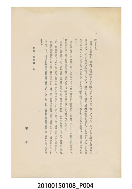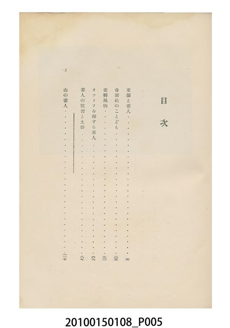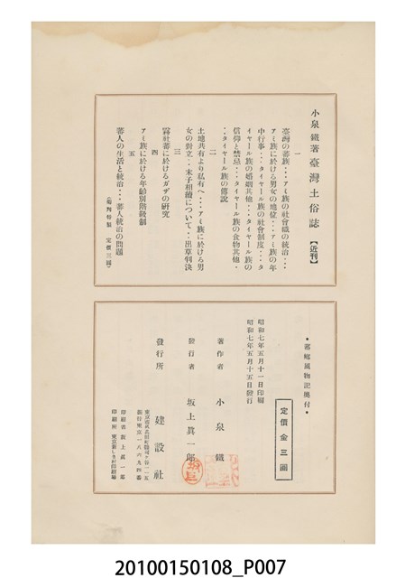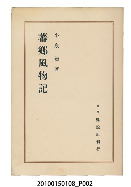 1. 本件為日本時代的書籍,由小泉鐵著作、東京新しき村印刷場印刷、東京建設社發行。本書為右翻式書籍,藍色素面書皮無任何文字或圖案,內頁附有著作所寫之序文以及24張黑白印刷照片。書中目次如下:東部と蕃人、奇密社のことども、蕃郷風物、オットフを拜する蕃人、蕃人の慣習と土俗、山の番人、蕃人の犯罪観、蕃人の恋愛と結婚、蕃婦を描く、臺灣の夏の旅、臺灣の蛇、臺灣の道路、蕃界日記(一)、蕃界日記(二)。2. 本書作者小泉鐵為日本文壇白樺派的作家,此書內容是他旅居臺灣期間的所見所聞,記載時間從昭和3年至昭和5年(192