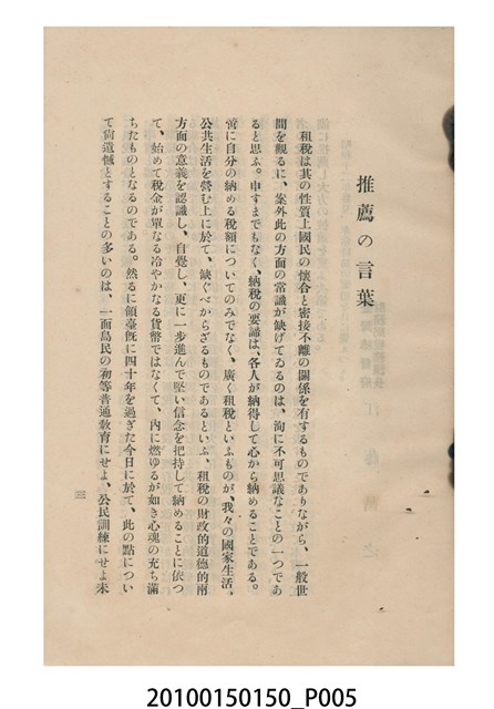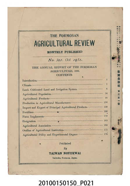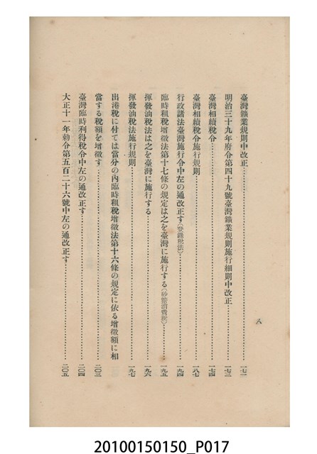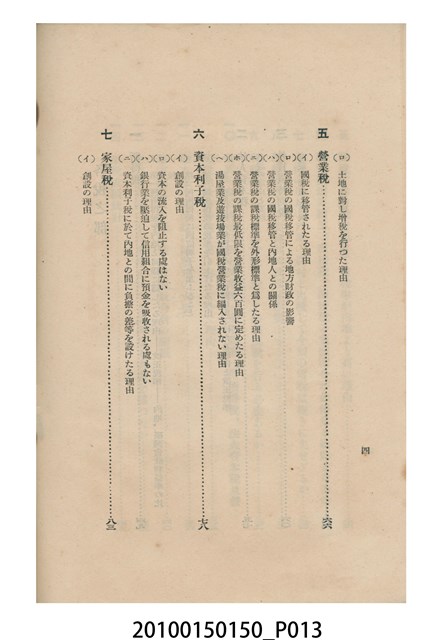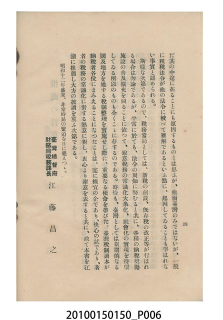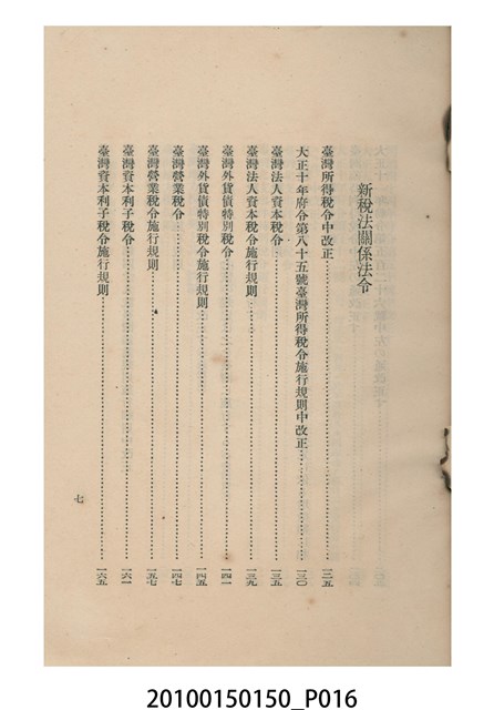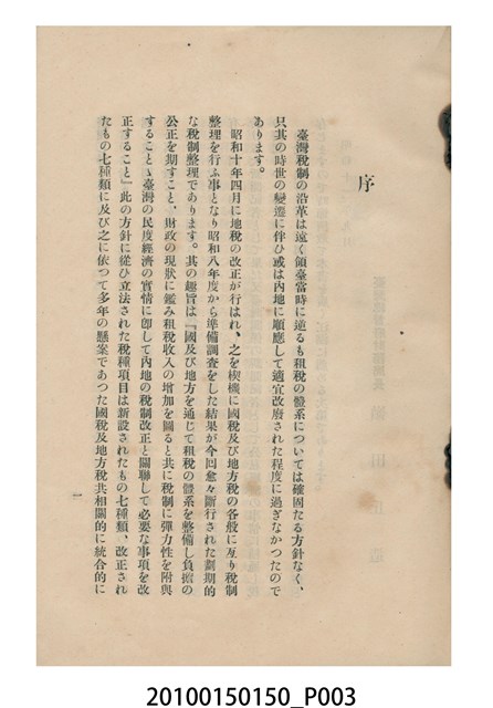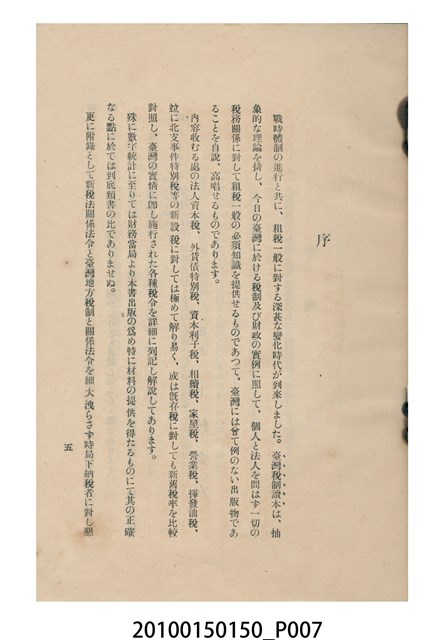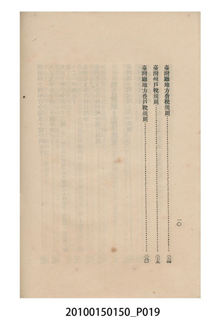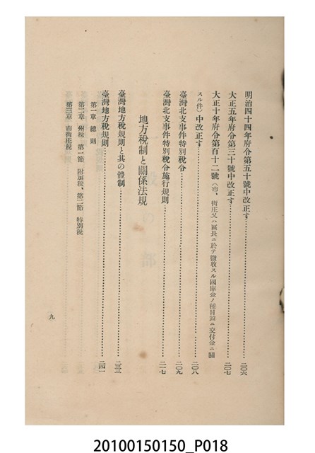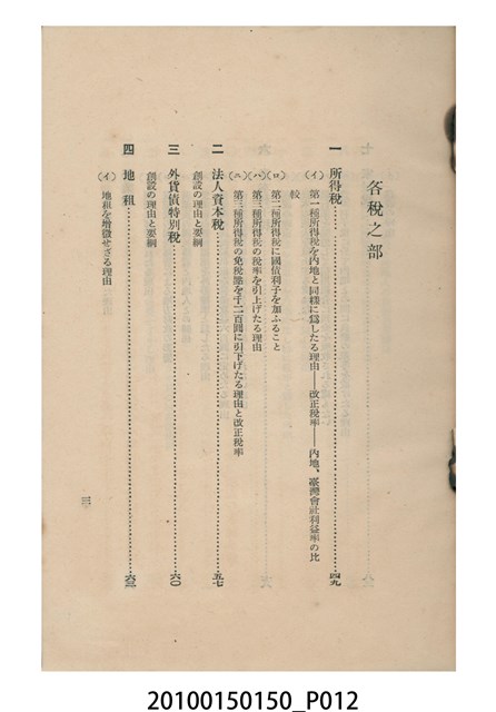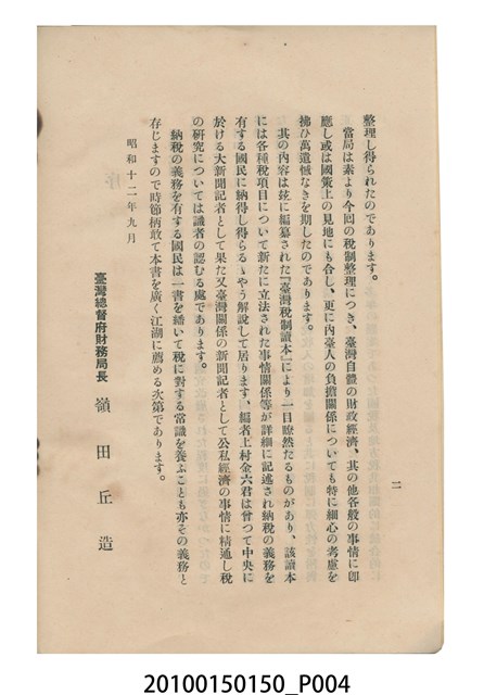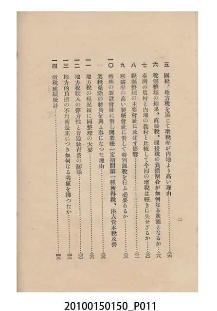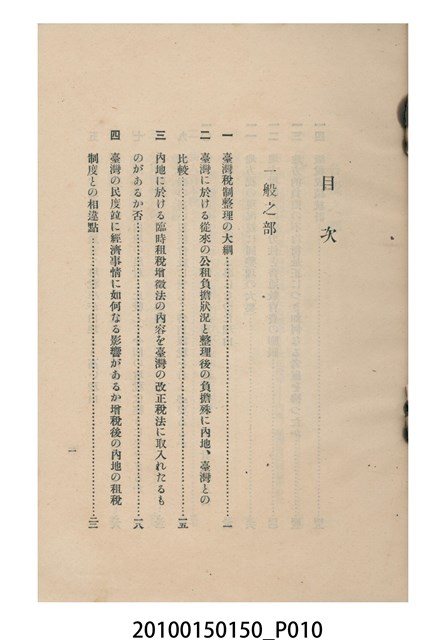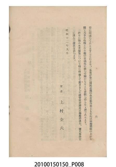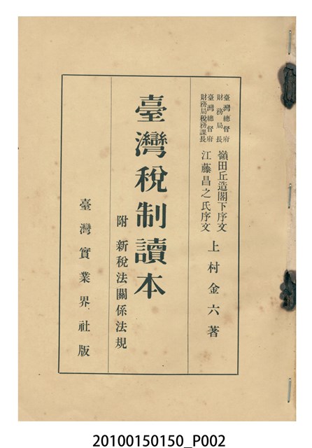 本物件為臺灣稅制讀本,為藍色書皮。由物件正面可見「臺灣稅制讀本」、「臺灣實業界社 版」字樣;封面可見「臺灣稅制讀本」、「臺灣實業界社 版」、「上村金六 著」、「附 新稅法關係法規」字樣。其目錄章節可見包括「一般之部」(如:臺灣稅制整理の大綱)、「各稅之部」(如:所得稅)。該刊物內頁亦可見刊物發行人為宮川次郎,發行所為臺灣實業界社(地址為臺北市大正町二丿一八)。