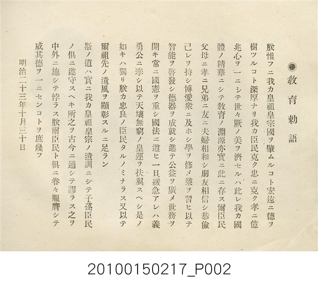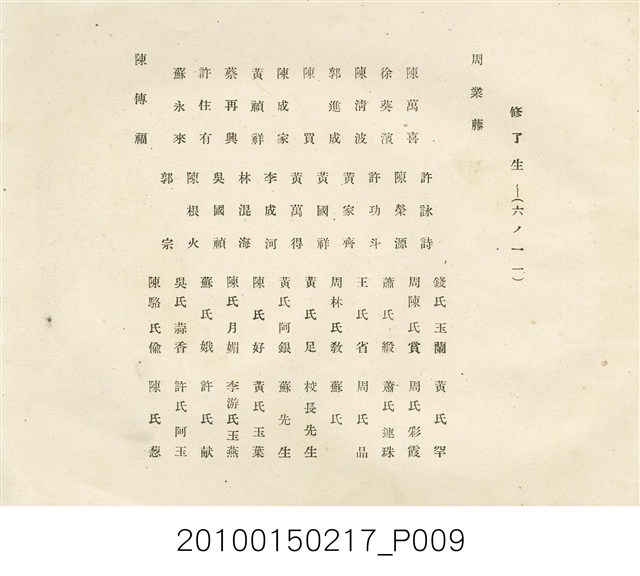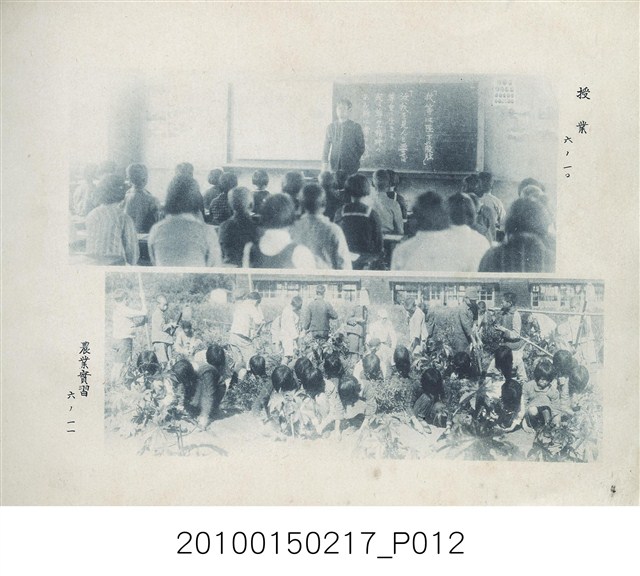 本件為菁埔國民學校第23屆結業紀念冊,製作時間為昭和19年(1944)3月,雙孔線裝,黑白印刷。內容包含教職員合照、修學旅行照、課堂照、農業實習照等。菁埔國民學校(今新北市林口國民小學),前身為「新庄山腳公學校菁埔分校」,1915年創立,1921年獨立為「菁埔公學校」。至1941國民學校令施行,菁埔公學校又改稱「菁埔國民學校」。該校名沿革,如下:1915年,新庄山腳公學校菁埔分校;1921年,菁埔公學校;1941年,菁埔國民學校;1947年,林口國民學校;1968年,林口國民小學。