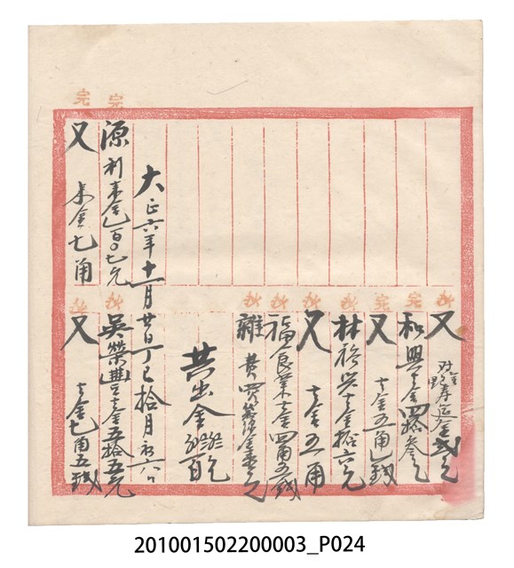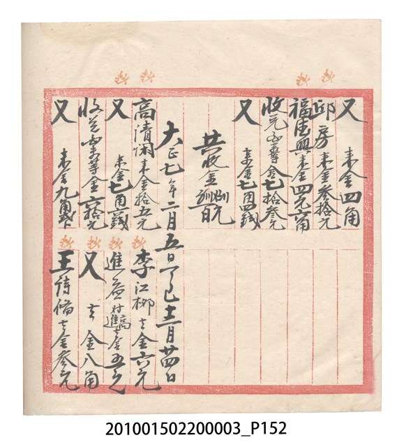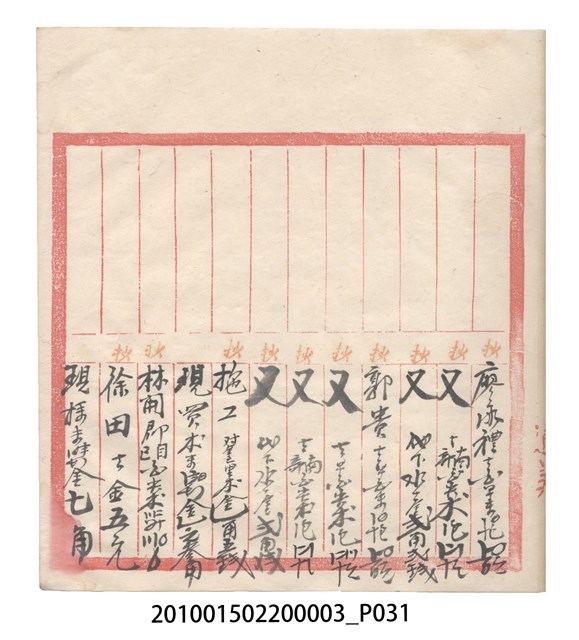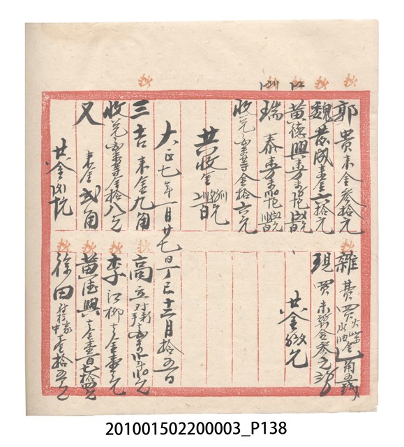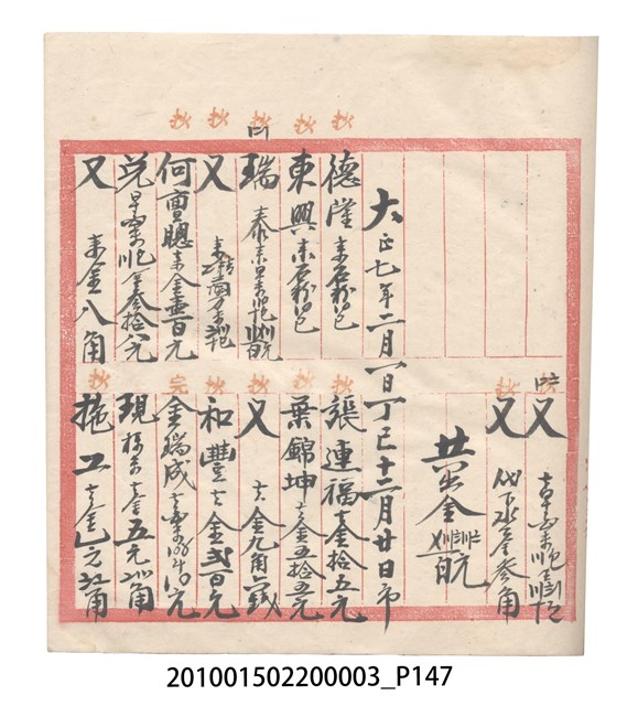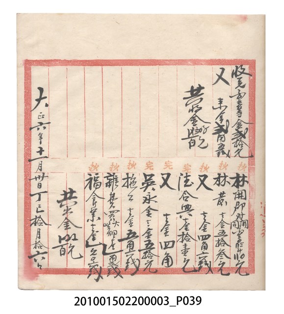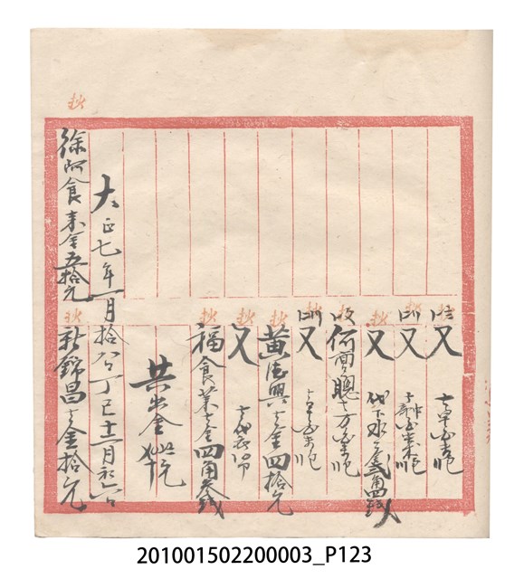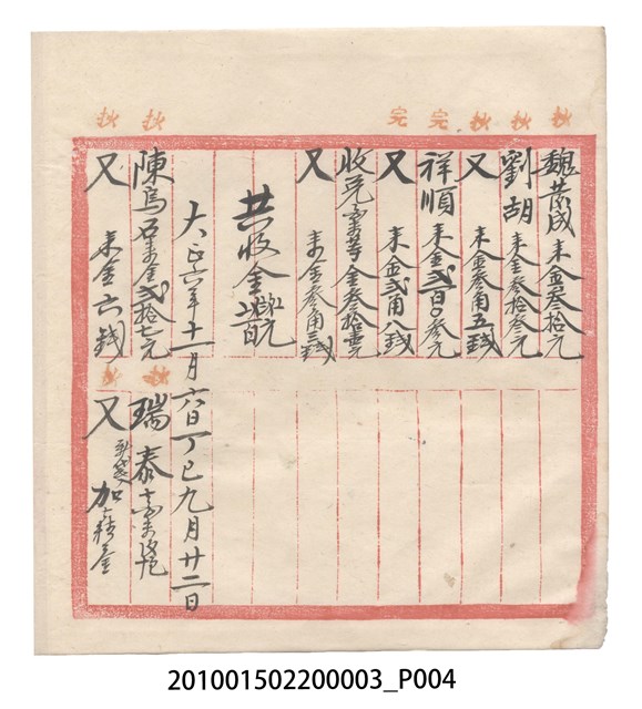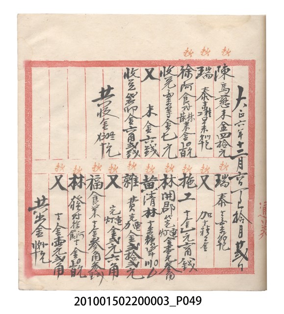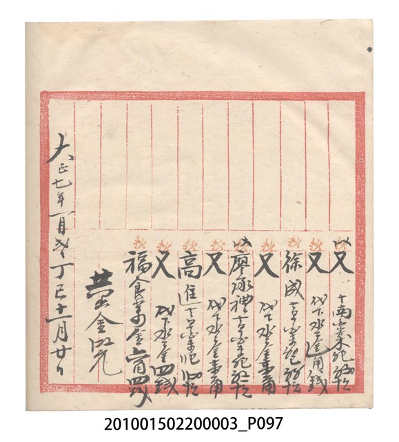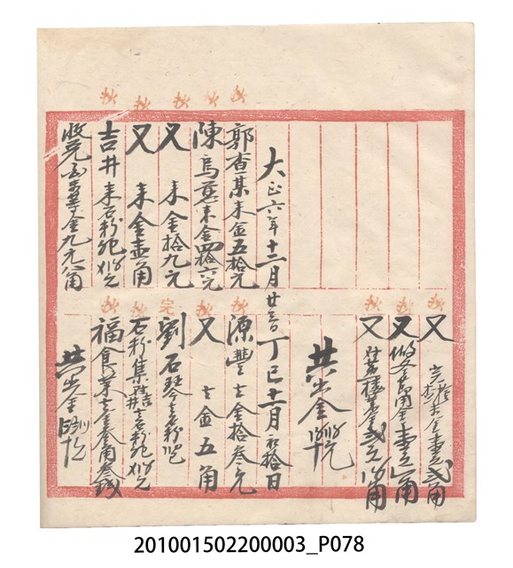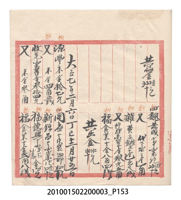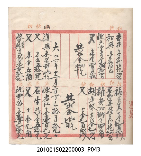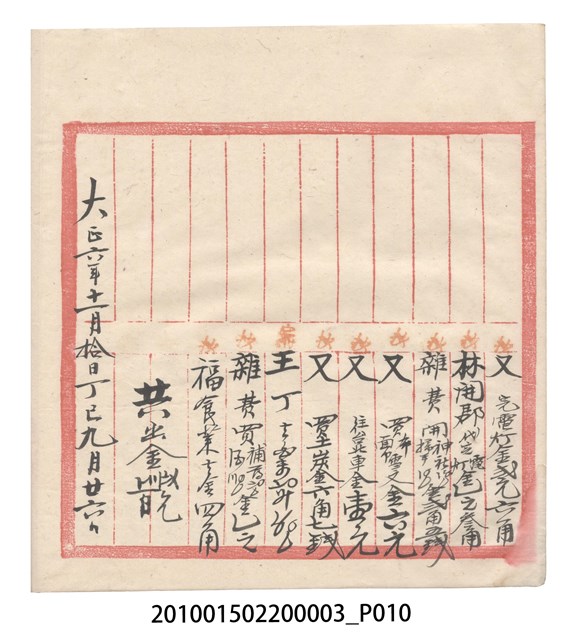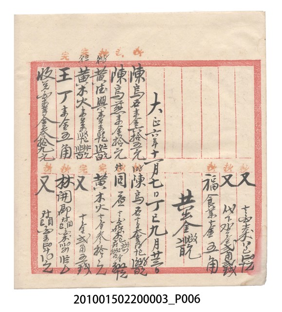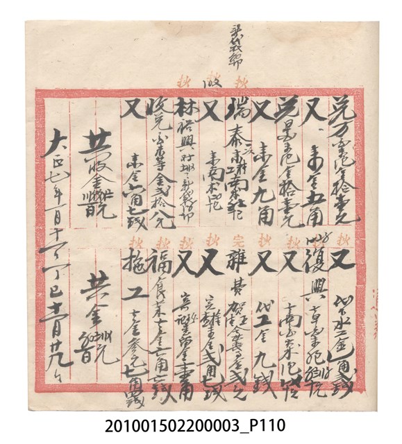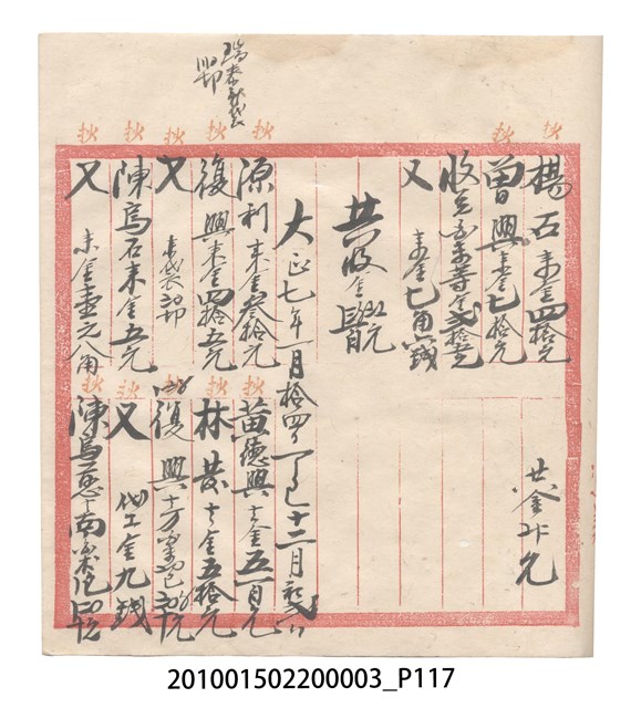 本物件為瑞興商店大正六年丁巳菊月叄部日清,該書以棉線裝訂,封面、封底為藍色,頂邊題有瑞興商店大正六年丁巳菊月叄部日清字樣,內容涵蓋首行瑞興商店大正6年丁巳菊月立叄部日清 承弍部日清尾存金1208元●角4錢。 大正6年11月5日丁巳9月21日大吉利市上欄收入廖承禮、曾興、楊石、進益、簡阿川、呂裕和、郭查某等費用;下欄支出雜費、福食等費用。大正6年11月6日丁巳9月22日上欄收入陳烏石等費用;下欄支出瑞泰、王了等費用。大正6年11月7日丁巳9月23日上欄收入陳烏石等費用;下欄支出陳烏石、同益、黃木火等費用。大正6年11月8日丁巳9月24日上欄收入徐德、廖承禮、曾興等費用;下欄支出張連福、黃德興、黃木火等費用。[夾紙] 本物件為通知書 敬啓者 茲今午配運送去麻袋●●到着望即差收登帳是幸 大正7年1月14日 九芎橋 復興出 瑞興大宝號 [夾紙] 本物件為 1月14日源利棧致瑞興寶號王港 殿賒銀。憑單撥出小朮米弍包、小万米弍包 即付去金並其餘銀項候此十八九日送還是也。[夾紙] 本物件為上欄來金收入;下欄付金支出帳單。 本物件為上欄收入兌南部●●金等費用;下欄支出雜費等費用。