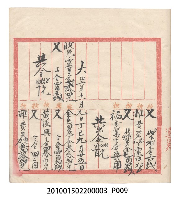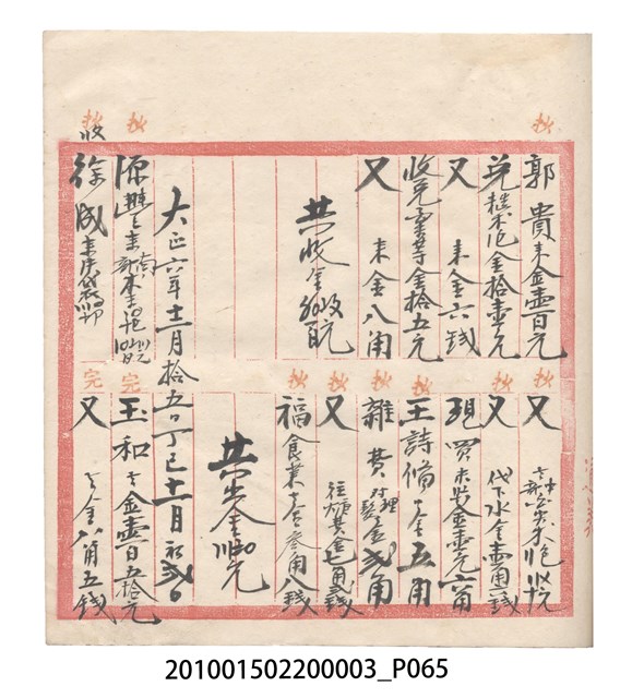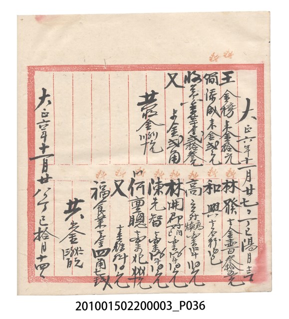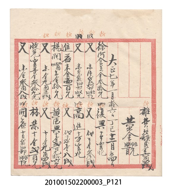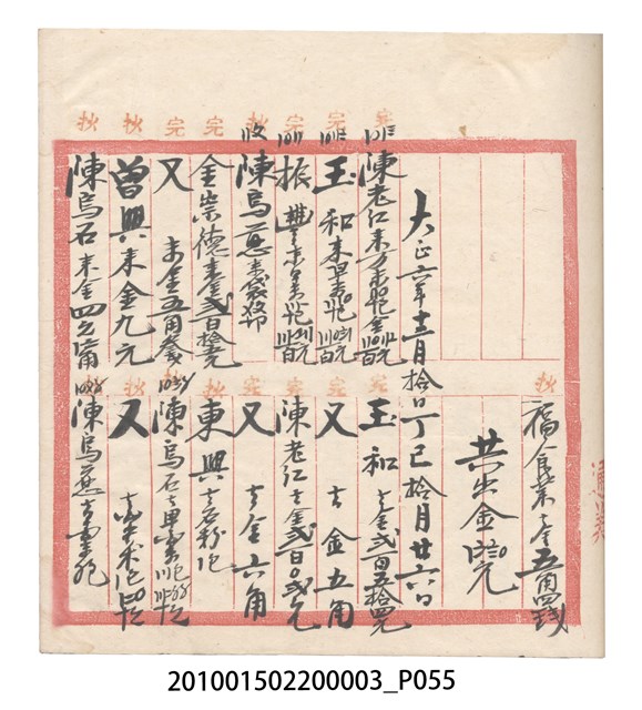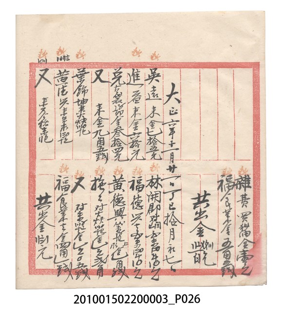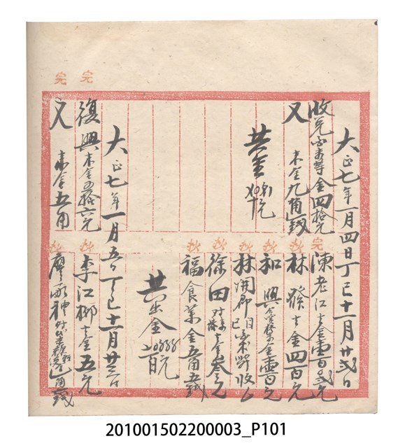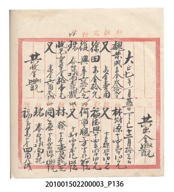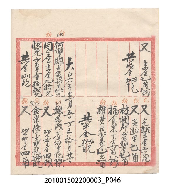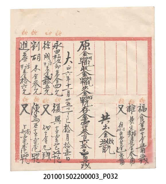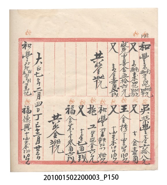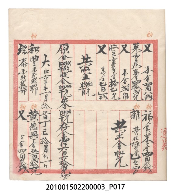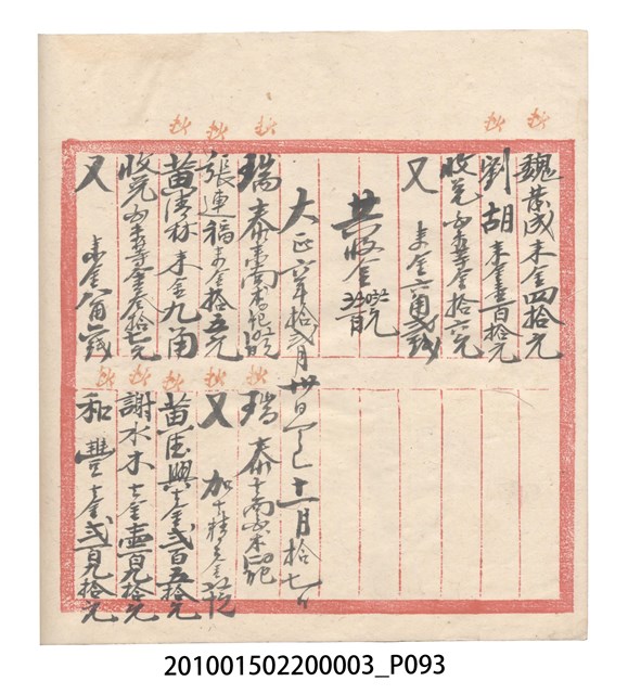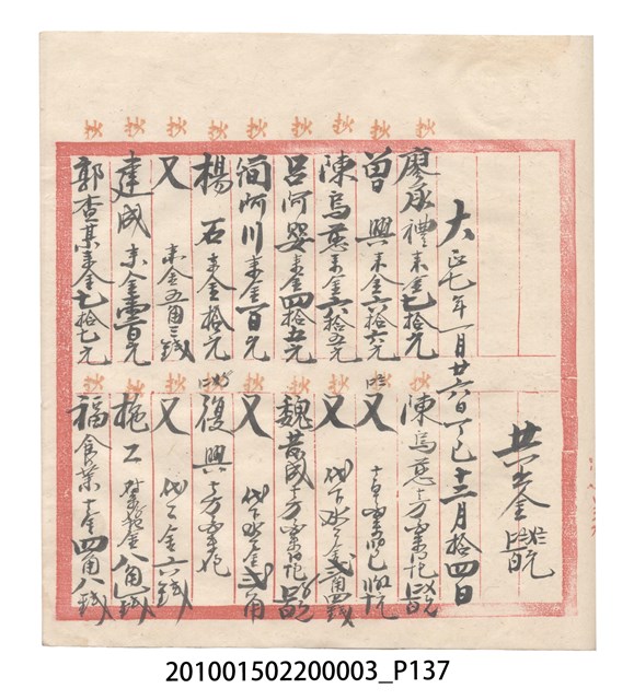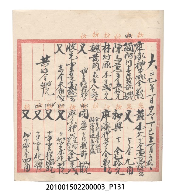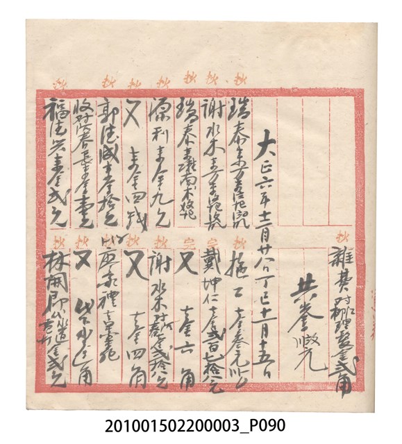 本物件為瑞興商店大正六年丁巳菊月叄部日清,該書以棉線裝訂,封面、封底為藍色,頂邊題有瑞興商店大正六年丁巳菊月叄部日清字樣,內容涵蓋首行瑞興商店大正6年丁巳菊月立叄部日清 承弍部日清尾存金1208元●角4錢。 大正6年11月5日丁巳9月21日大吉利市上欄收入廖承禮、曾興、楊石、進益、簡阿川、呂裕和、郭查某等費用;下欄支出雜費、福食等費用。大正6年11月6日丁巳9月22日上欄收入陳烏石等費用;下欄支出瑞泰、王了等費用。大正6年11月7日丁巳9月23日上欄收入陳烏石等費用;下欄支出陳烏石、同益、黃木火等費用。大正6年11月8日丁巳9月24日上欄收入徐德、廖承禮、曾興等費用;下欄支出張連福、黃德興、黃木火等費用。[夾紙] 本物件為通知書 敬啓者 茲今午配運送去麻袋●●到着望即差收登帳是幸 大正7年1月14日 九芎橋 復興出 瑞興大宝號 [夾紙] 本物件為 1月14日源利棧致瑞興寶號王港 殿賒銀。憑單撥出小朮米弍包、小万米弍包 即付去金並其餘銀項候此十八九日送還是也。[夾紙] 本物件為上欄來金收入;下欄付金支出帳單。 本物件為上欄收入兌南部●●金等費用;下欄支出雜費等費用。