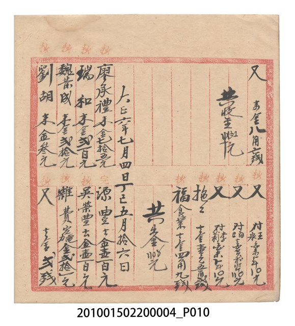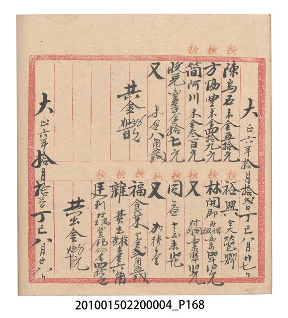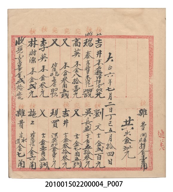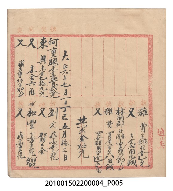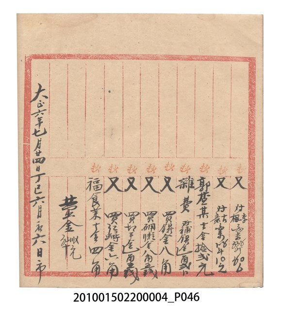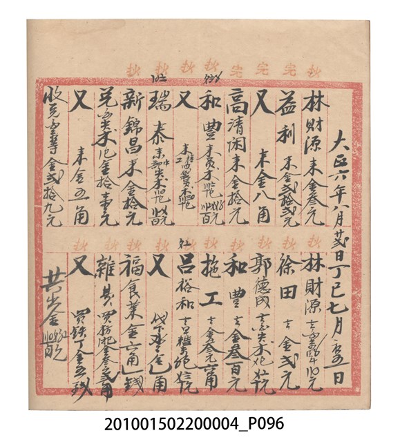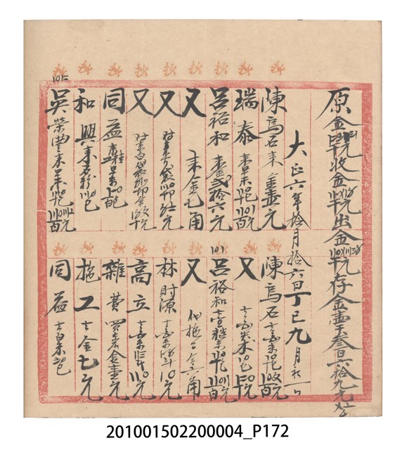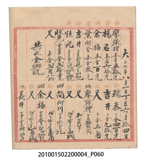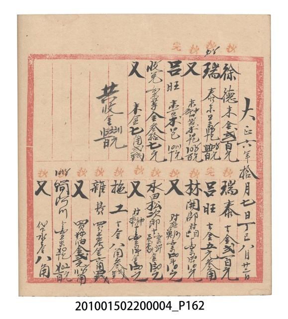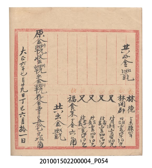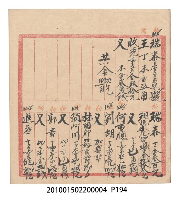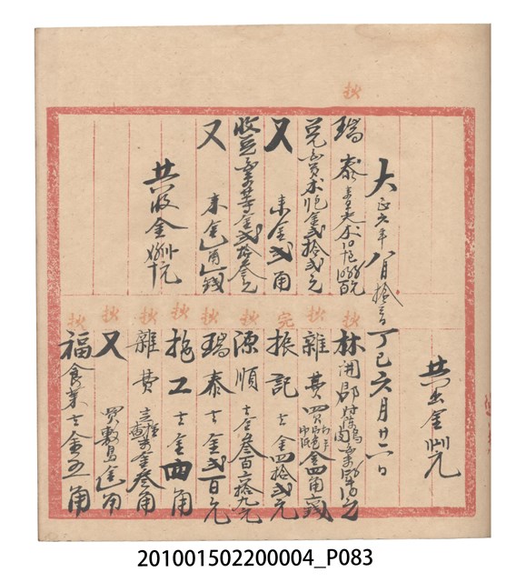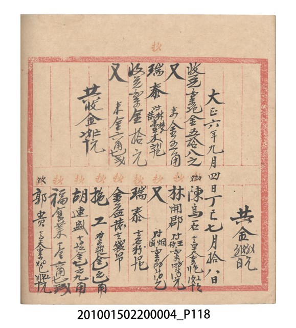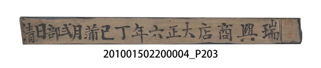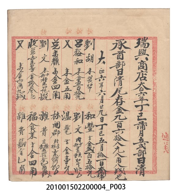 本物件為瑞興商店大正六年丁巳蒲月弍部日清,該書以棉線裝訂,封面、封底為藍色,頂邊題有瑞興商店大正六年丁巳蒲月弍部日清字樣,內容涵蓋首行瑞興商店大正6年丁巳蒲月立弍部日清 承首部日清尾存金968元8角8錢也。大正6年6月29日丁巳5月11日大吉利市上欄收入劉胡、呂裕和等費用;下欄支出和豐、劉文、溫靟、林開郡、雜費、福食等費用。大正6年6月30日丁巳5月12日上欄收入兌●●●金等費用;下欄支出瑞泰、林開郡等費用。大正6年7月1日丁巳5月13日上欄收入何亶聰、東興等費用;下欄支出劉文、和豐等費用。大正6年7月2日丁巳5月134日上欄收入吉井、瑞泰、高英等費用;下欄支出劉文、吳長盛等費用。總計原金、收金、出金、存金。