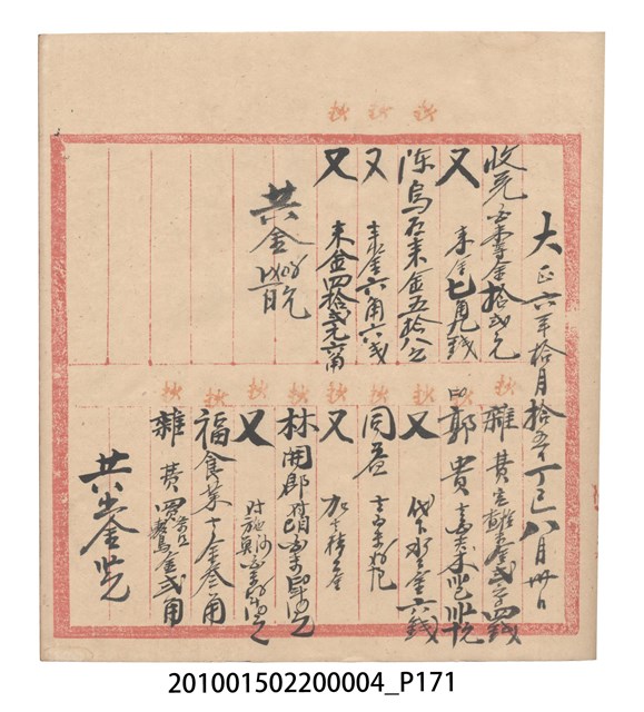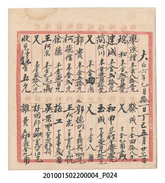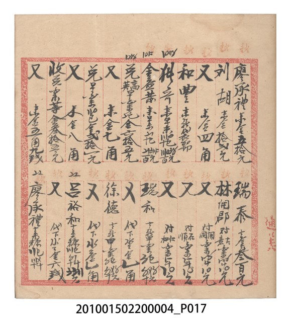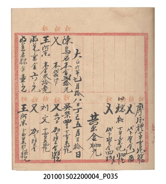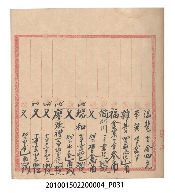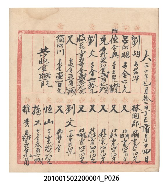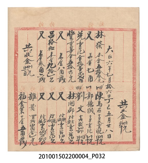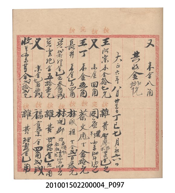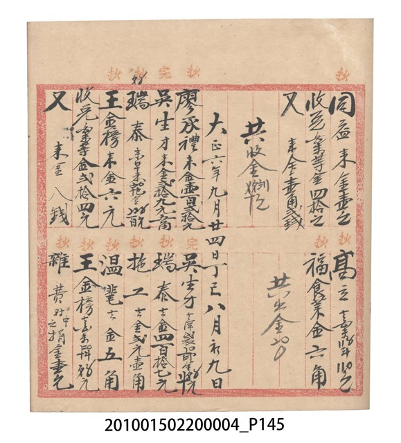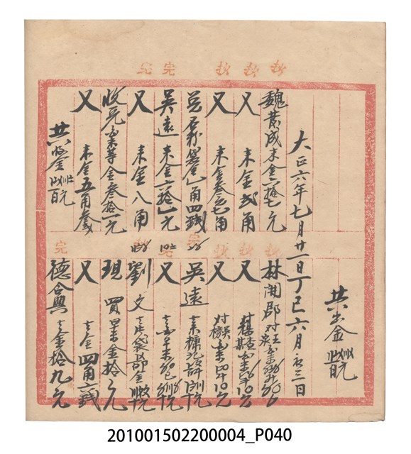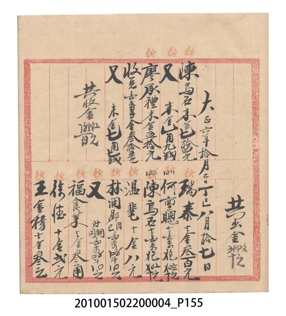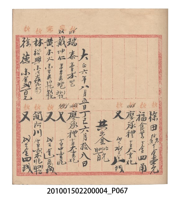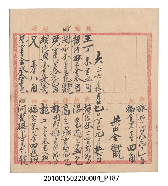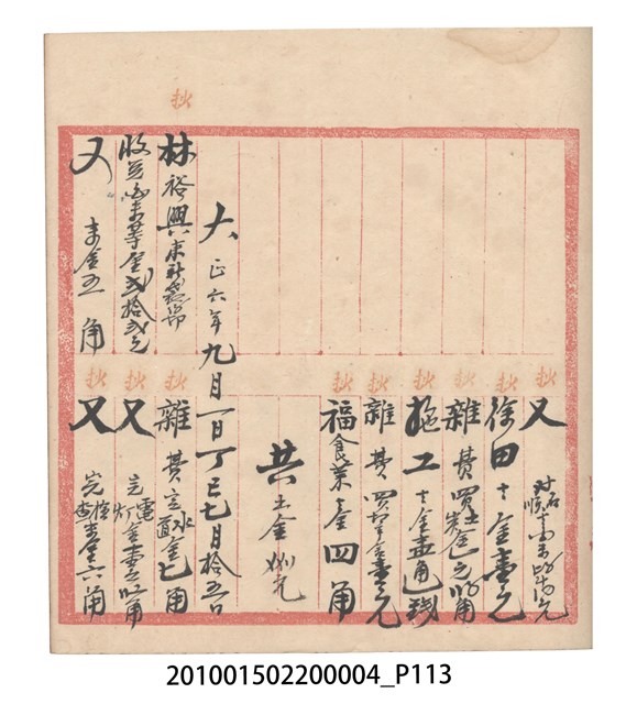 本物件為瑞興商店大正六年丁巳蒲月弍部日清,該書以棉線裝訂,封面、封底為藍色,頂邊題有瑞興商店大正六年丁巳蒲月弍部日清字樣,內容涵蓋首行瑞興商店大正6年丁巳蒲月立弍部日清 承首部日清尾存金968元8角8錢也。大正6年6月29日丁巳5月11日大吉利市上欄收入劉胡、呂裕和等費用;下欄支出和豐、劉文、溫靟、林開郡、雜費、福食等費用。大正6年6月30日丁巳5月12日上欄收入兌●●●金等費用;下欄支出瑞泰、林開郡等費用。大正6年7月1日丁巳5月13日上欄收入何亶聰、東興等費用;下欄支出劉文、和豐等費用。大正6年7月2日丁巳5月134日上欄收入吉井、瑞泰、高英等費用;下欄支出劉文、吳長盛等費用。總計原金、收金、出金、存金。