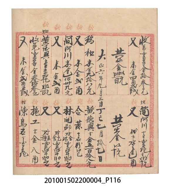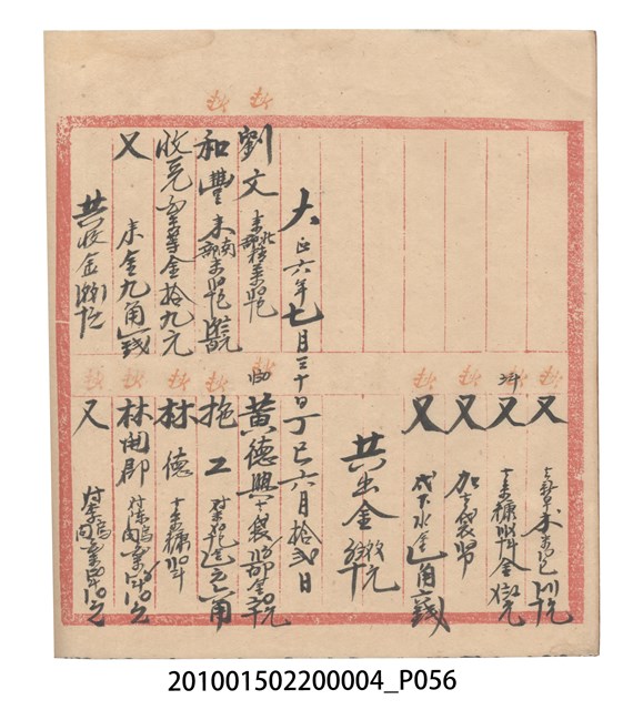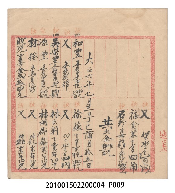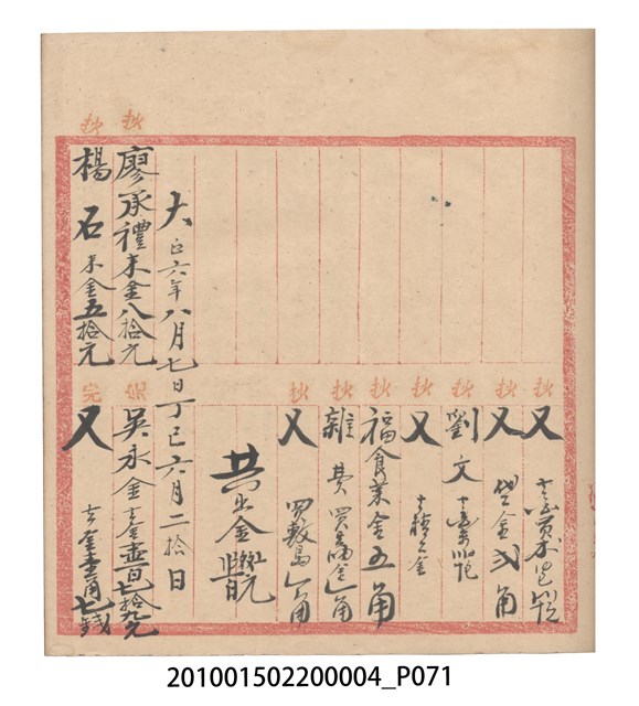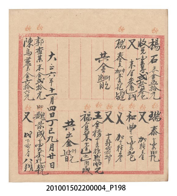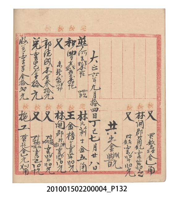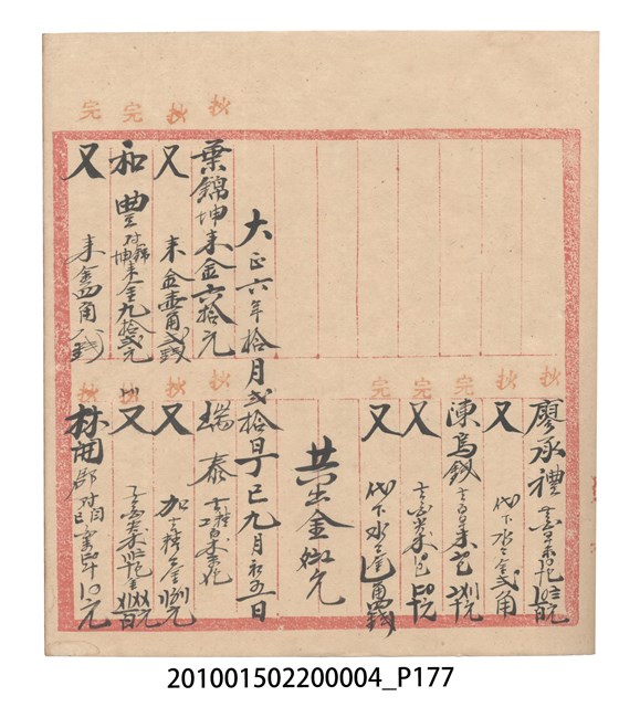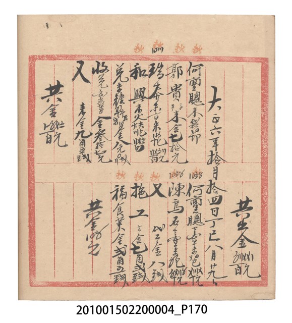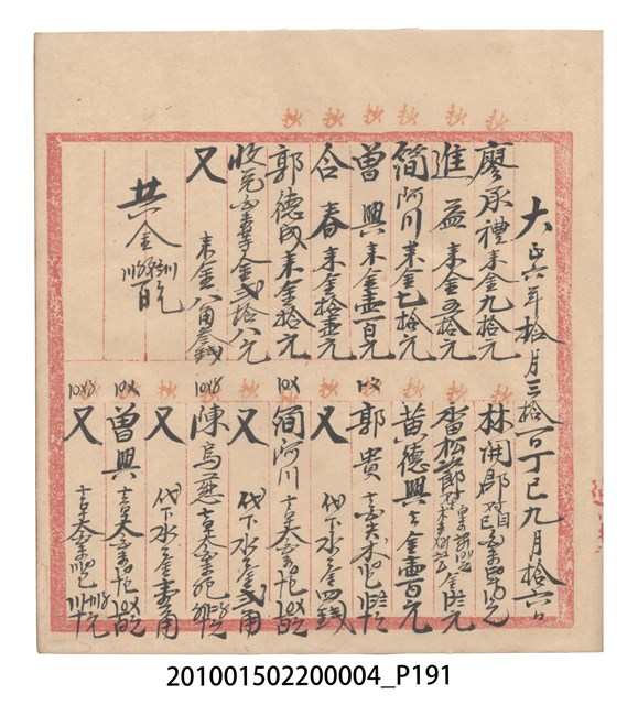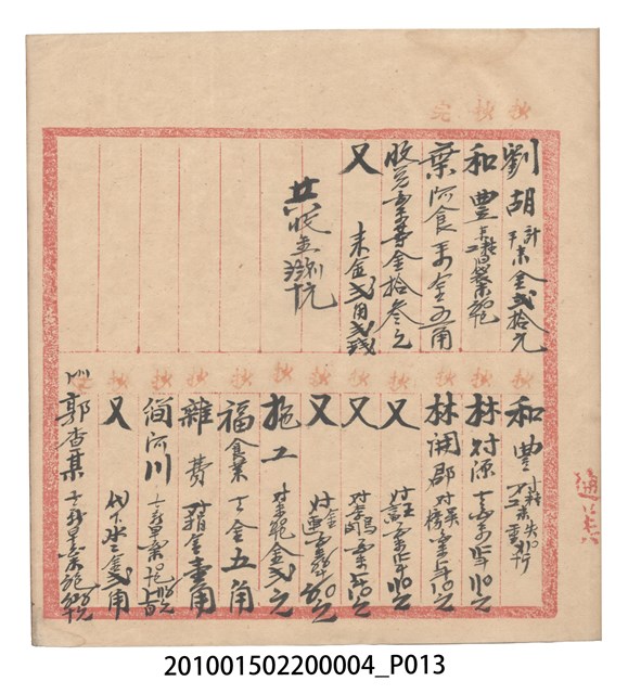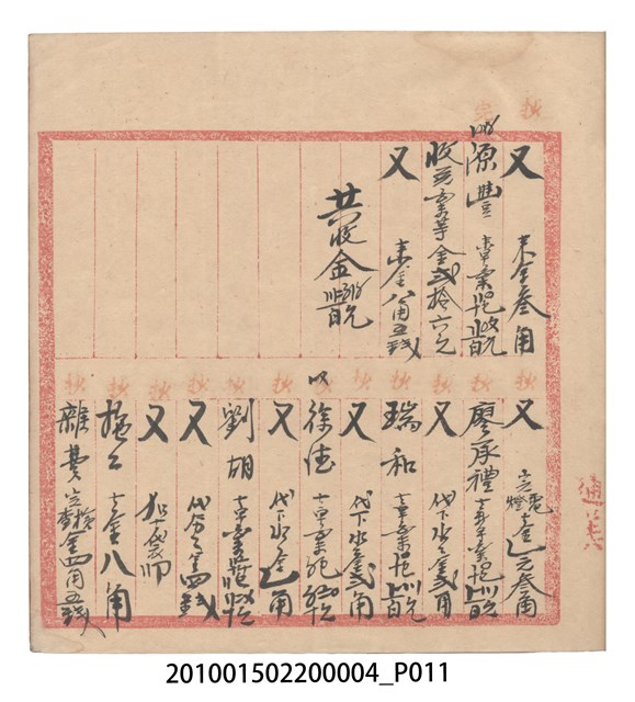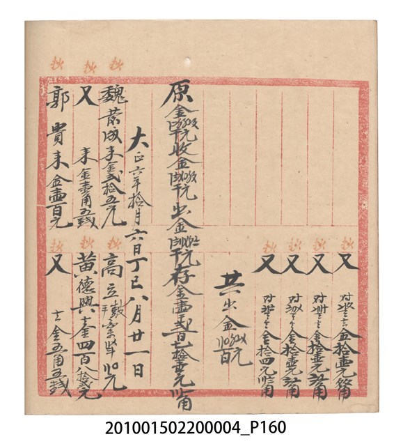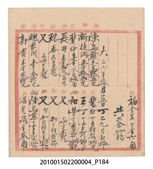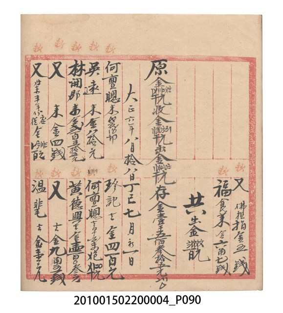 本物件為瑞興商店大正六年丁巳蒲月弍部日清,該書以棉線裝訂,封面、封底為藍色,頂邊題有瑞興商店大正六年丁巳蒲月弍部日清字樣,內容涵蓋首行瑞興商店大正6年丁巳蒲月立弍部日清 承首部日清尾存金968元8角8錢也。大正6年6月29日丁巳5月11日大吉利市上欄收入劉胡、呂裕和等費用;下欄支出和豐、劉文、溫靟、林開郡、雜費、福食等費用。大正6年6月30日丁巳5月12日上欄收入兌●●●金等費用;下欄支出瑞泰、林開郡等費用。大正6年7月1日丁巳5月13日上欄收入何亶聰、東興等費用;下欄支出劉文、和豐等費用。大正6年7月2日丁巳5月134日上欄收入吉井、瑞泰、高英等費用;下欄支出劉文、吳長盛等費用。總計原金、收金、出金、存金。