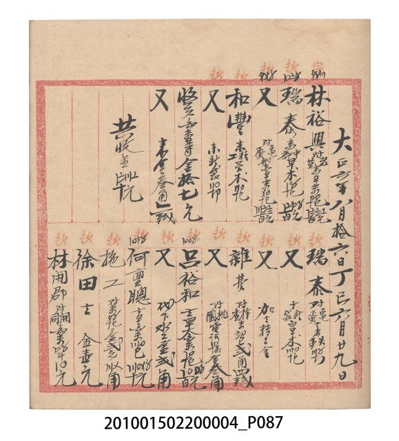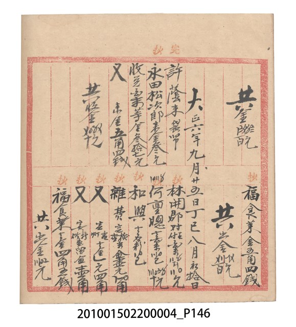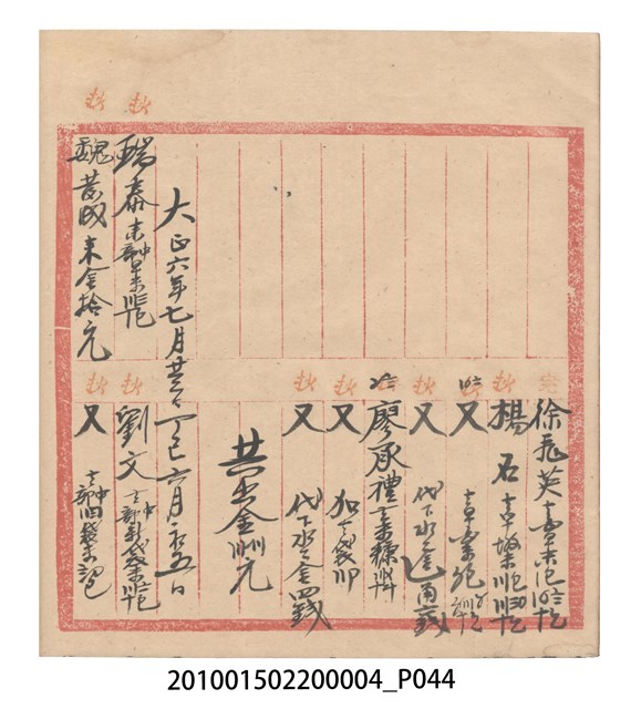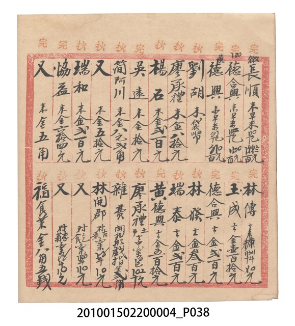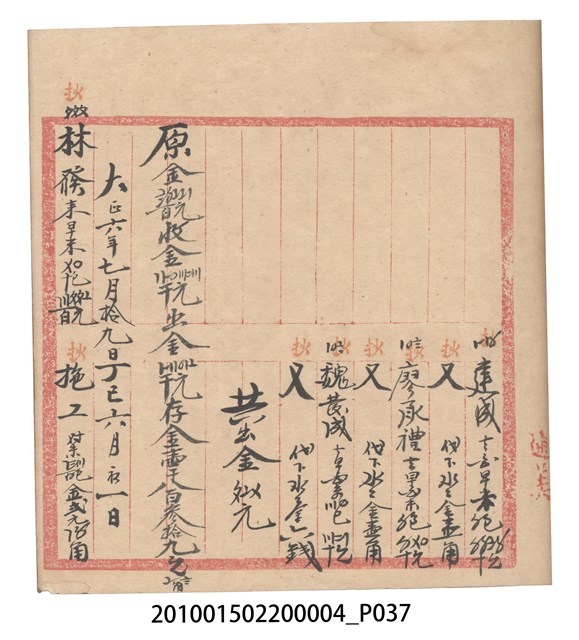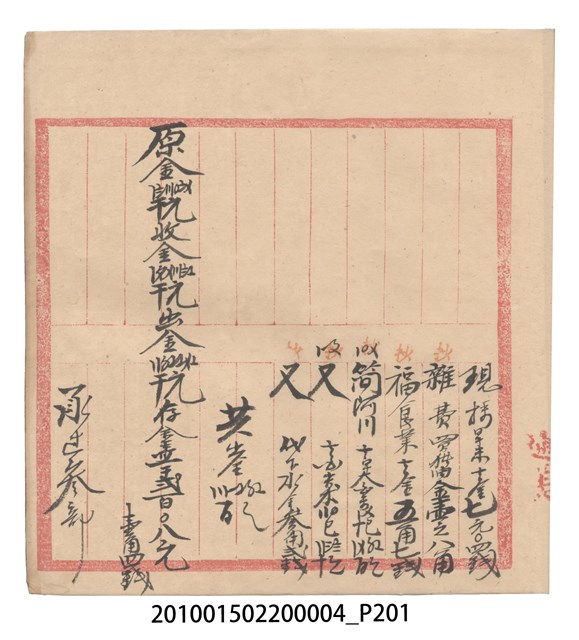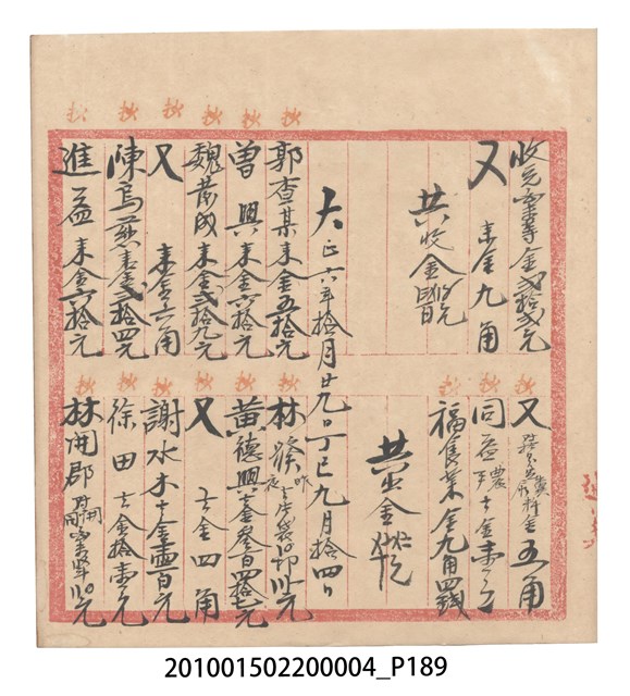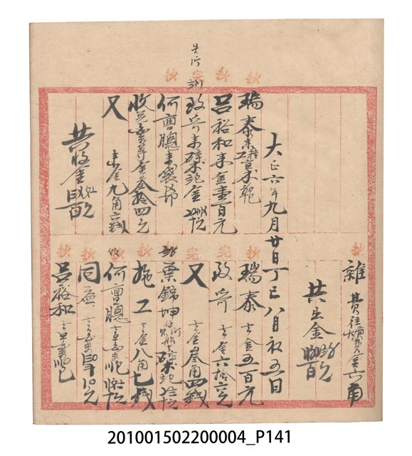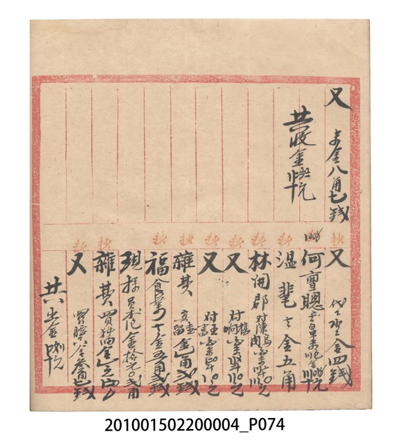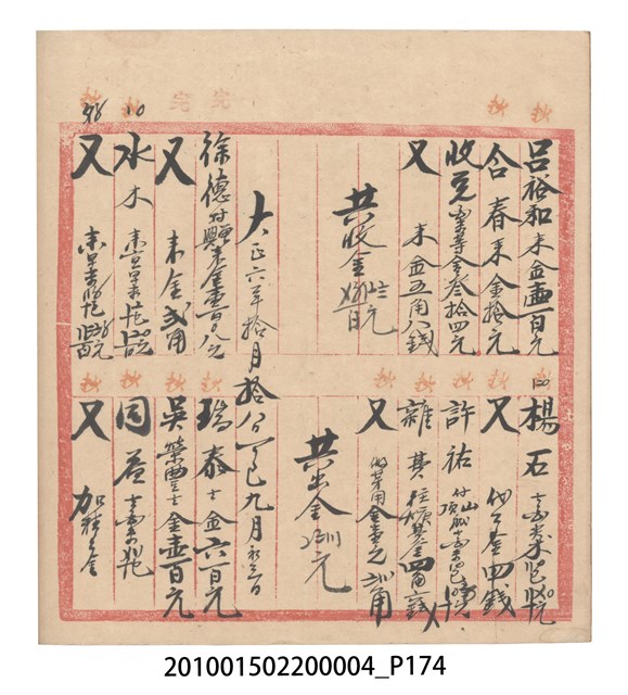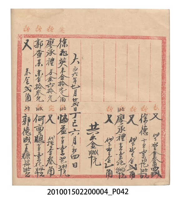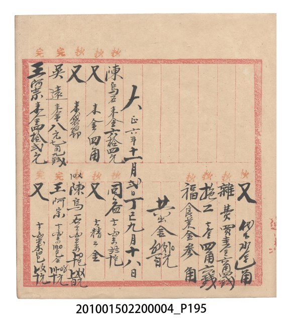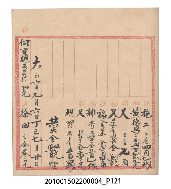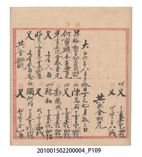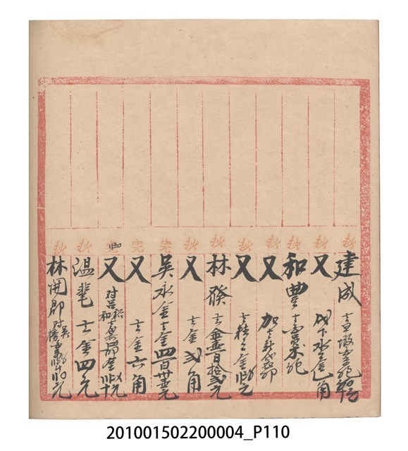 本物件為瑞興商店大正六年丁巳蒲月弍部日清,該書以棉線裝訂,封面、封底為藍色,頂邊題有瑞興商店大正六年丁巳蒲月弍部日清字樣,內容涵蓋首行瑞興商店大正6年丁巳蒲月立弍部日清 承首部日清尾存金968元8角8錢也。大正6年6月29日丁巳5月11日大吉利市上欄收入劉胡、呂裕和等費用;下欄支出和豐、劉文、溫靟、林開郡、雜費、福食等費用。大正6年6月30日丁巳5月12日上欄收入兌●●●金等費用;下欄支出瑞泰、林開郡等費用。大正6年7月1日丁巳5月13日上欄收入何亶聰、東興等費用;下欄支出劉文、和豐等費用。大正6年7月2日丁巳5月134日上欄收入吉井、瑞泰、高英等費用;下欄支出劉文、吳長盛等費用。總計原金、收金、出金、存金。