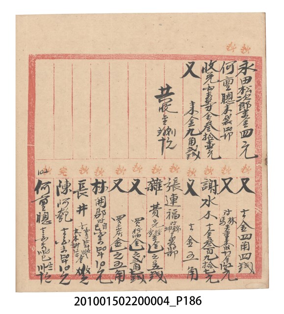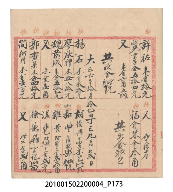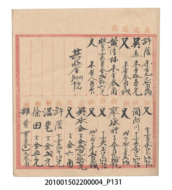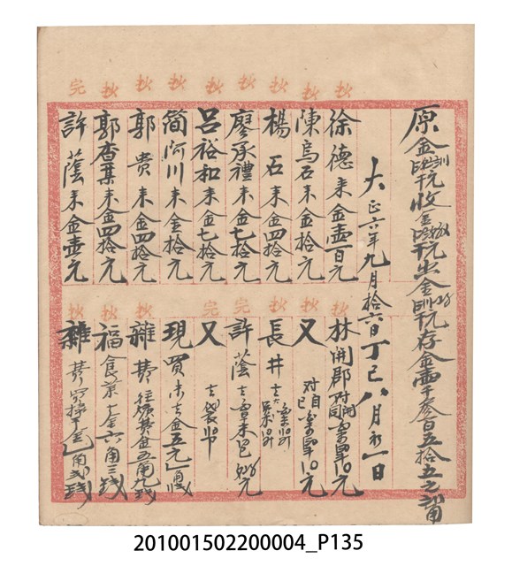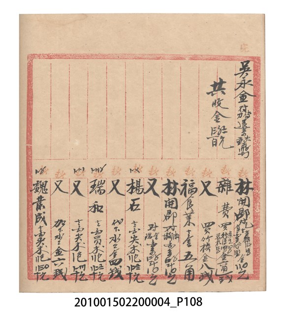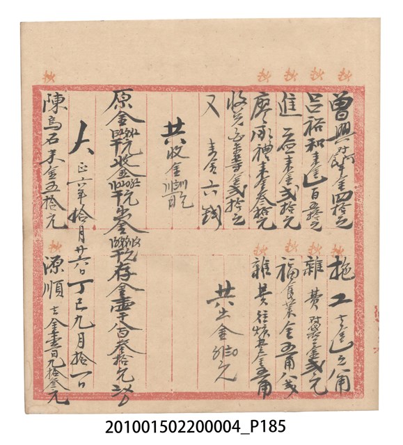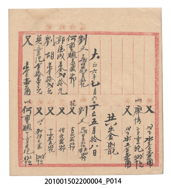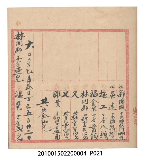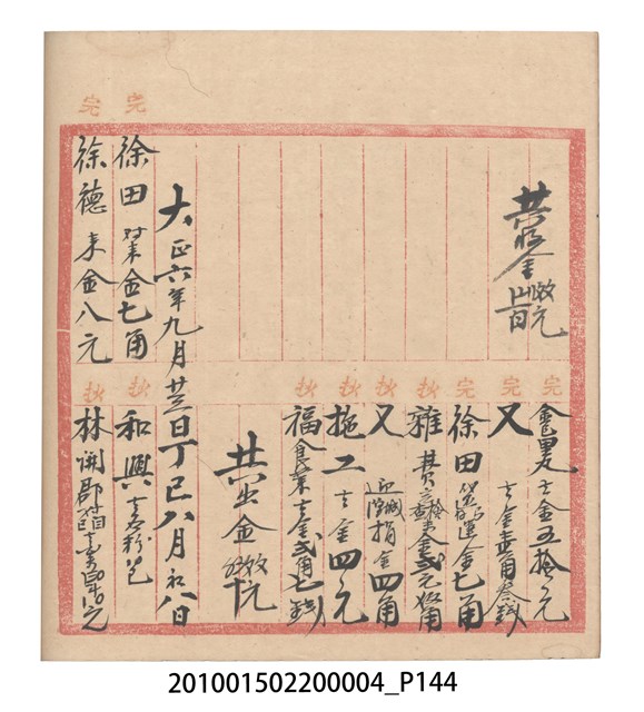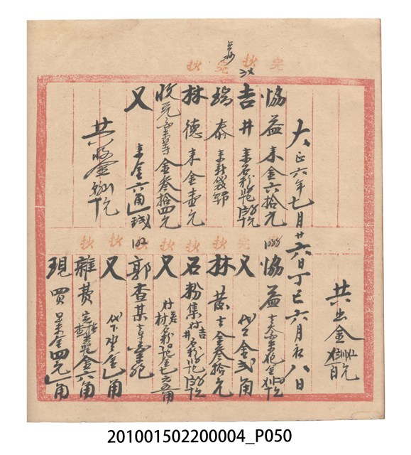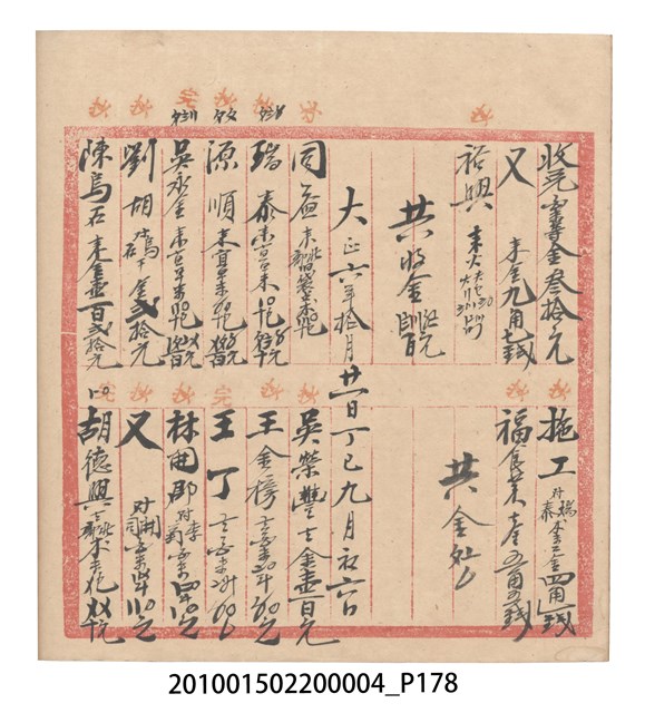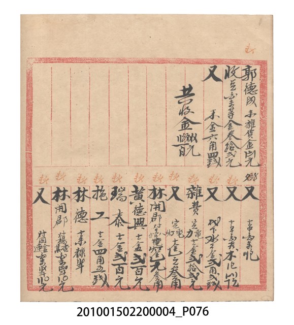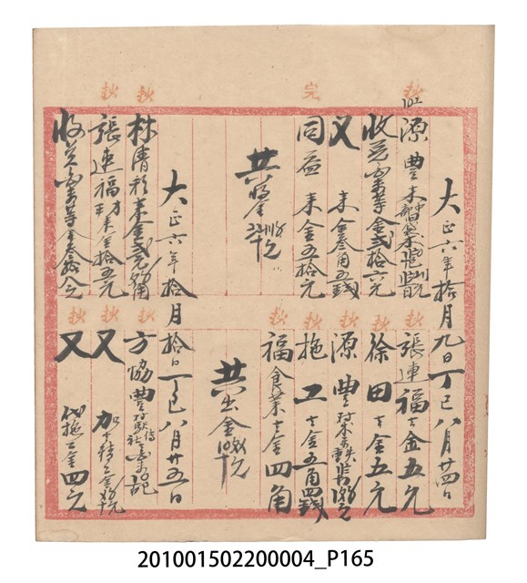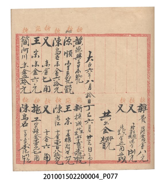 本物件為瑞興商店大正六年丁巳蒲月弍部日清,該書以棉線裝訂,封面、封底為藍色,頂邊題有瑞興商店大正六年丁巳蒲月弍部日清字樣,內容涵蓋首行瑞興商店大正6年丁巳蒲月立弍部日清 承首部日清尾存金968元8角8錢也。大正6年6月29日丁巳5月11日大吉利市上欄收入劉胡、呂裕和等費用;下欄支出和豐、劉文、溫靟、林開郡、雜費、福食等費用。大正6年6月30日丁巳5月12日上欄收入兌●●●金等費用;下欄支出瑞泰、林開郡等費用。大正6年7月1日丁巳5月13日上欄收入何亶聰、東興等費用;下欄支出劉文、和豐等費用。大正6年7月2日丁巳5月134日上欄收入吉井、瑞泰、高英等費用;下欄支出劉文、吳長盛等費用。總計原金、收金、出金、存金。