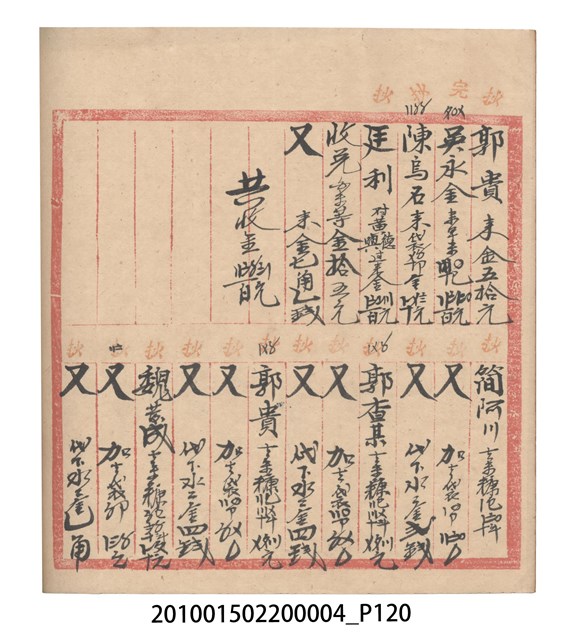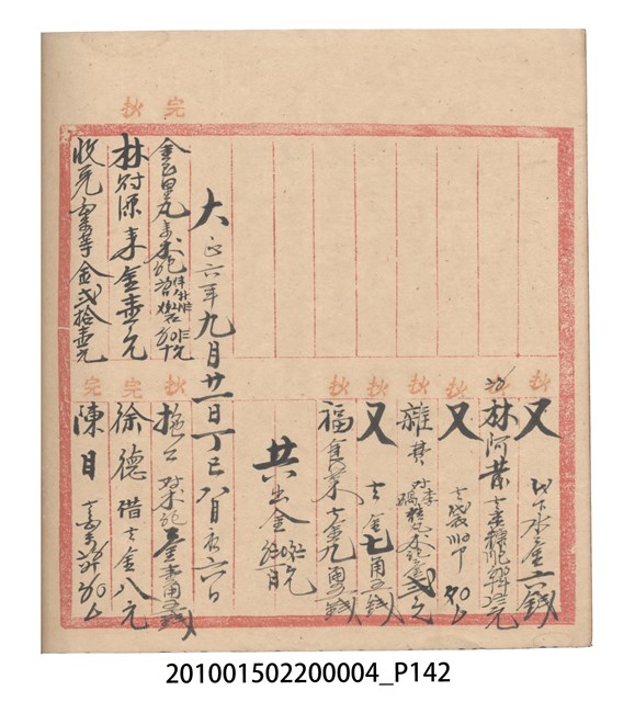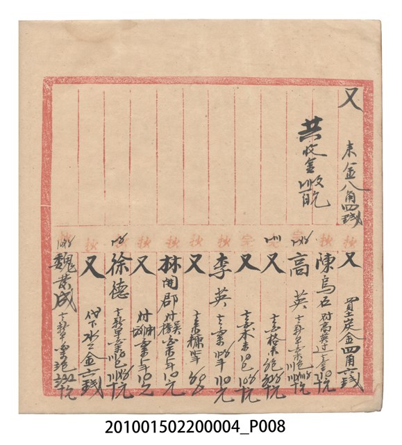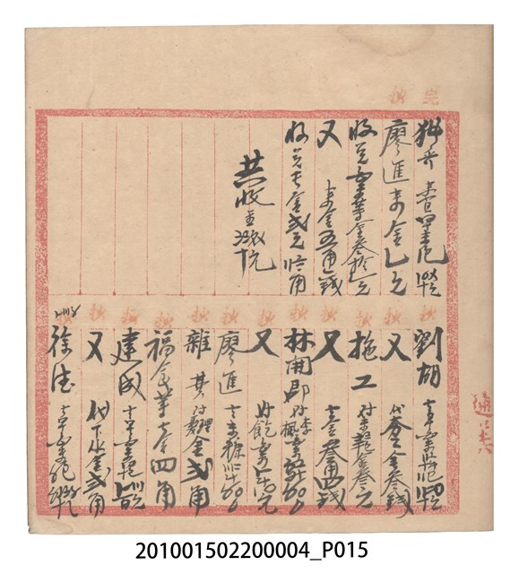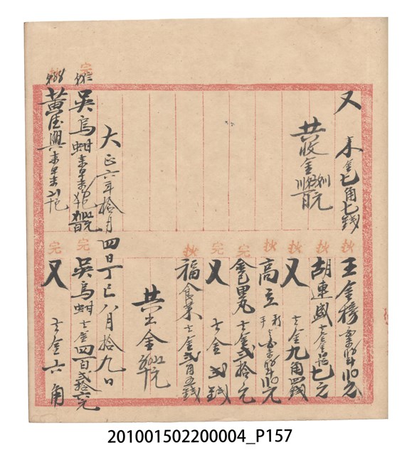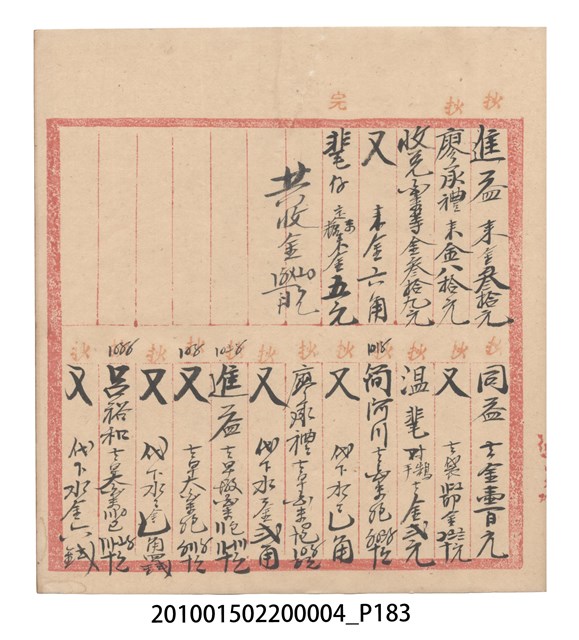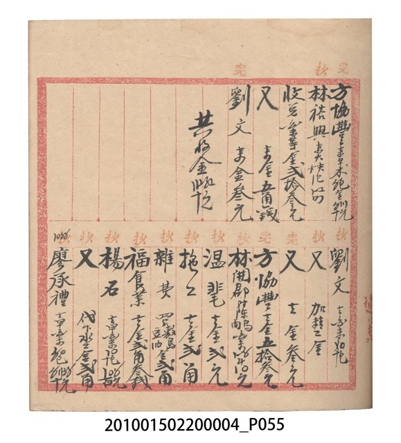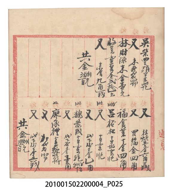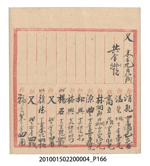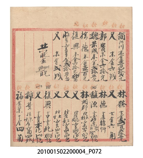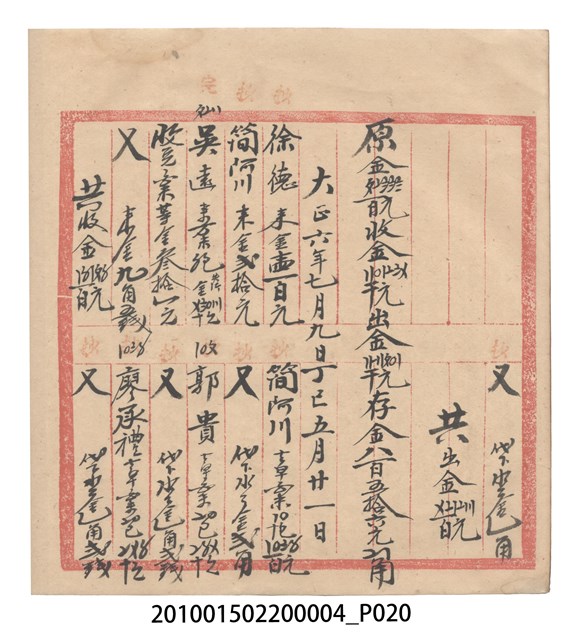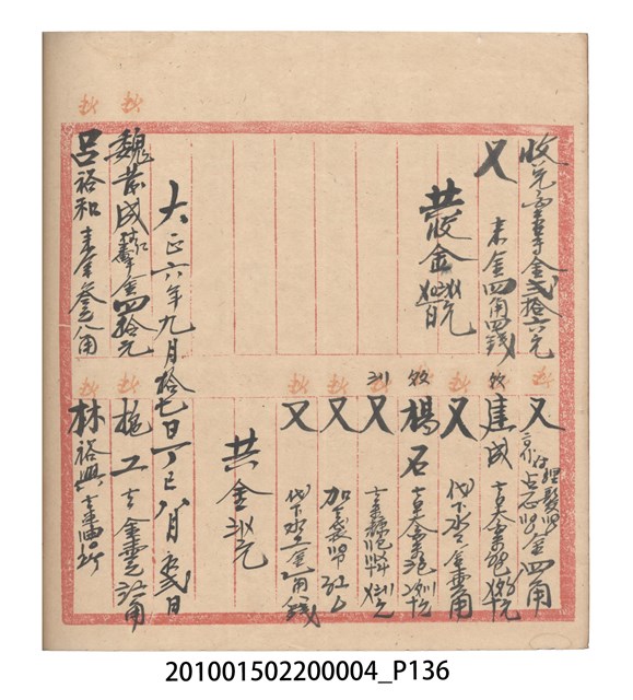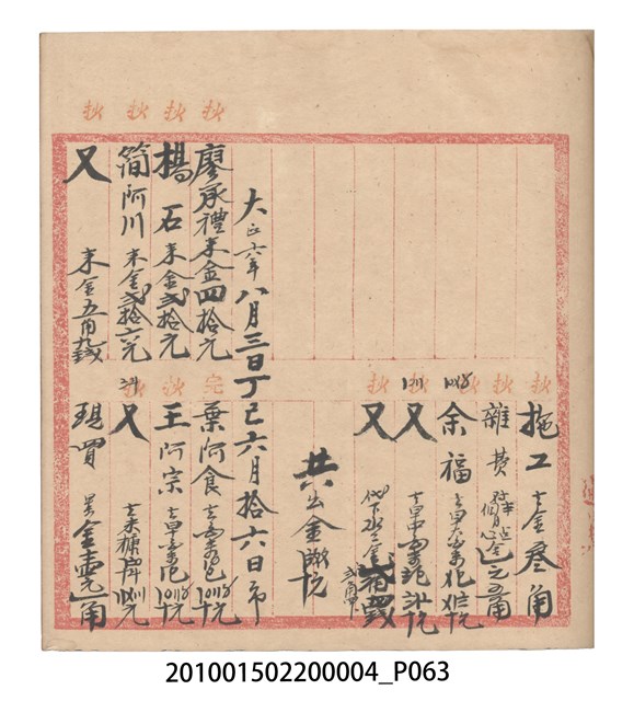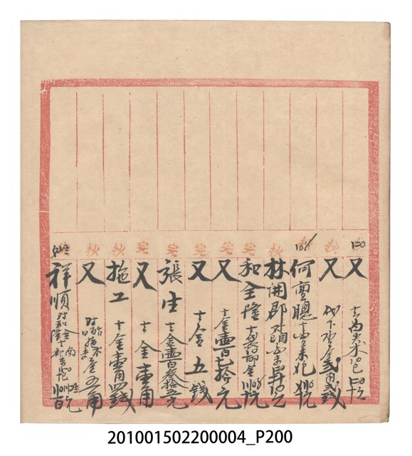 本物件為瑞興商店大正六年丁巳蒲月弍部日清,該書以棉線裝訂,封面、封底為藍色,頂邊題有瑞興商店大正六年丁巳蒲月弍部日清字樣,內容涵蓋首行瑞興商店大正6年丁巳蒲月立弍部日清 承首部日清尾存金968元8角8錢也。大正6年6月29日丁巳5月11日大吉利市上欄收入劉胡、呂裕和等費用;下欄支出和豐、劉文、溫靟、林開郡、雜費、福食等費用。大正6年6月30日丁巳5月12日上欄收入兌●●●金等費用;下欄支出瑞泰、林開郡等費用。大正6年7月1日丁巳5月13日上欄收入何亶聰、東興等費用;下欄支出劉文、和豐等費用。大正6年7月2日丁巳5月134日上欄收入吉井、瑞泰、高英等費用;下欄支出劉文、吳長盛等費用。總計原金、收金、出金、存金。