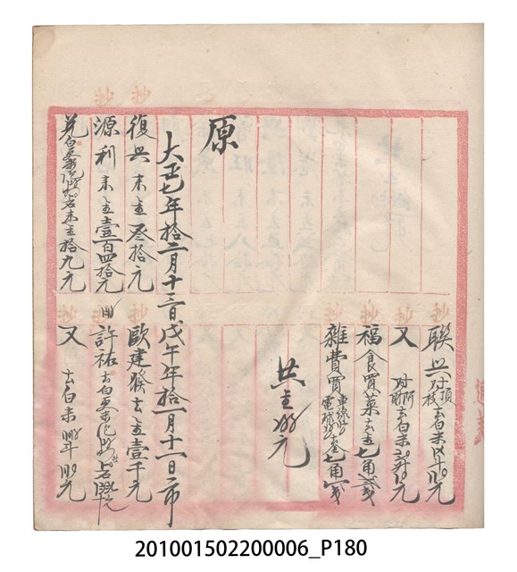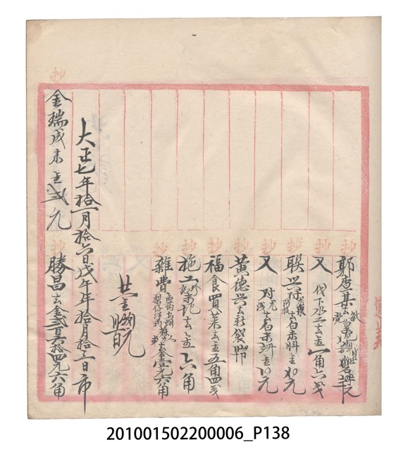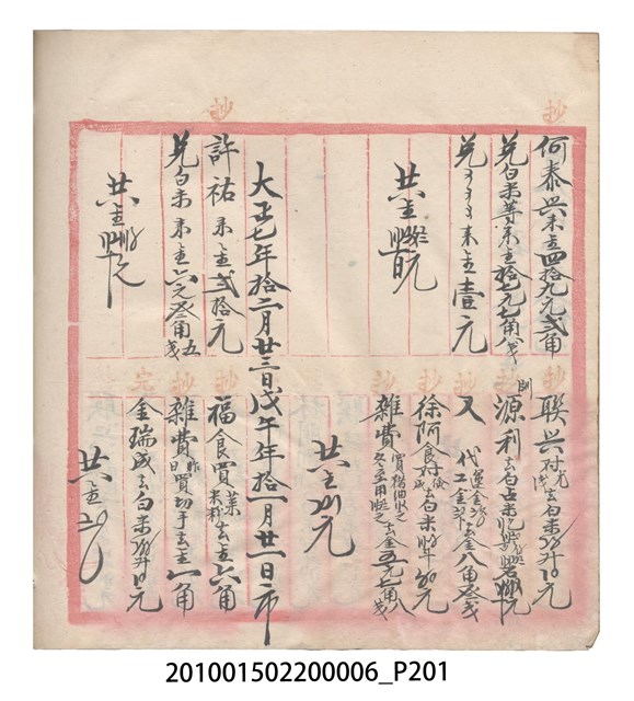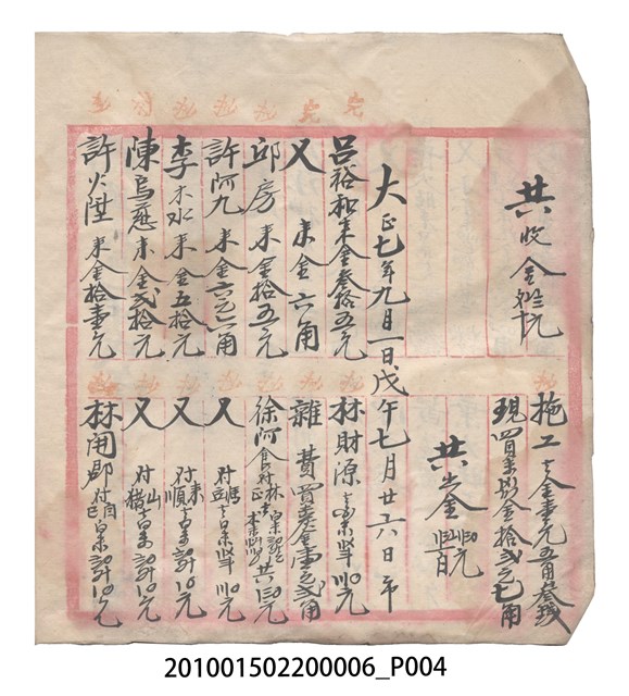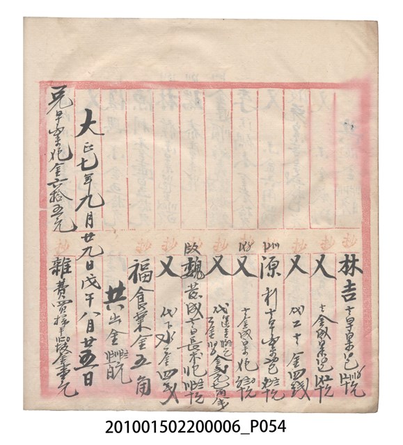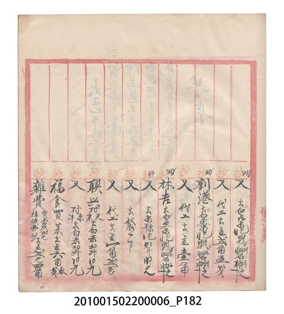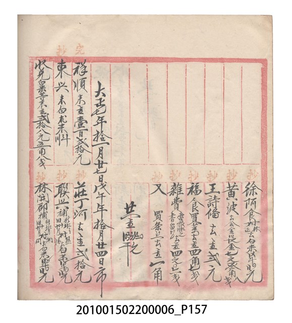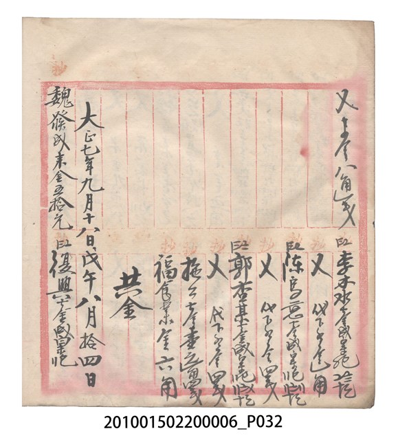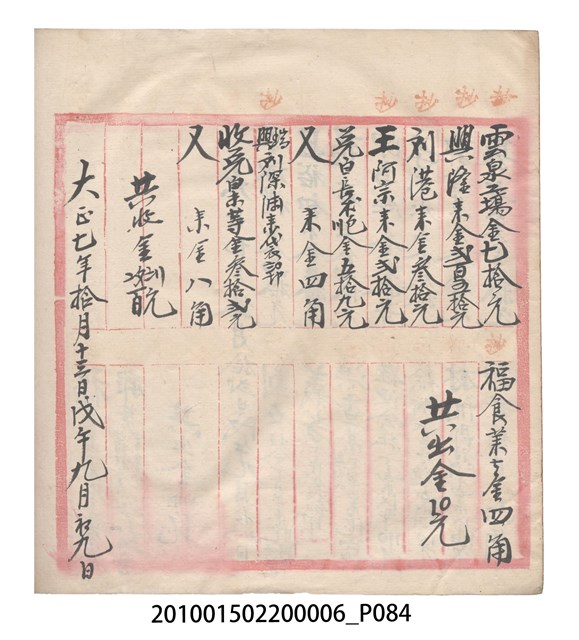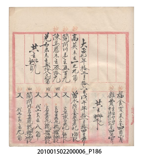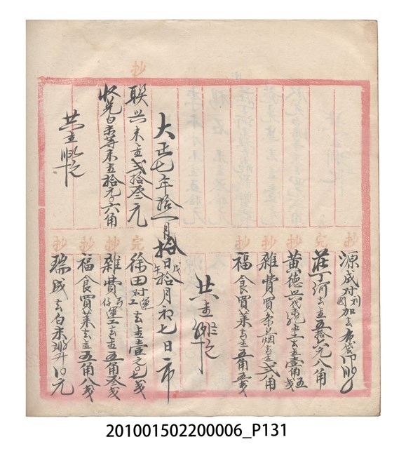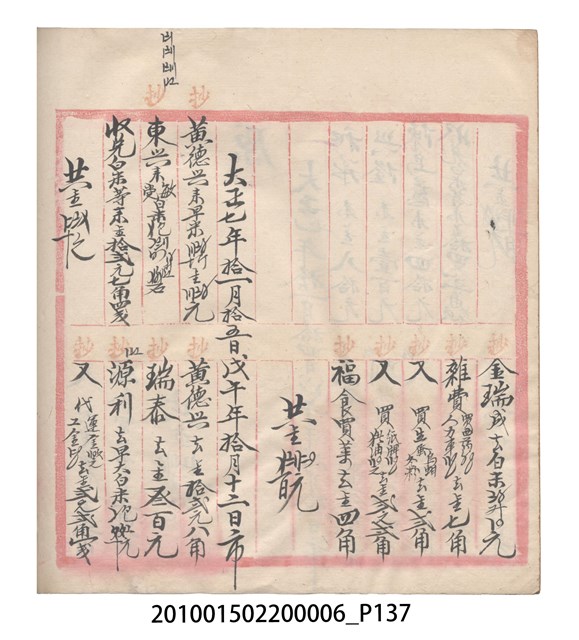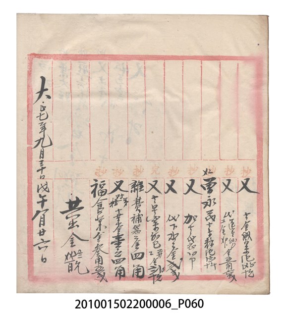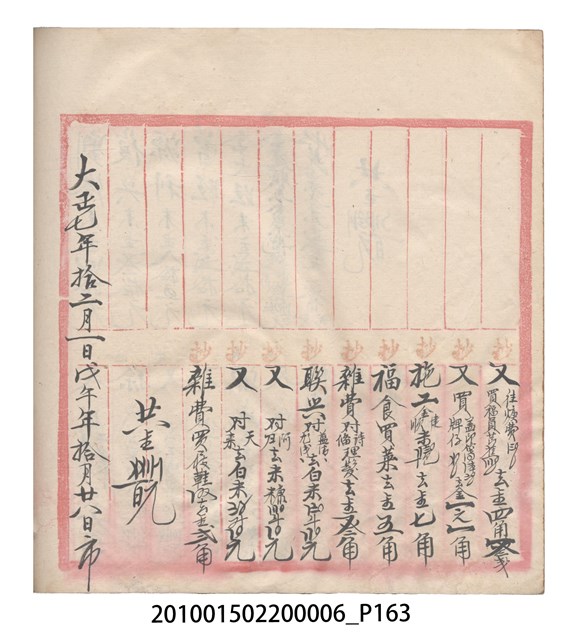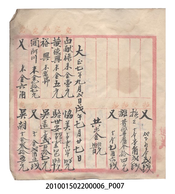 本物件為瑞興大正七年戊午瓜月弍部日清,該書以棉線裝訂,封面為藍色,無封底破損,書背破損,頂邊題有瑞興大正七年戊午瓜月弍部日清字樣,內容涵蓋首行瑞興大正七年戊午瓜月立弍部日清 承首部日清尾存金 大正7年8月31日戊午七月念五日大吉利市上欄收入廖承禮、捷順等費用;下欄支出林開郡、和泰興、陳東興、黃德興等費用。大正7年9月1日戊午7月26日上欄收入呂裕和、邱房、許阿九、李木水等費用;下欄支出林財源、雜費、徐阿食、林開郡等費用。大正7年9月2日戊午7月27日上欄收入白献祿、黃德興、裕興、簡阿川等費用;下欄支出協美、駱世安、吳遠等費用。