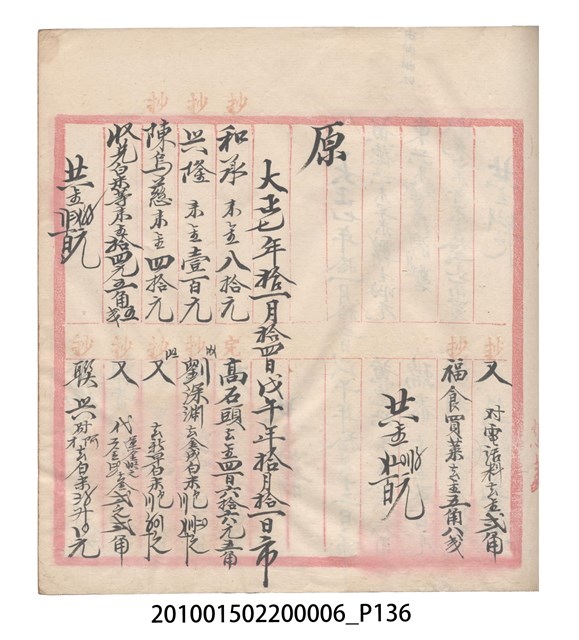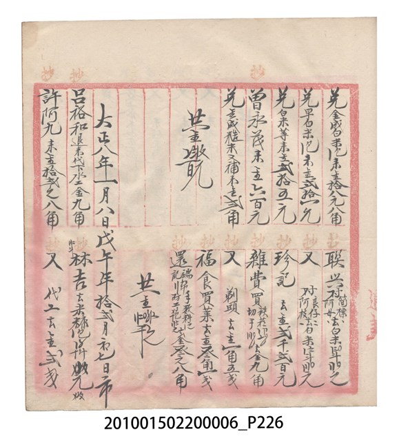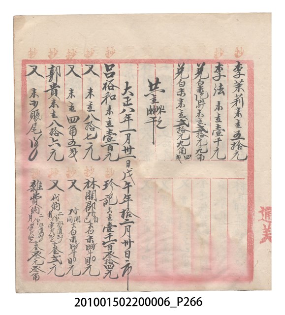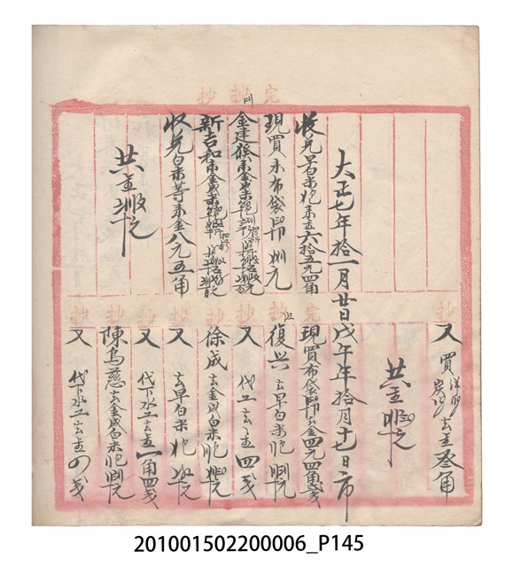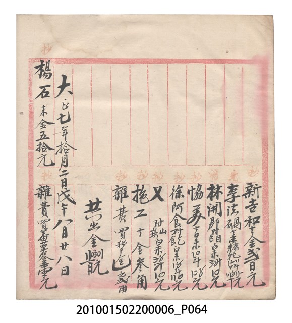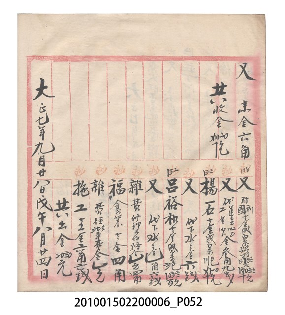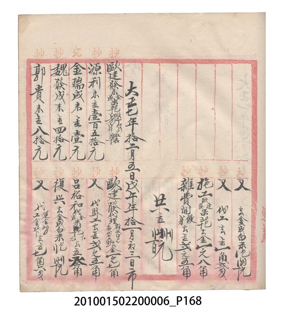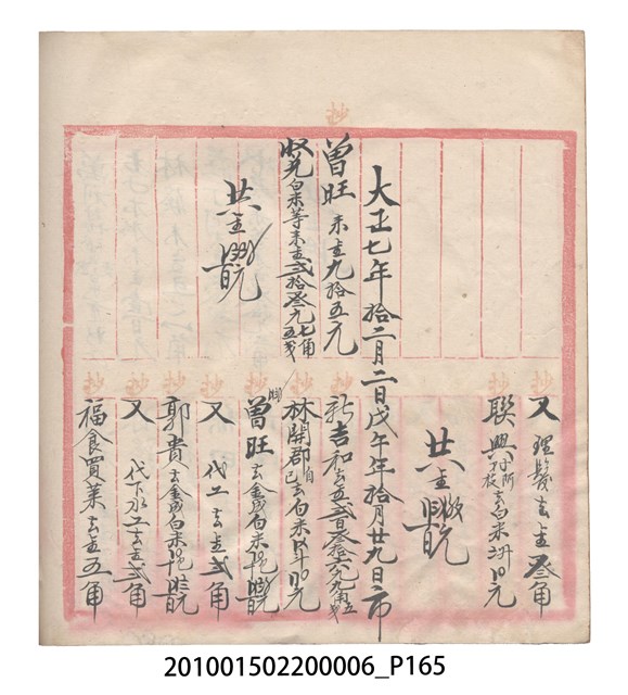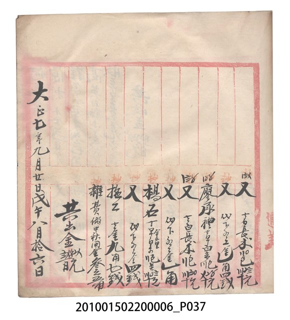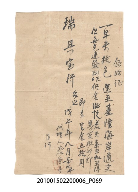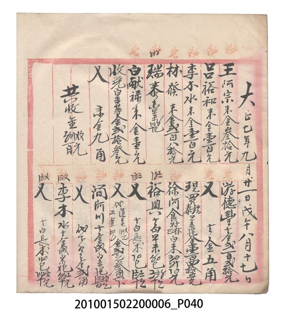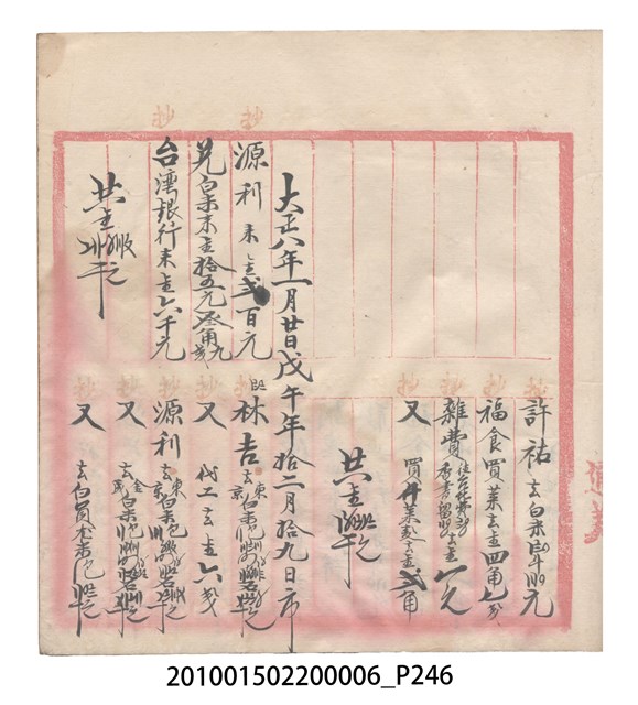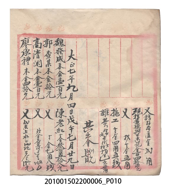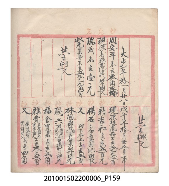 本物件為瑞興大正七年戊午瓜月弍部日清,該書以棉線裝訂,封面為藍色,無封底破損,書背破損,頂邊題有瑞興大正七年戊午瓜月弍部日清字樣,內容涵蓋首行瑞興大正七年戊午瓜月立弍部日清 承首部日清尾存金 大正7年8月31日戊午七月念五日大吉利市上欄收入廖承禮、捷順等費用;下欄支出林開郡、和泰興、陳東興、黃德興等費用。大正7年9月1日戊午7月26日上欄收入呂裕和、邱房、許阿九、李木水等費用;下欄支出林財源、雜費、徐阿食、林開郡等費用。大正7年9月2日戊午7月27日上欄收入白献祿、黃德興、裕興、簡阿川等費用;下欄支出協美、駱世安、吳遠等費用。
