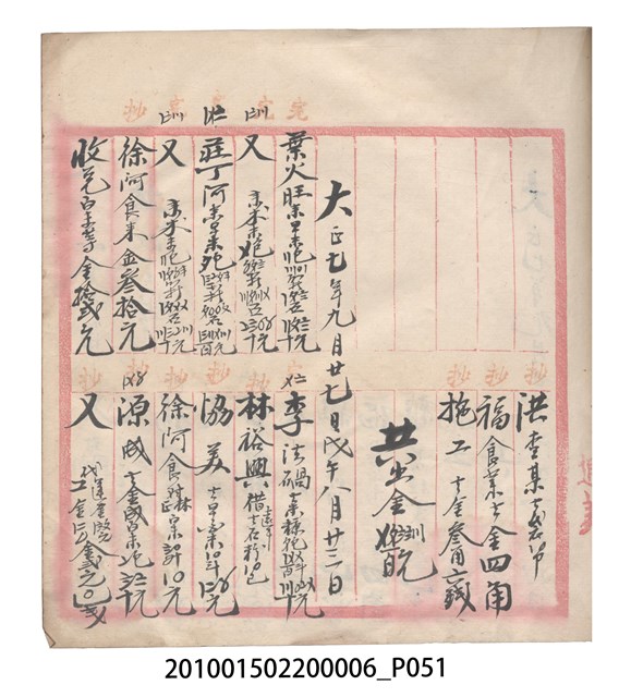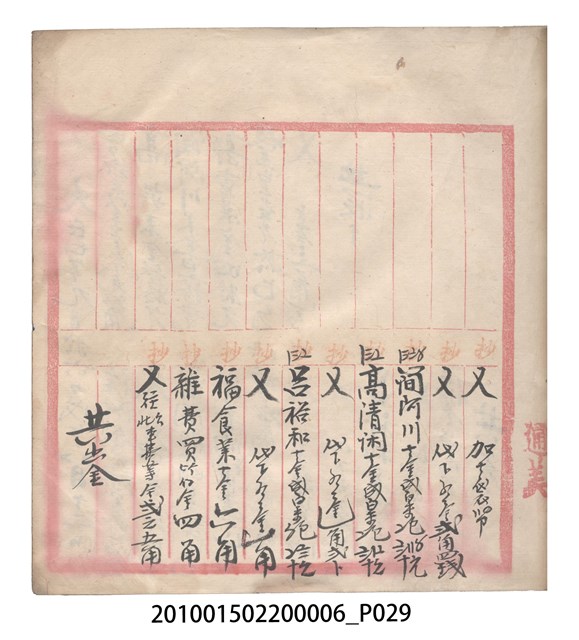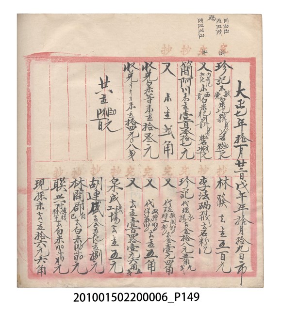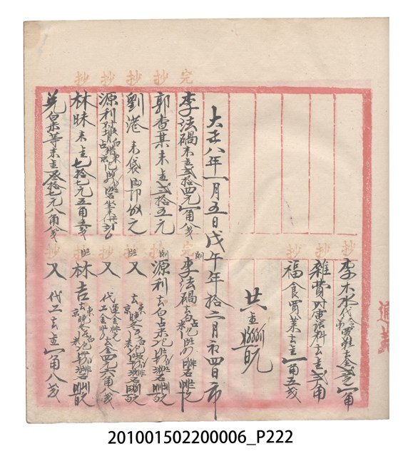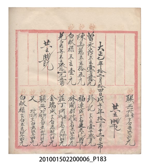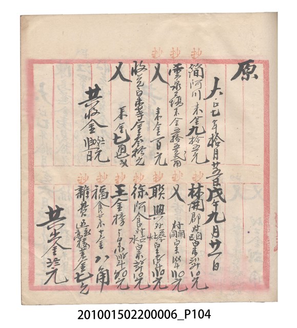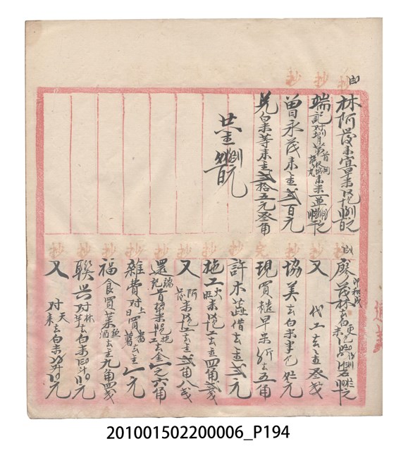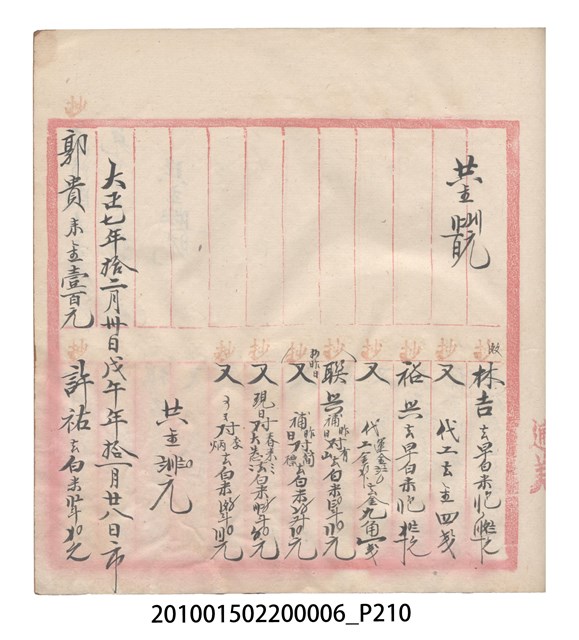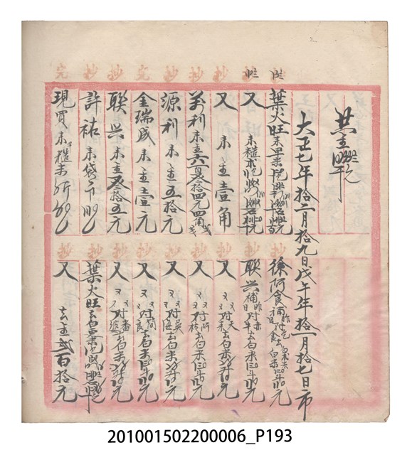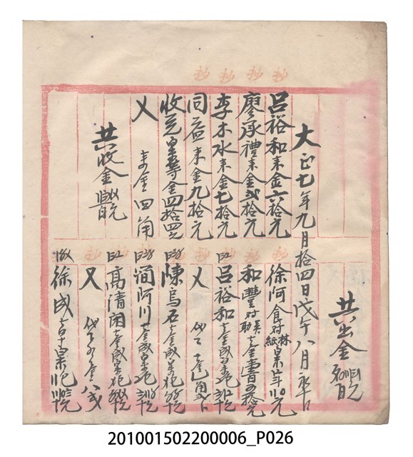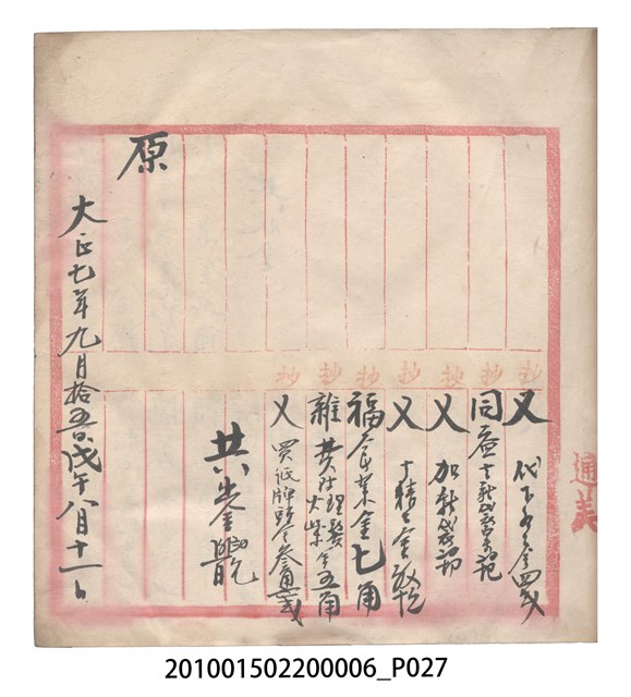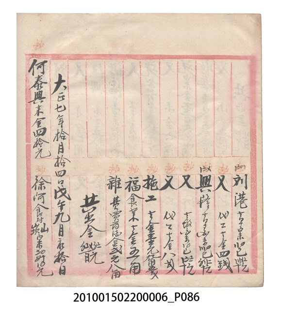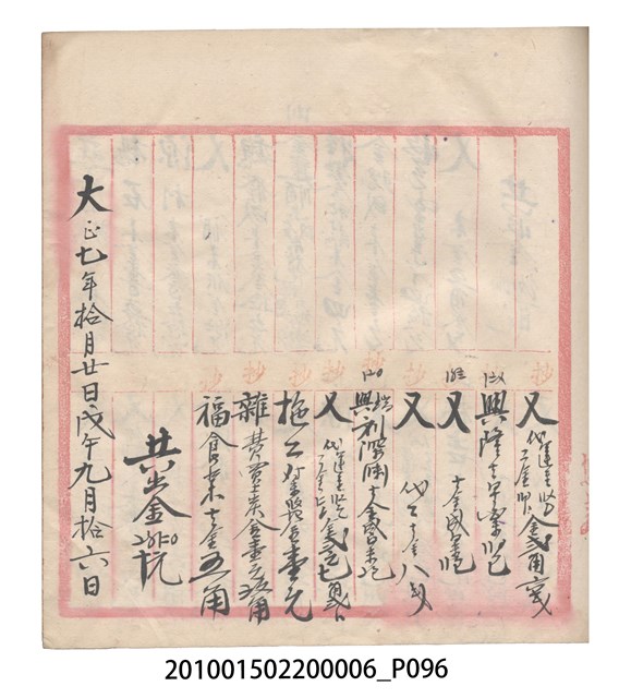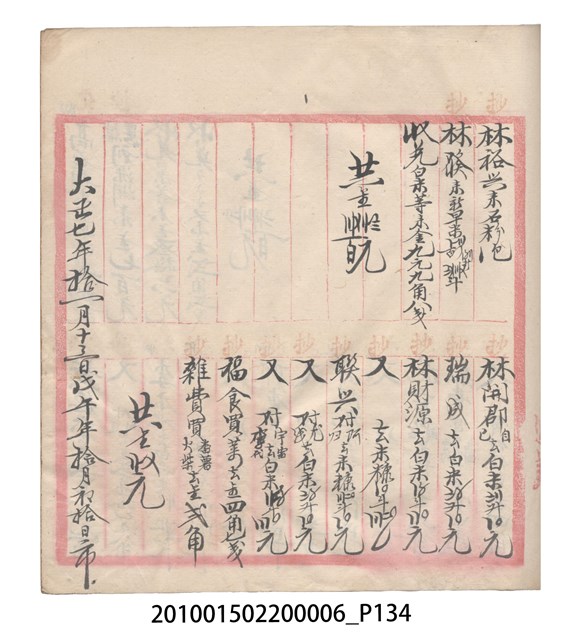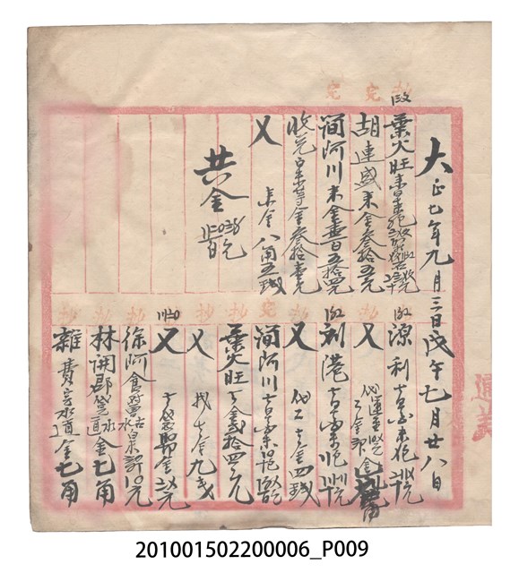 本物件為瑞興大正七年戊午瓜月弍部日清,該書以棉線裝訂,封面為藍色,無封底破損,書背破損,頂邊題有瑞興大正七年戊午瓜月弍部日清字樣,內容涵蓋首行瑞興大正七年戊午瓜月立弍部日清 承首部日清尾存金 大正7年8月31日戊午七月念五日大吉利市上欄收入廖承禮、捷順等費用;下欄支出林開郡、和泰興、陳東興、黃德興等費用。大正7年9月1日戊午7月26日上欄收入呂裕和、邱房、許阿九、李木水等費用;下欄支出林財源、雜費、徐阿食、林開郡等費用。大正7年9月2日戊午7月27日上欄收入白献祿、黃德興、裕興、簡阿川等費用;下欄支出協美、駱世安、吳遠等費用。