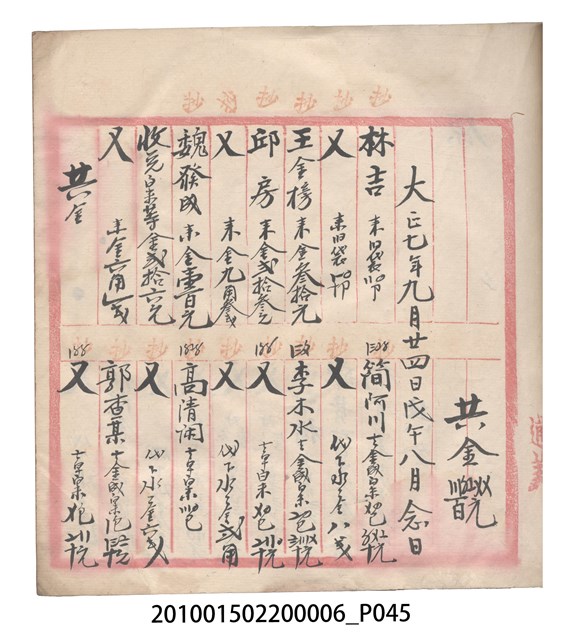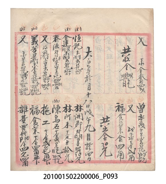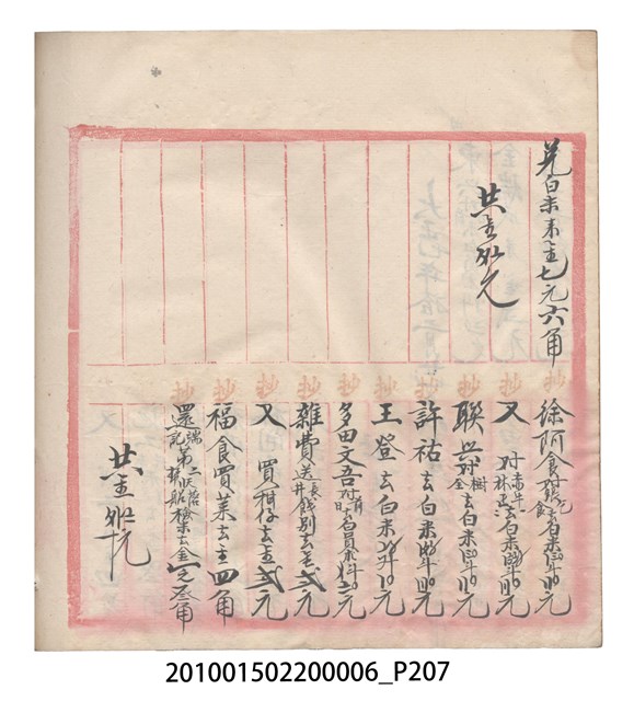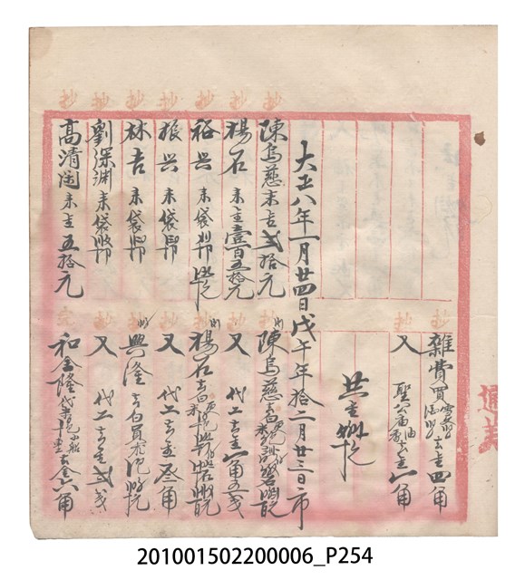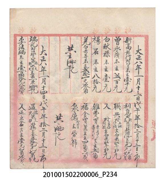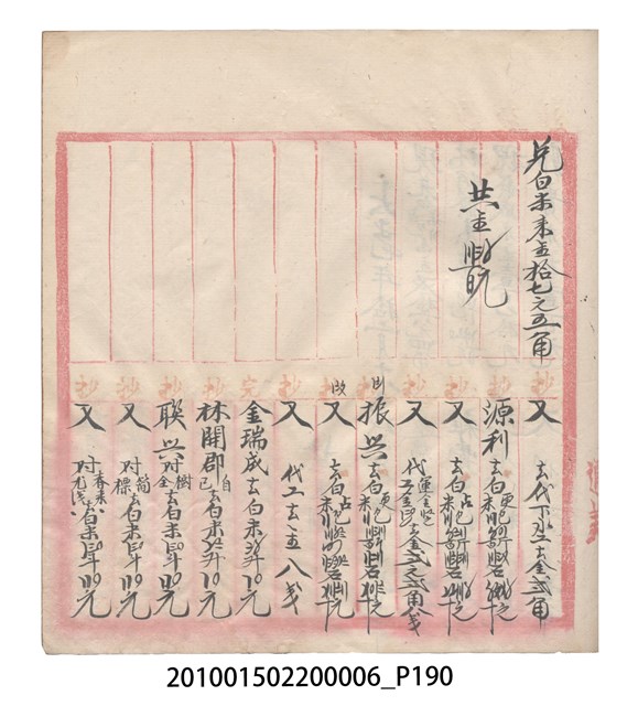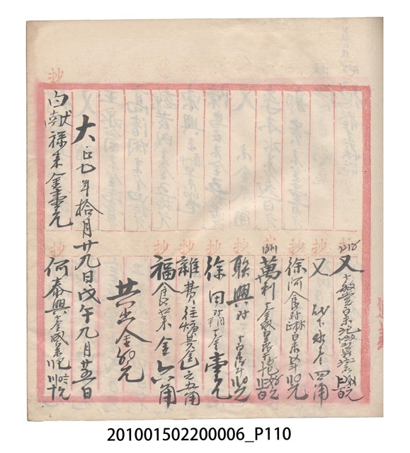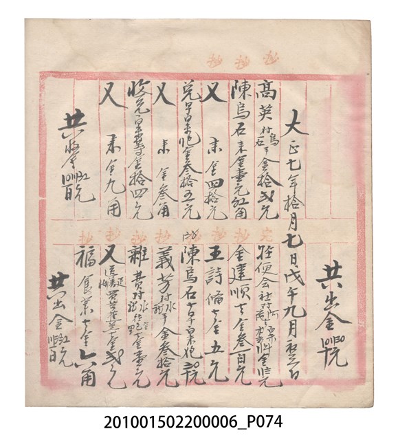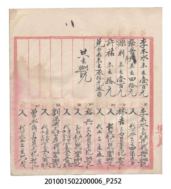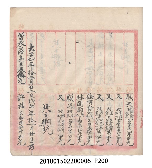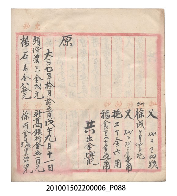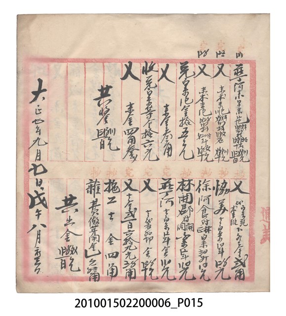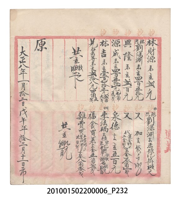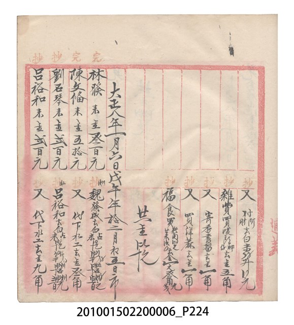 本物件為瑞興大正七年戊午瓜月弍部日清,該書以棉線裝訂,封面為藍色,無封底破損,書背破損,頂邊題有瑞興大正七年戊午瓜月弍部日清字樣,內容涵蓋首行瑞興大正七年戊午瓜月立弍部日清 承首部日清尾存金 大正7年8月31日戊午七月念五日大吉利市上欄收入廖承禮、捷順等費用;下欄支出林開郡、和泰興、陳東興、黃德興等費用。大正7年9月1日戊午7月26日上欄收入呂裕和、邱房、許阿九、李木水等費用;下欄支出林財源、雜費、徐阿食、林開郡等費用。大正7年9月2日戊午7月27日上欄收入白献祿、黃德興、裕興、簡阿川等費用;下欄支出協美、駱世安、吳遠等費用。