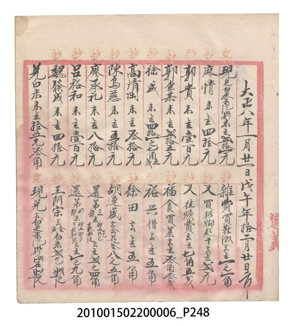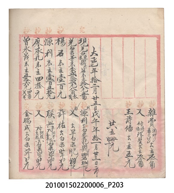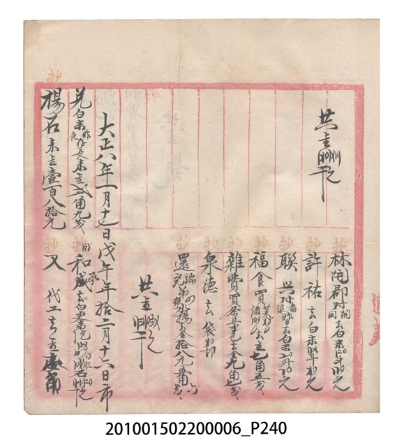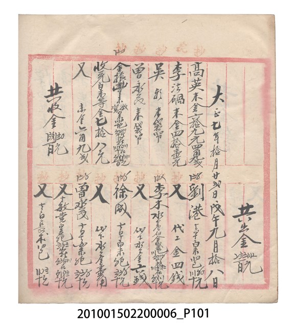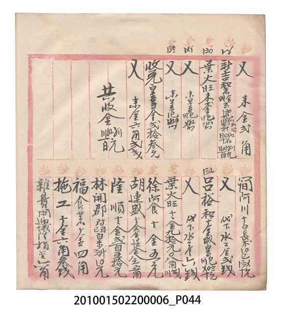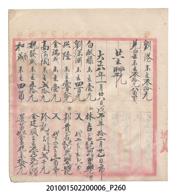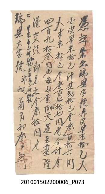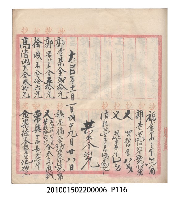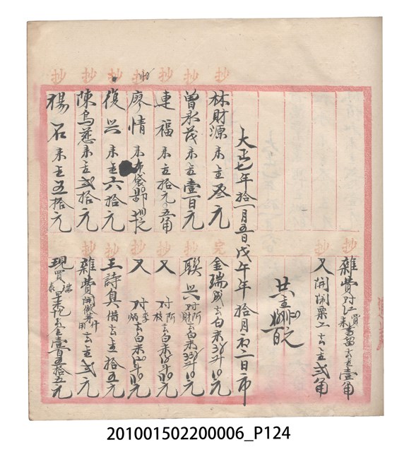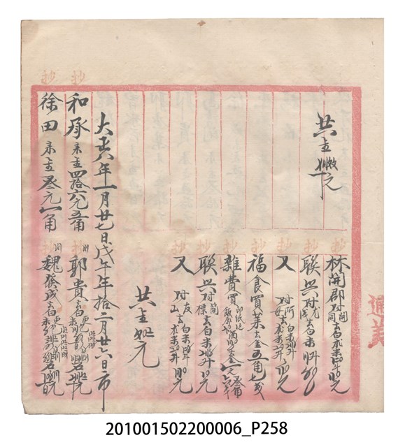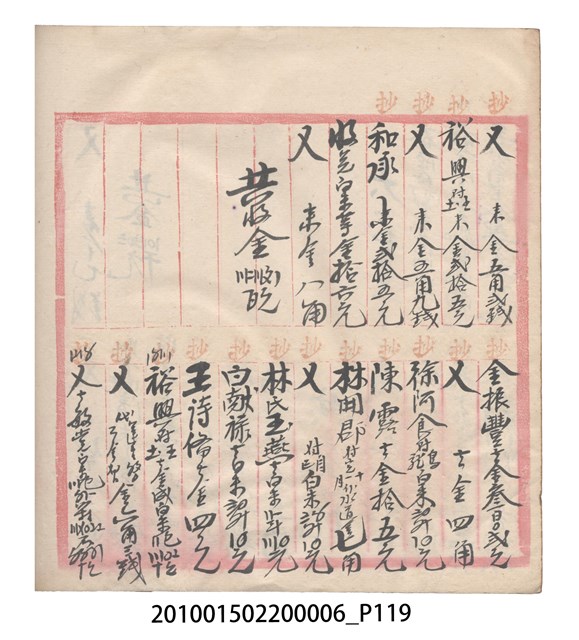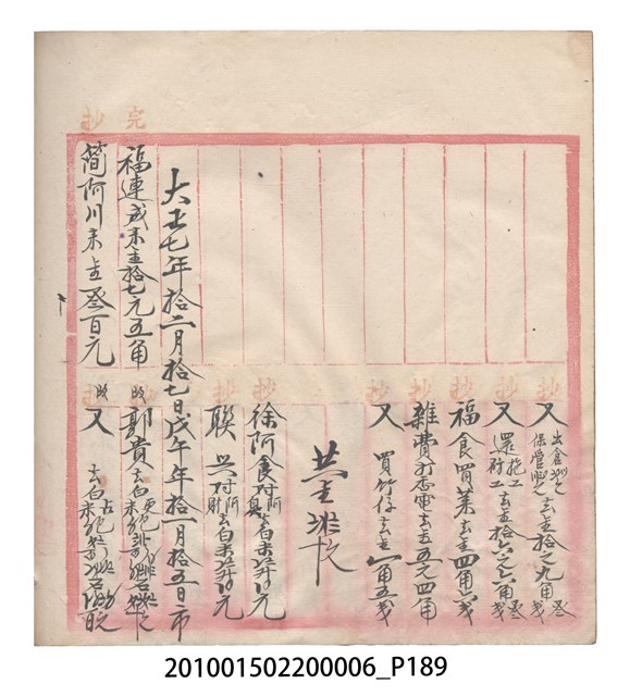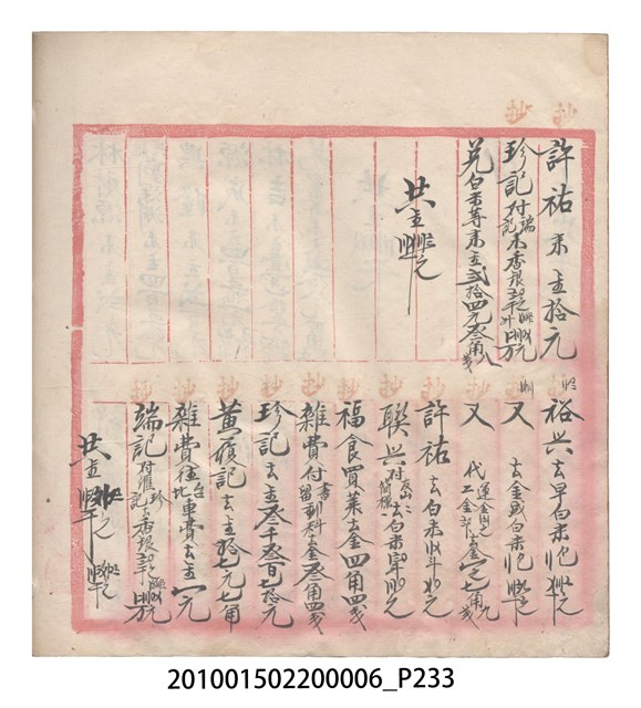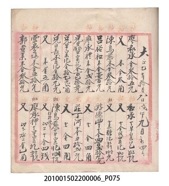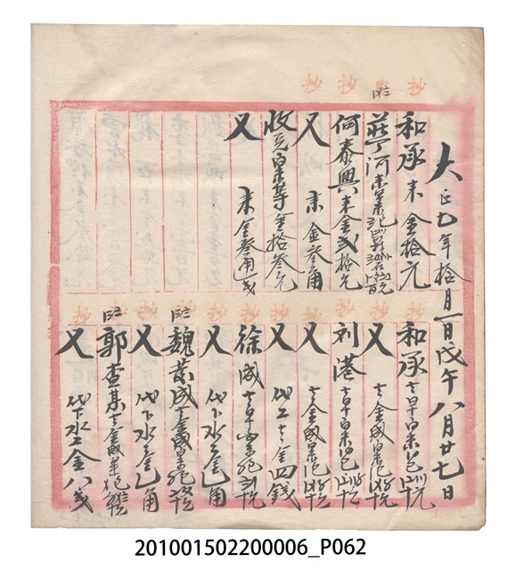 本物件為瑞興大正七年戊午瓜月弍部日清,該書以棉線裝訂,封面為藍色,無封底破損,書背破損,頂邊題有瑞興大正七年戊午瓜月弍部日清字樣,內容涵蓋首行瑞興大正七年戊午瓜月立弍部日清 承首部日清尾存金 大正7年8月31日戊午七月念五日大吉利市上欄收入廖承禮、捷順等費用;下欄支出林開郡、和泰興、陳東興、黃德興等費用。大正7年9月1日戊午7月26日上欄收入呂裕和、邱房、許阿九、李木水等費用;下欄支出林財源、雜費、徐阿食、林開郡等費用。大正7年9月2日戊午7月27日上欄收入白献祿、黃德興、裕興、簡阿川等費用;下欄支出協美、駱世安、吳遠等費用。