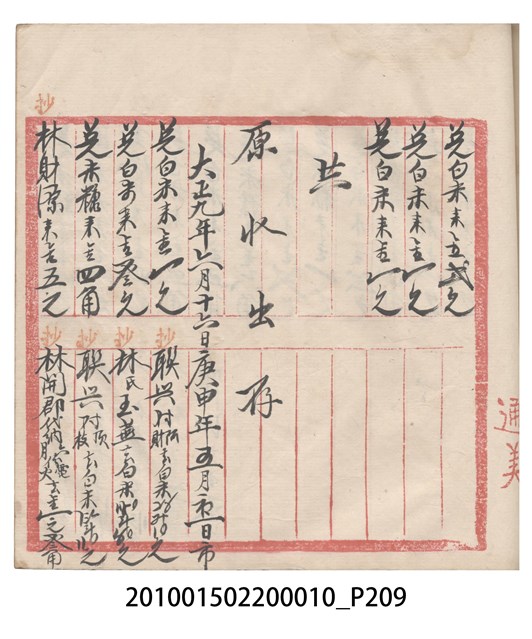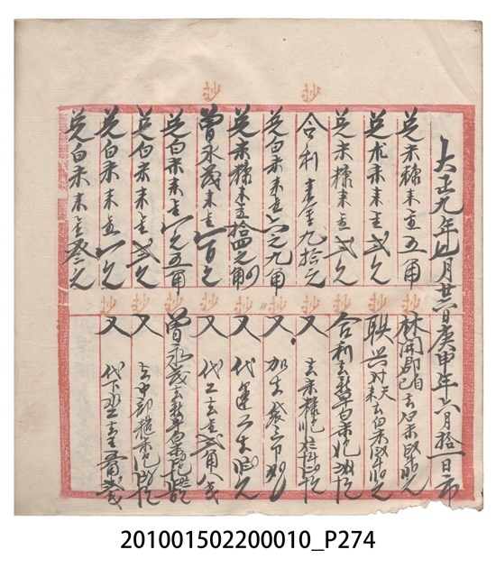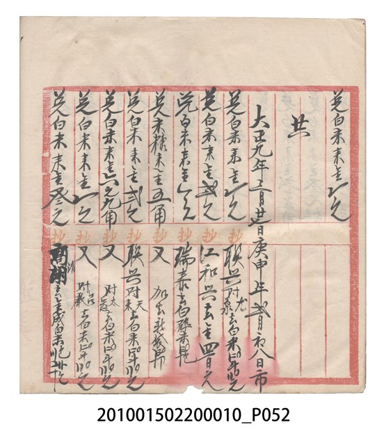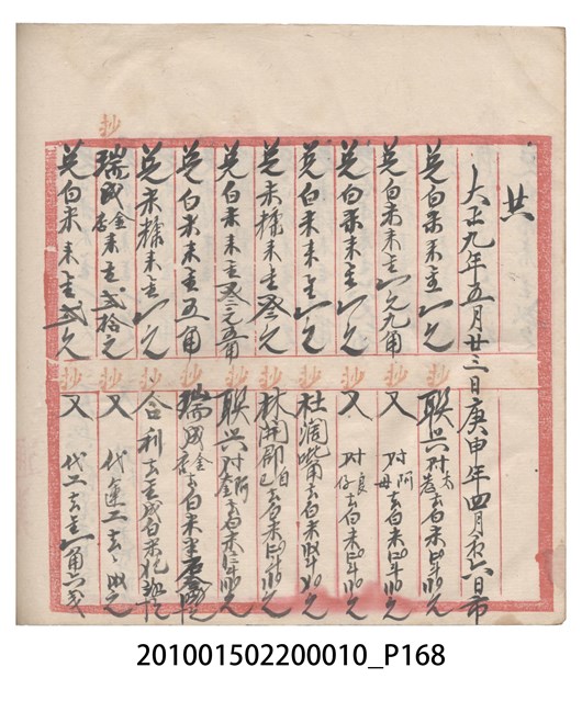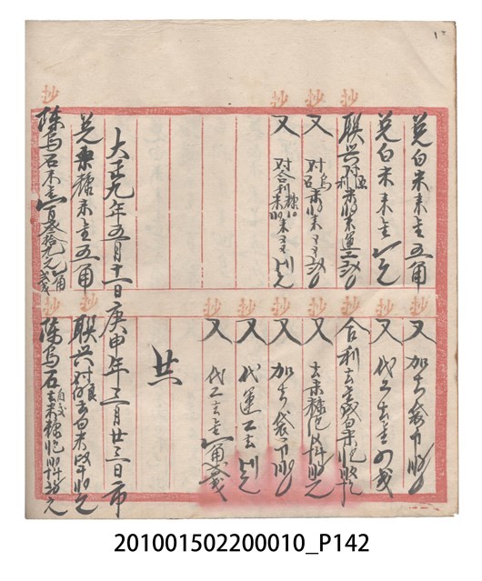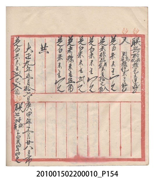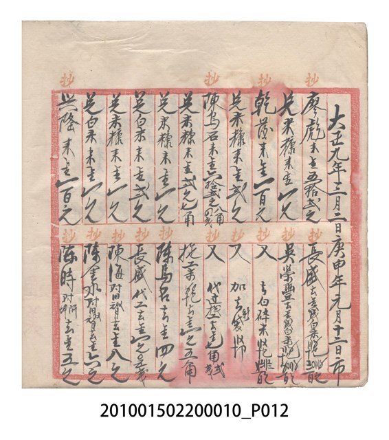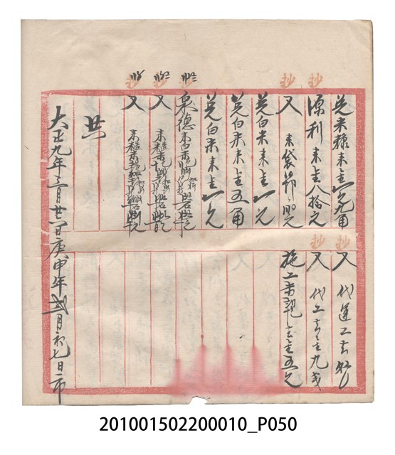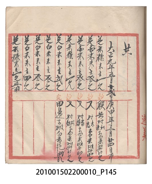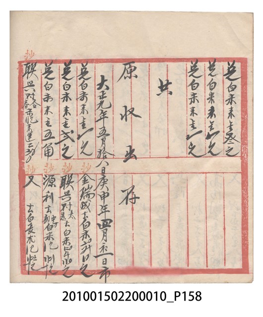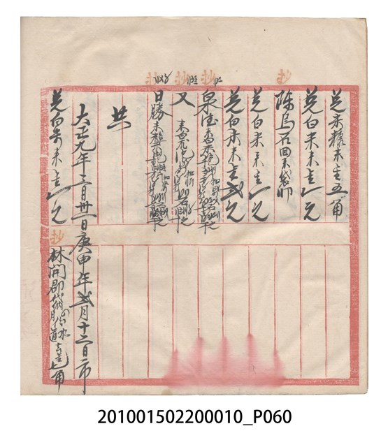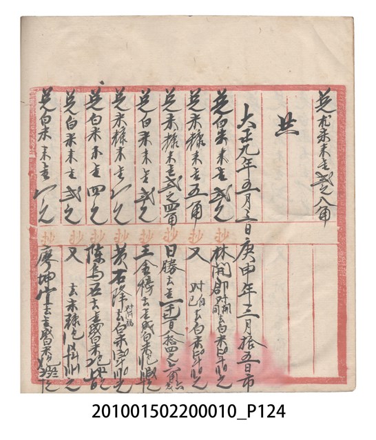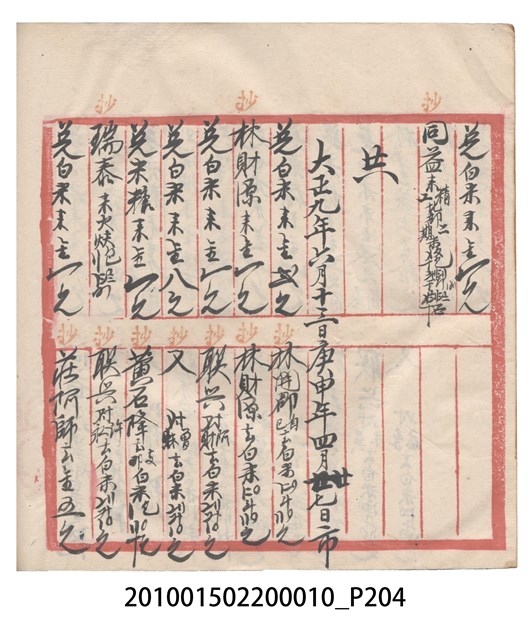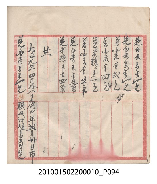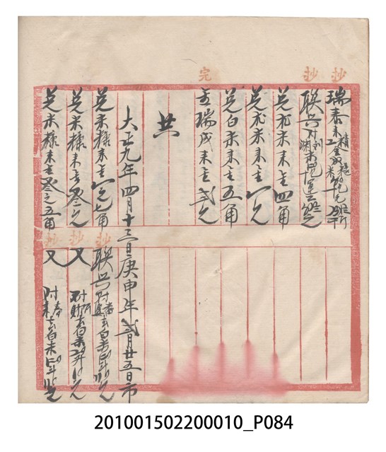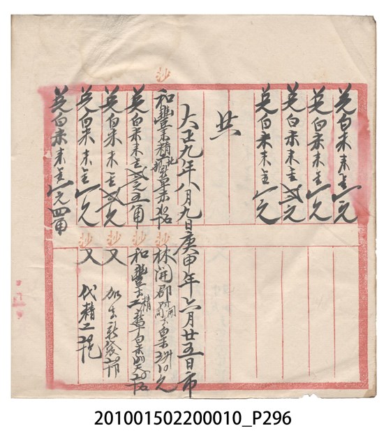 本物件為瑞興大正九年庚申首部日清,該書以棉線裝訂,封面、封底均藍色,封底有蟲蛀破損,頂邊題有瑞興大正九年庚申首部日清字樣,內容涵蓋首行瑞興號大正九年歲次庚申年孟春月立首部日清 承己未年苐叁部日清尾存 大正9年2月20日庚申年元月初一日市上欄共大吉;下欄共大吉。大正9年2月21日庚申年元月初二日市上欄共大吉;下欄支出江和興費用,共吉。大正9年2月22日庚申年元月初三日市上欄收入兌白米費用,共吉;下欄共吉。大正9年2月23日庚申年元月初四日市上欄收入兌白米費用;下欄支出林財源、江和興共吉。大正9年2月24日庚申年元月初五日市上欄收入兌●米、泉德費用;下欄支出拖工費用。大正9年2月25日庚申年元月初六日市上欄收入兌白米、江和興等費用;下欄支出江和興、聯興等費用。大正9年2月26日庚申年元月初七日市上欄收入兌糙米、兌白米、兌米糠費用;下欄支出聯興、吳榮豐、郭成利等費用。大正9年2月28日庚申年元月初九日市上欄收吳榮豐、兌米糠、王義成、兌白米等費用;下欄支出林氏玉燕、聯興等費用。大正9年2月29日庚申年元月初十日市上欄收入兌白米、兌米糠等費用;下欄支出聯興、吳榮豐、林開郡等費用。大正9年8月11日庚申年六月廿七日市上欄收入兌白米、兌米糠等費用;下欄支出林阿嬰、聯興等費用。原收出存。 承過苐弍部日清簿。