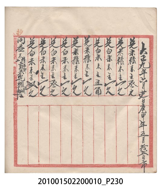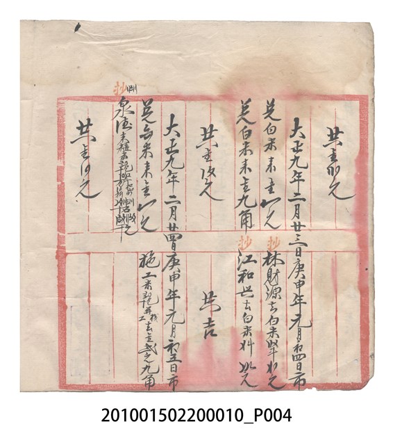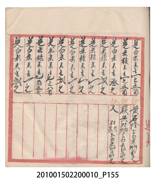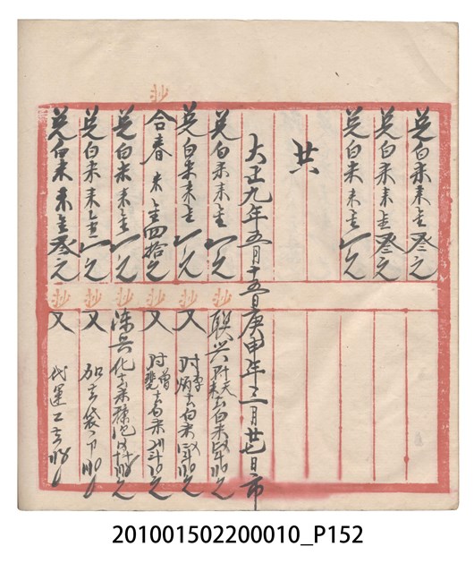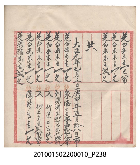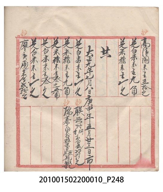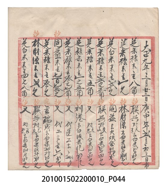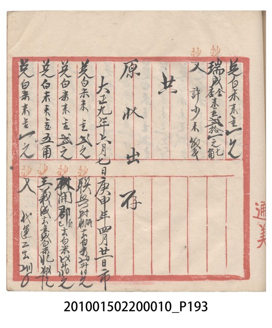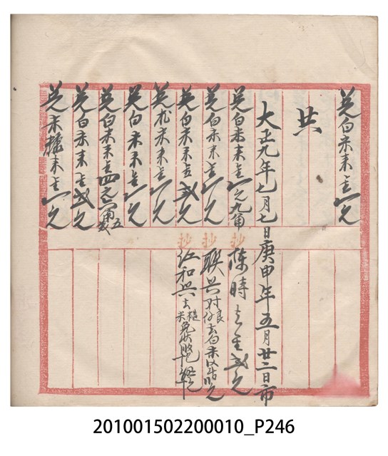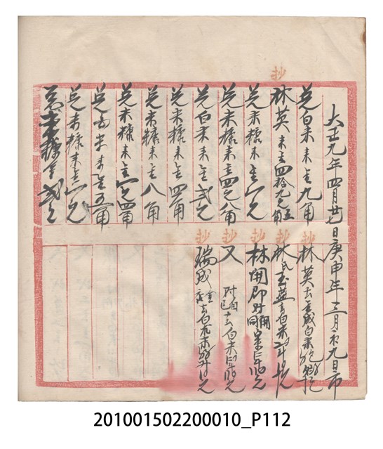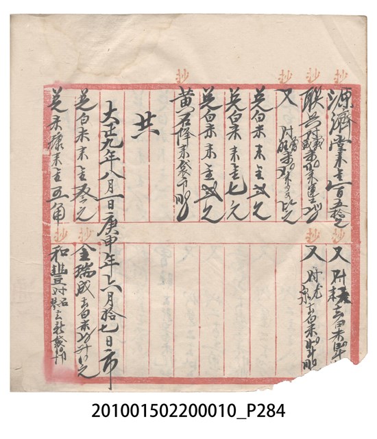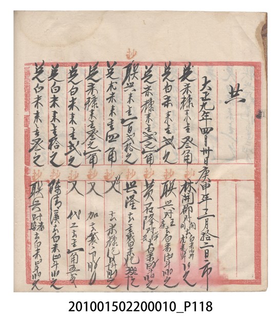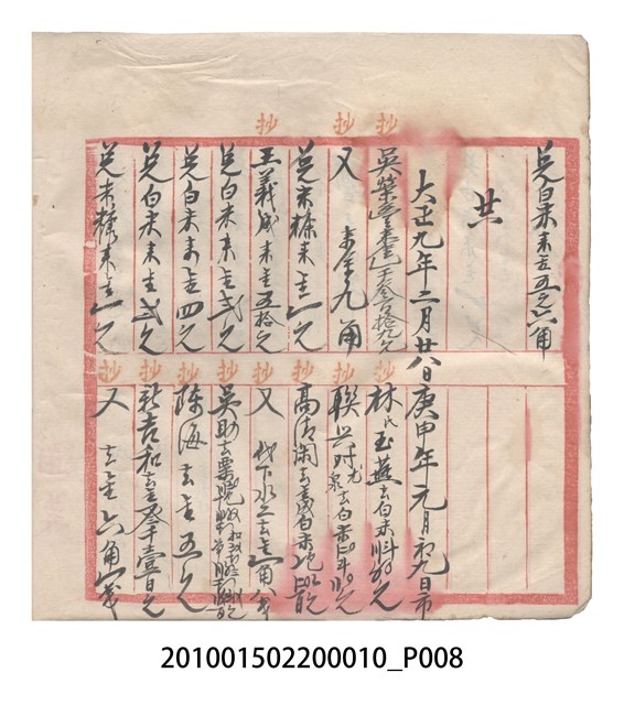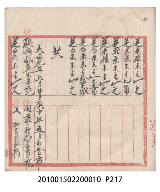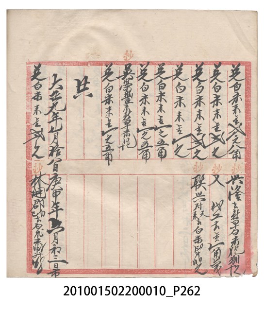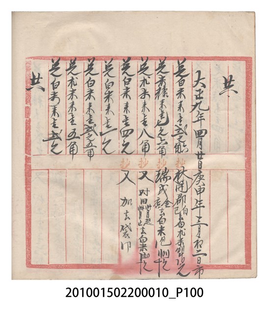 本物件為瑞興大正九年庚申首部日清,該書以棉線裝訂,封面、封底均藍色,封底有蟲蛀破損,頂邊題有瑞興大正九年庚申首部日清字樣,內容涵蓋首行瑞興號大正九年歲次庚申年孟春月立首部日清 承己未年苐叁部日清尾存 大正9年2月20日庚申年元月初一日市上欄共大吉;下欄共大吉。大正9年2月21日庚申年元月初二日市上欄共大吉;下欄支出江和興費用,共吉。大正9年2月22日庚申年元月初三日市上欄收入兌白米費用,共吉;下欄共吉。大正9年2月23日庚申年元月初四日市上欄收入兌白米費用;下欄支出林財源、江和興共吉。大正9年2月24日庚申年元月初五日市上欄收入兌●米、泉德費用;下欄支出拖工費用。大正9年2月25日庚申年元月初六日市上欄收入兌白米、江和興等費用;下欄支出江和興、聯興等費用。大正9年2月26日庚申年元月初七日市上欄收入兌糙米、兌白米、兌米糠費用;下欄支出聯興、吳榮豐、郭成利等費用。大正9年2月28日庚申年元月初九日市上欄收吳榮豐、兌米糠、王義成、兌白米等費用;下欄支出林氏玉燕、聯興等費用。大正9年2月29日庚申年元月初十日市上欄收入兌白米、兌米糠等費用;下欄支出聯興、吳榮豐、林開郡等費用。大正9年8月11日庚申年六月廿七日市上欄收入兌白米、兌米糠等費用;下欄支出林阿嬰、聯興等費用。原收出存。 承過苐弍部日清簿。
