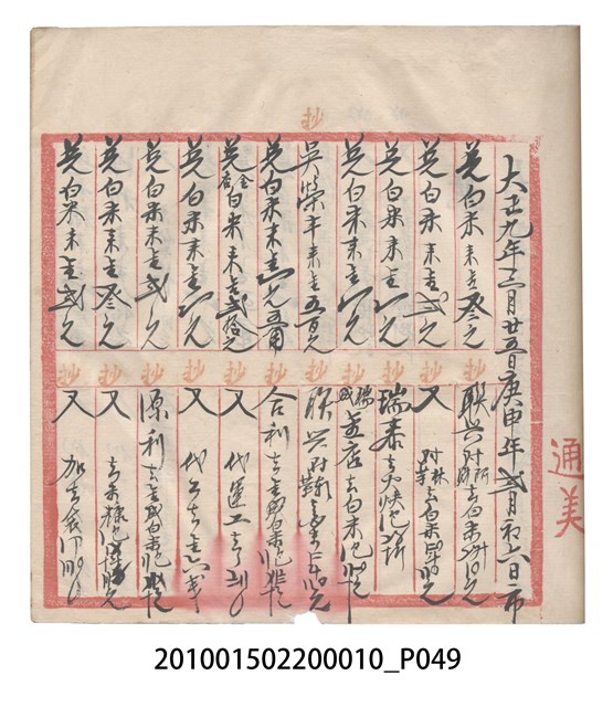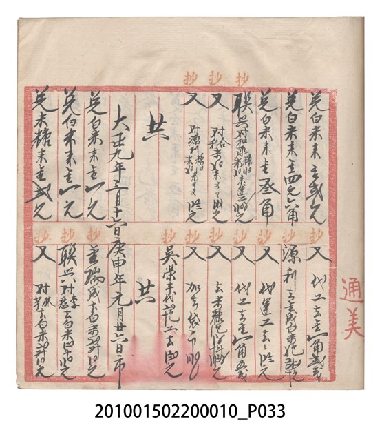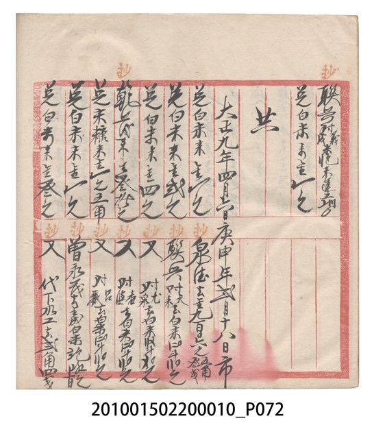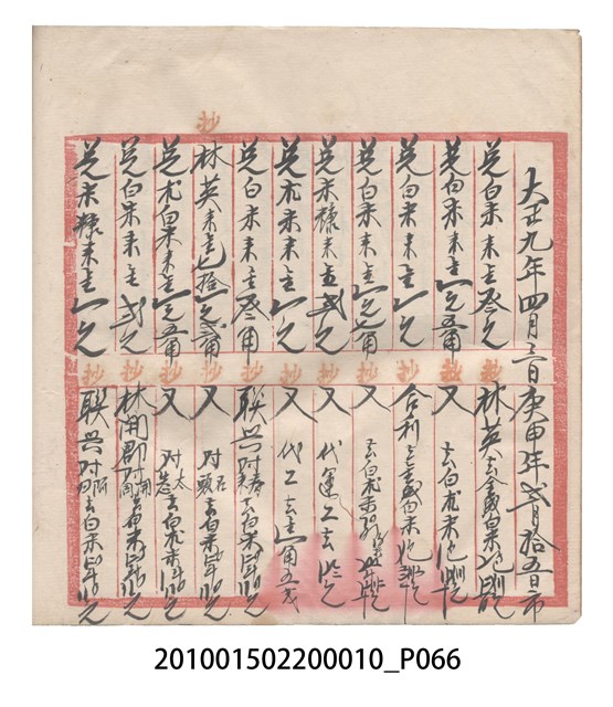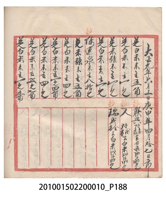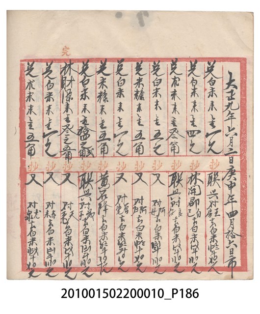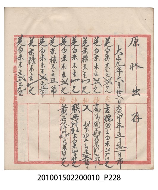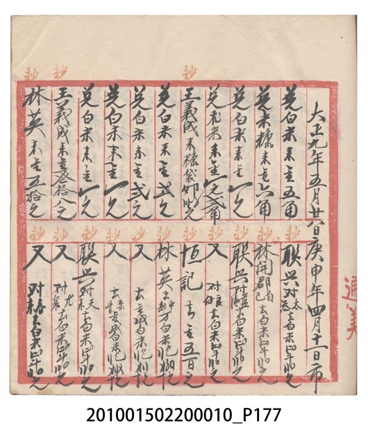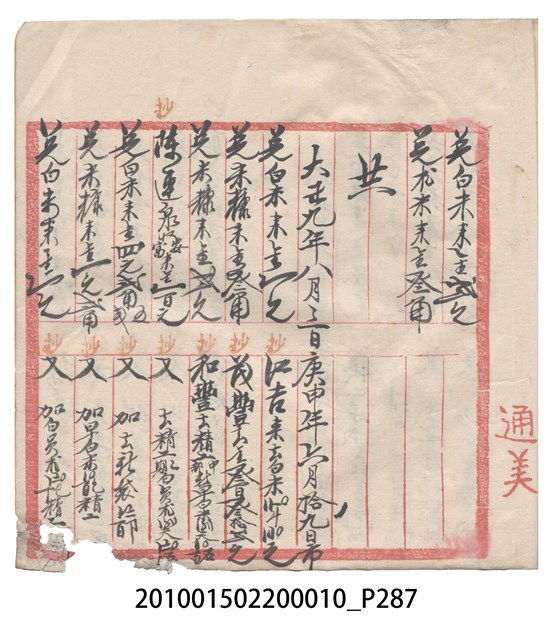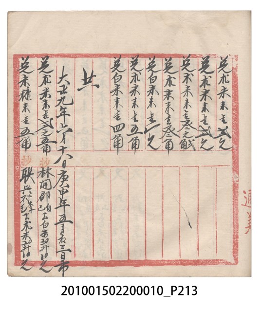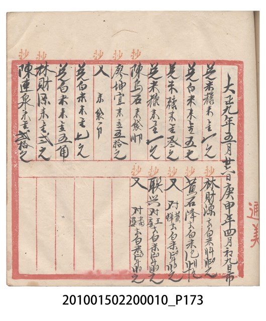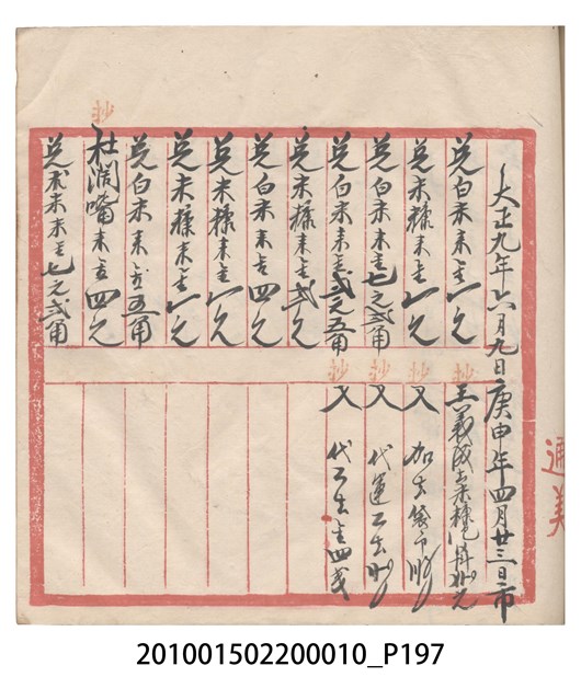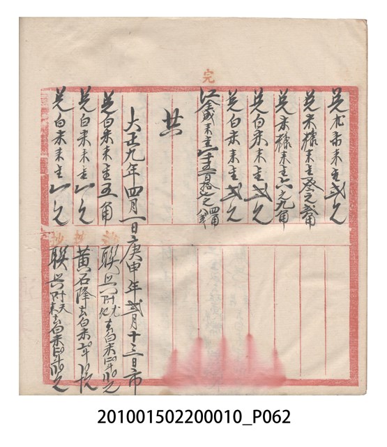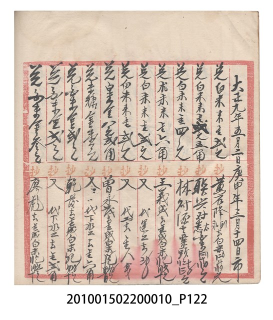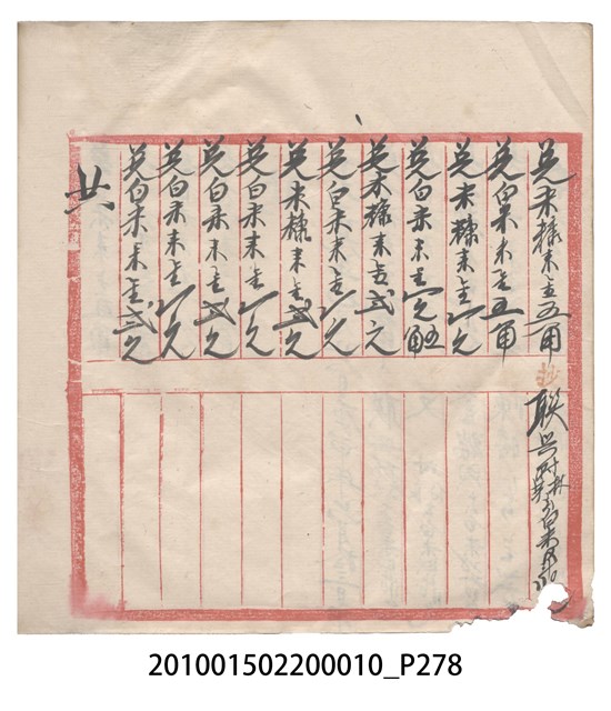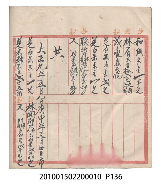 本物件為瑞興大正九年庚申首部日清,該書以棉線裝訂,封面、封底均藍色,封底有蟲蛀破損,頂邊題有瑞興大正九年庚申首部日清字樣,內容涵蓋首行瑞興號大正九年歲次庚申年孟春月立首部日清 承己未年苐叁部日清尾存 大正9年2月20日庚申年元月初一日市上欄共大吉;下欄共大吉。大正9年2月21日庚申年元月初二日市上欄共大吉;下欄支出江和興費用,共吉。大正9年2月22日庚申年元月初三日市上欄收入兌白米費用,共吉;下欄共吉。大正9年2月23日庚申年元月初四日市上欄收入兌白米費用;下欄支出林財源、江和興共吉。大正9年2月24日庚申年元月初五日市上欄收入兌●米、泉德費用;下欄支出拖工費用。大正9年2月25日庚申年元月初六日市上欄收入兌白米、江和興等費用;下欄支出江和興、聯興等費用。大正9年2月26日庚申年元月初七日市上欄收入兌糙米、兌白米、兌米糠費用;下欄支出聯興、吳榮豐、郭成利等費用。大正9年2月28日庚申年元月初九日市上欄收吳榮豐、兌米糠、王義成、兌白米等費用;下欄支出林氏玉燕、聯興等費用。大正9年2月29日庚申年元月初十日市上欄收入兌白米、兌米糠等費用;下欄支出聯興、吳榮豐、林開郡等費用。大正9年8月11日庚申年六月廿七日市上欄收入兌白米、兌米糠等費用;下欄支出林阿嬰、聯興等費用。原收出存。 承過苐弍部日清簿。