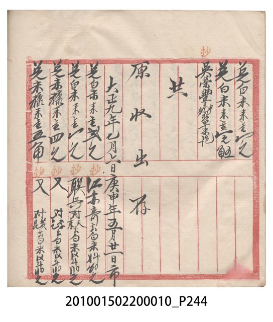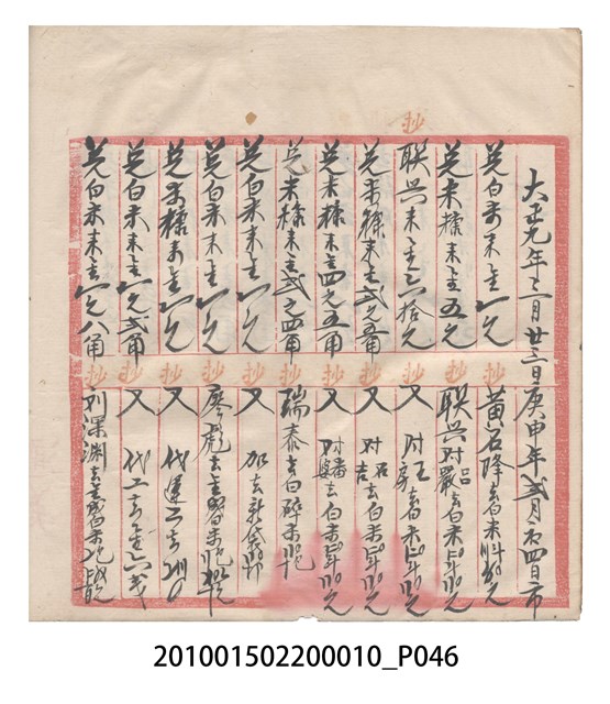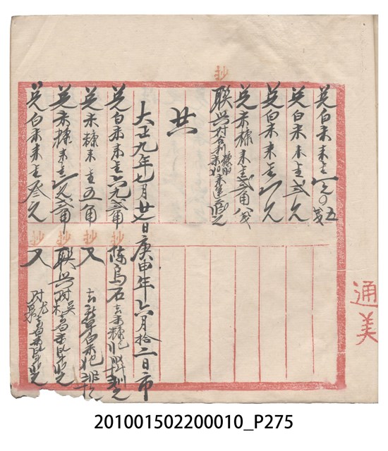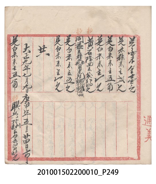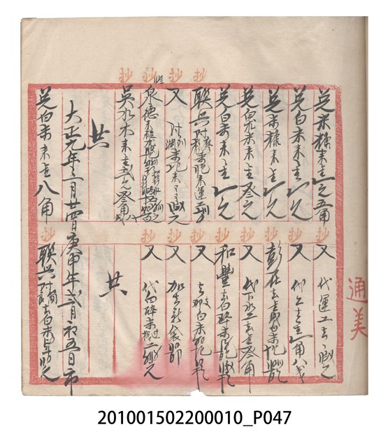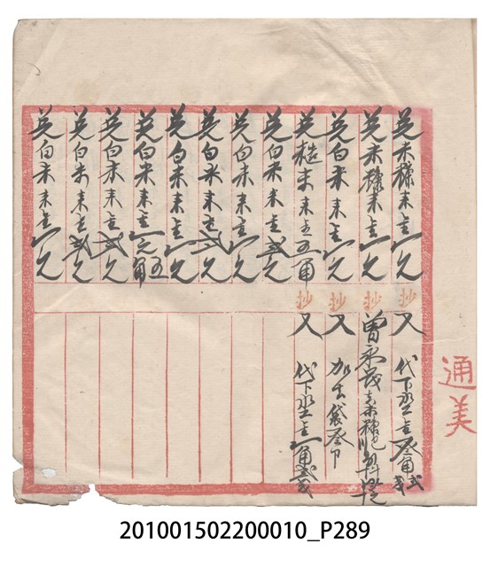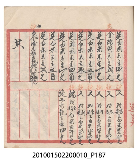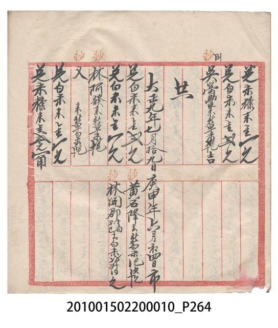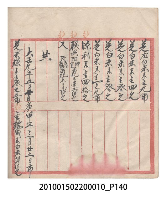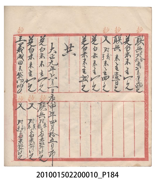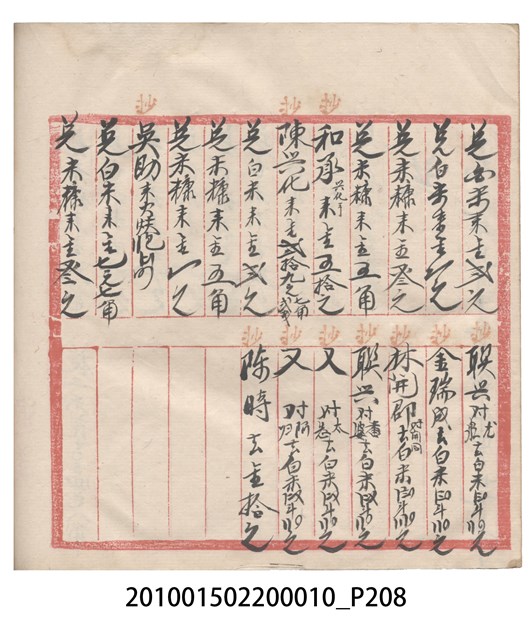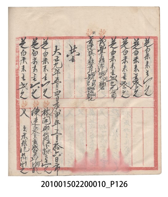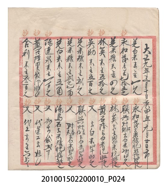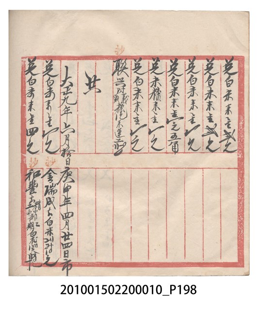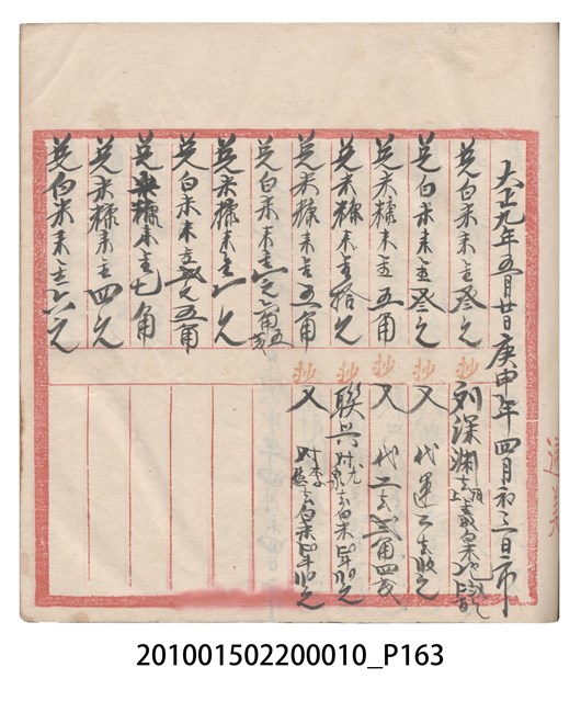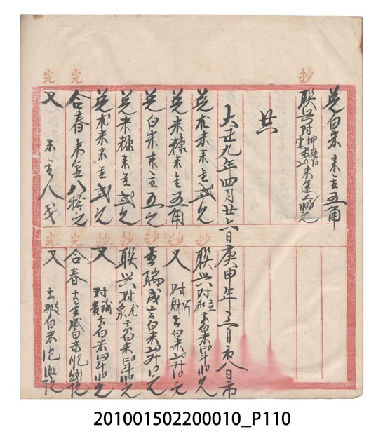 本物件為瑞興大正九年庚申首部日清,該書以棉線裝訂,封面、封底均藍色,封底有蟲蛀破損,頂邊題有瑞興大正九年庚申首部日清字樣,內容涵蓋首行瑞興號大正九年歲次庚申年孟春月立首部日清 承己未年苐叁部日清尾存 大正9年2月20日庚申年元月初一日市上欄共大吉;下欄共大吉。大正9年2月21日庚申年元月初二日市上欄共大吉;下欄支出江和興費用,共吉。大正9年2月22日庚申年元月初三日市上欄收入兌白米費用,共吉;下欄共吉。大正9年2月23日庚申年元月初四日市上欄收入兌白米費用;下欄支出林財源、江和興共吉。大正9年2月24日庚申年元月初五日市上欄收入兌●米、泉德費用;下欄支出拖工費用。大正9年2月25日庚申年元月初六日市上欄收入兌白米、江和興等費用;下欄支出江和興、聯興等費用。大正9年2月26日庚申年元月初七日市上欄收入兌糙米、兌白米、兌米糠費用;下欄支出聯興、吳榮豐、郭成利等費用。大正9年2月28日庚申年元月初九日市上欄收吳榮豐、兌米糠、王義成、兌白米等費用;下欄支出林氏玉燕、聯興等費用。大正9年2月29日庚申年元月初十日市上欄收入兌白米、兌米糠等費用;下欄支出聯興、吳榮豐、林開郡等費用。大正9年8月11日庚申年六月廿七日市上欄收入兌白米、兌米糠等費用;下欄支出林阿嬰、聯興等費用。原收出存。 承過苐弍部日清簿。