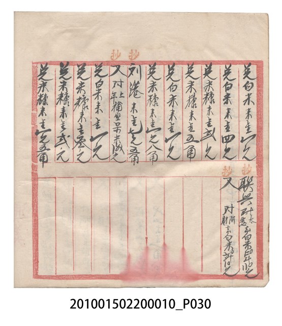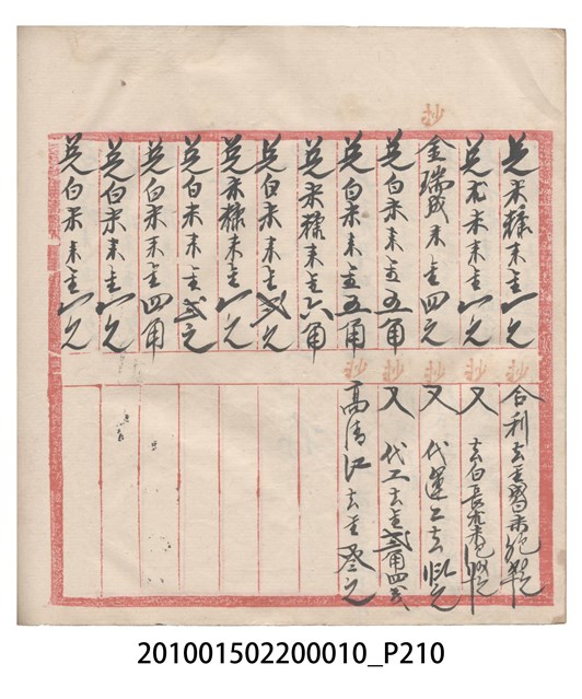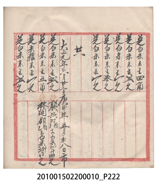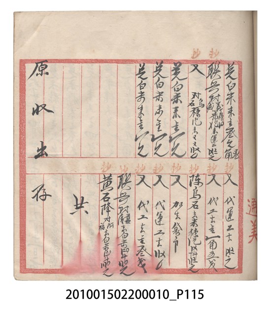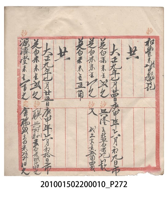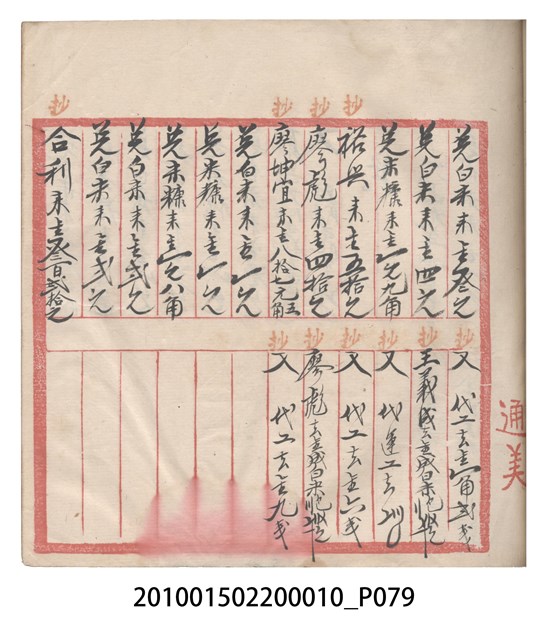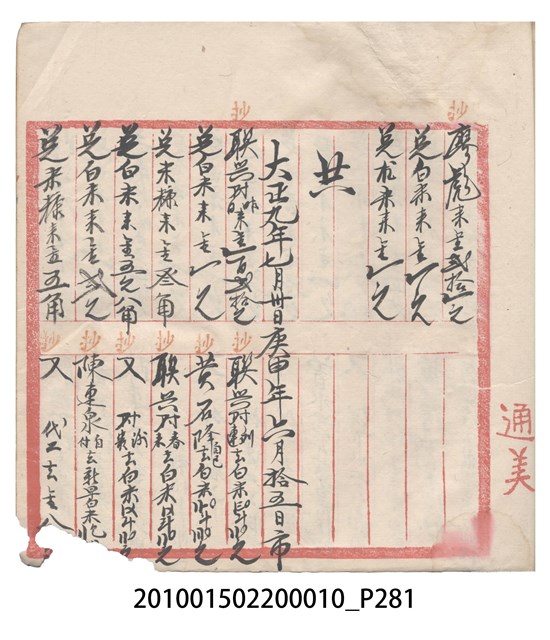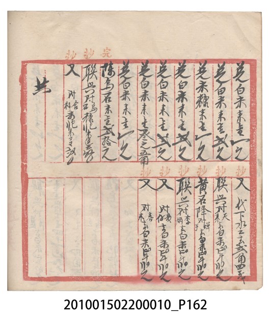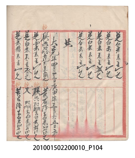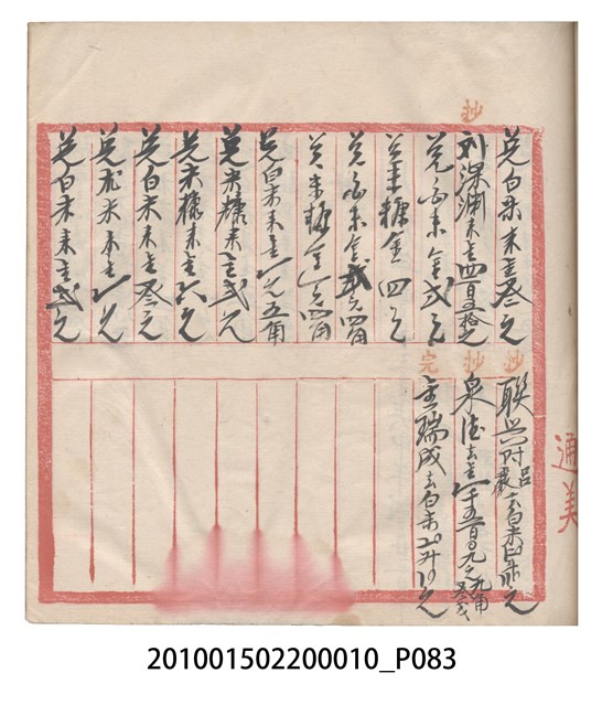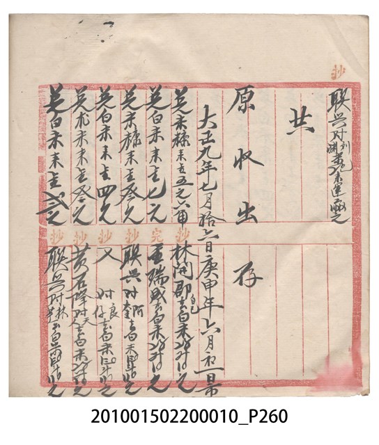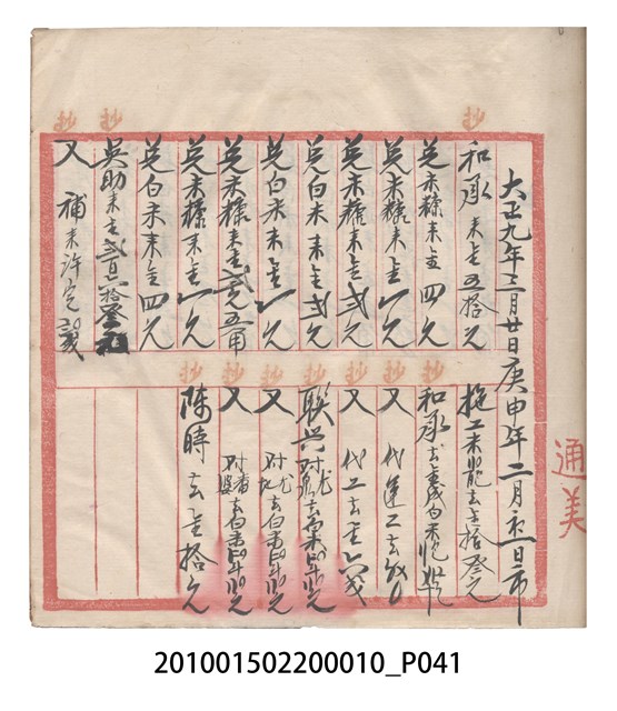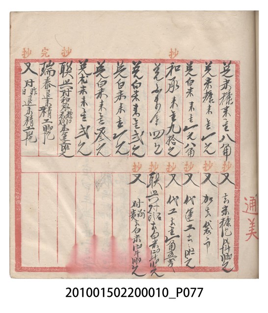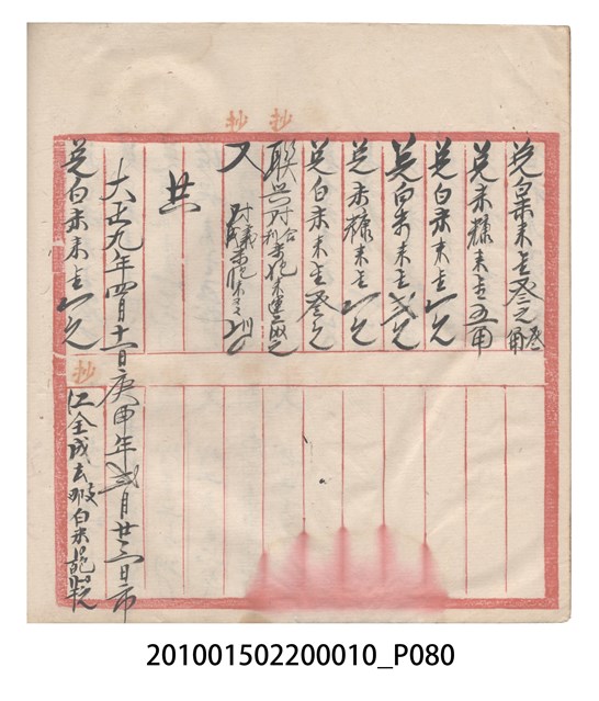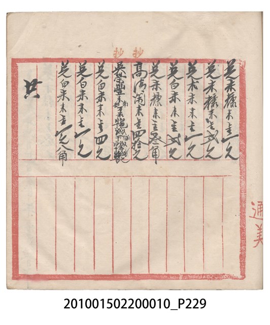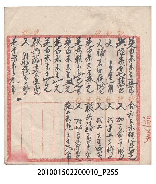 本物件為瑞興大正九年庚申首部日清,該書以棉線裝訂,封面、封底均藍色,封底有蟲蛀破損,頂邊題有瑞興大正九年庚申首部日清字樣,內容涵蓋首行瑞興號大正九年歲次庚申年孟春月立首部日清 承己未年苐叁部日清尾存 大正9年2月20日庚申年元月初一日市上欄共大吉;下欄共大吉。大正9年2月21日庚申年元月初二日市上欄共大吉;下欄支出江和興費用,共吉。大正9年2月22日庚申年元月初三日市上欄收入兌白米費用,共吉;下欄共吉。大正9年2月23日庚申年元月初四日市上欄收入兌白米費用;下欄支出林財源、江和興共吉。大正9年2月24日庚申年元月初五日市上欄收入兌●米、泉德費用;下欄支出拖工費用。大正9年2月25日庚申年元月初六日市上欄收入兌白米、江和興等費用;下欄支出江和興、聯興等費用。大正9年2月26日庚申年元月初七日市上欄收入兌糙米、兌白米、兌米糠費用;下欄支出聯興、吳榮豐、郭成利等費用。大正9年2月28日庚申年元月初九日市上欄收吳榮豐、兌米糠、王義成、兌白米等費用;下欄支出林氏玉燕、聯興等費用。大正9年2月29日庚申年元月初十日市上欄收入兌白米、兌米糠等費用;下欄支出聯興、吳榮豐、林開郡等費用。大正9年8月11日庚申年六月廿七日市上欄收入兌白米、兌米糠等費用;下欄支出林阿嬰、聯興等費用。原收出存。 承過苐弍部日清簿。